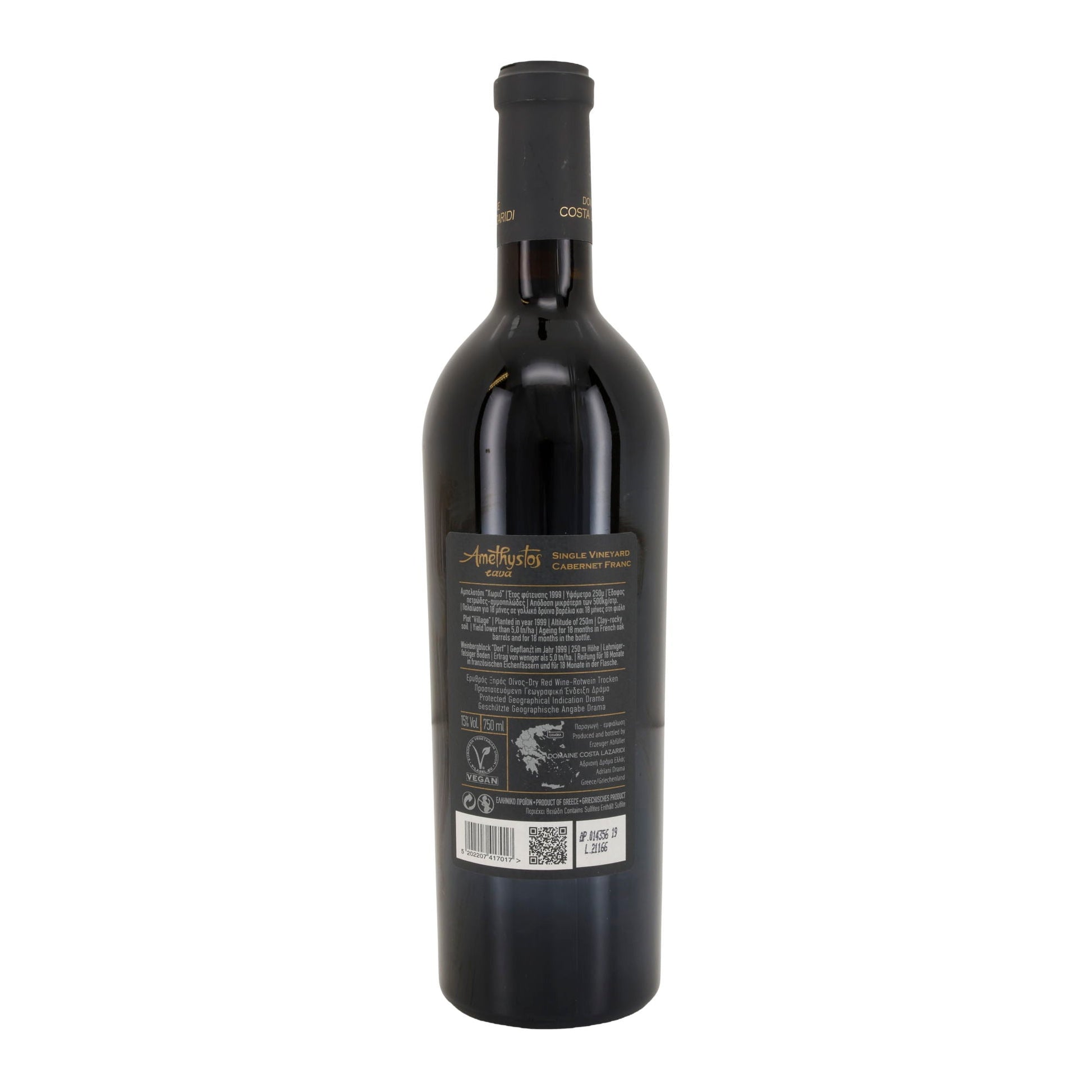 Der Amethystos Cava Rotwein stammt aus der Region Drama in Nordgriechenland und wird aus der Rebsorte Cabernet Franc hergestellt. Er ist ein Beispiel für die hohe Qualität und das Potenzial griechischer Weine.