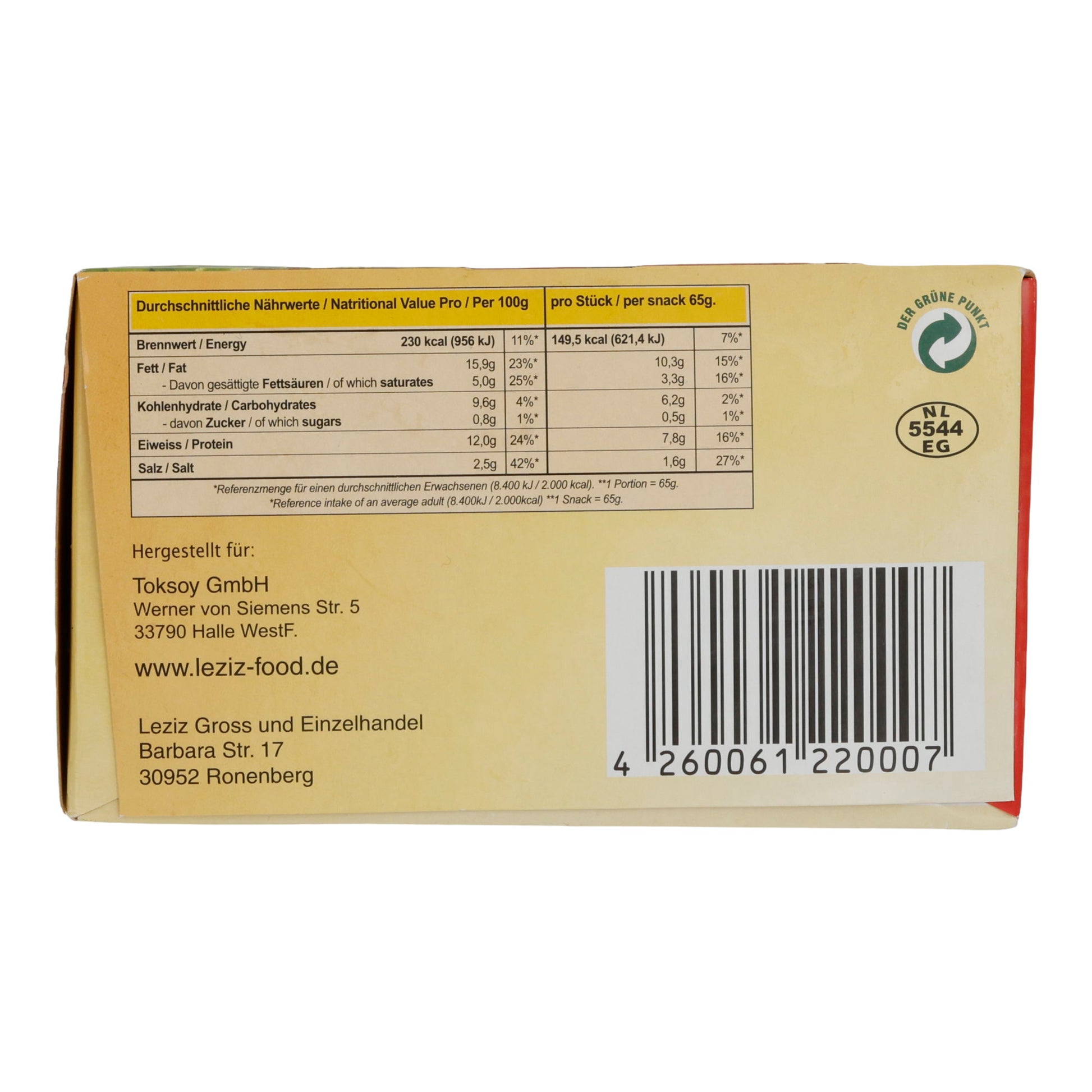• Füllung 46 % (Zwiebeln, Walnüsse, Petersilie, Pflanzenöl, Salz, Paprikamark, Gewürze)