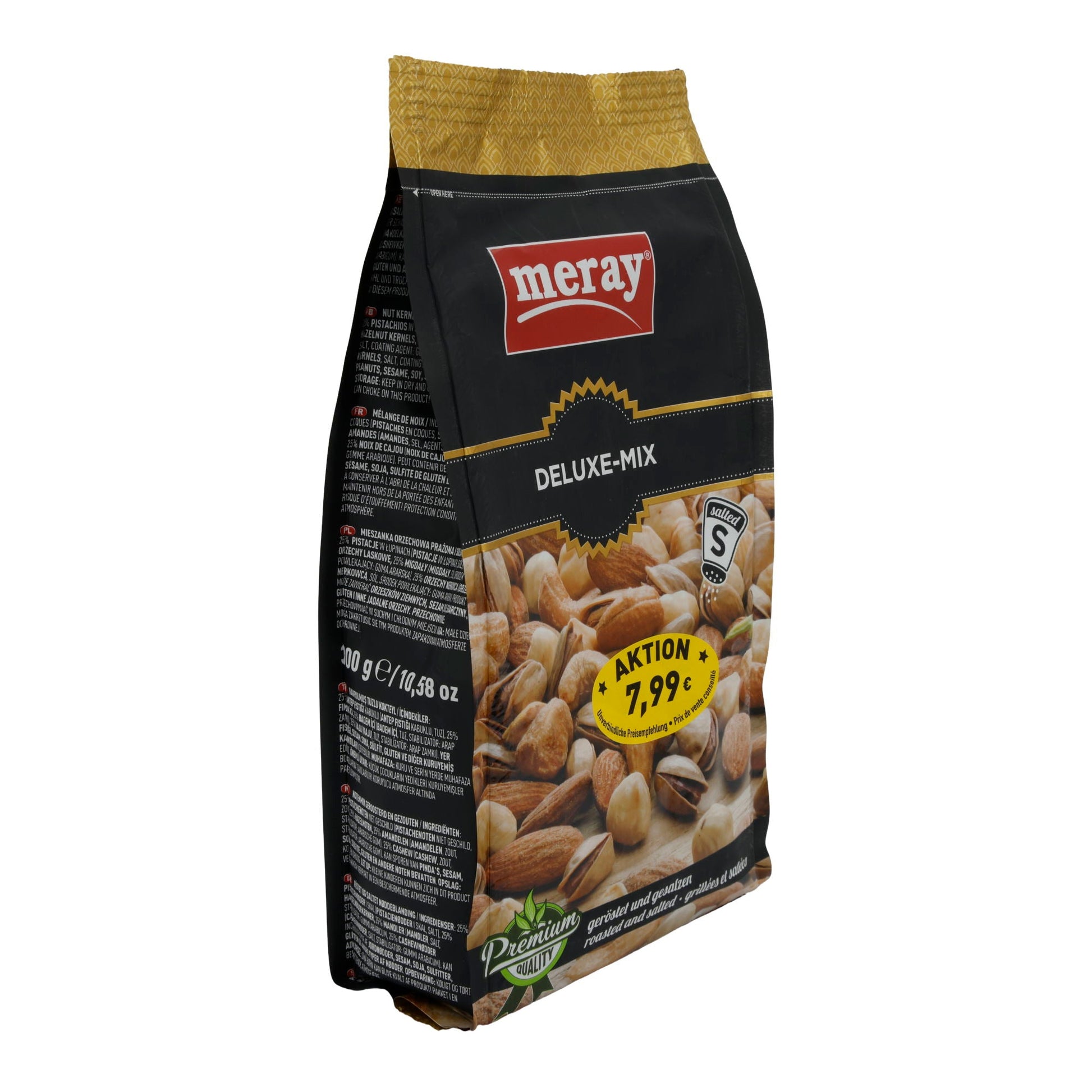 Deluxe-Mix Meray | Nussmischung | Geröstet und gesalzen | 300 g bietet Ihnen eine exquisite Auswahl an hochwertigen Nüssen, perfekt geröstet und fein gesalzen.