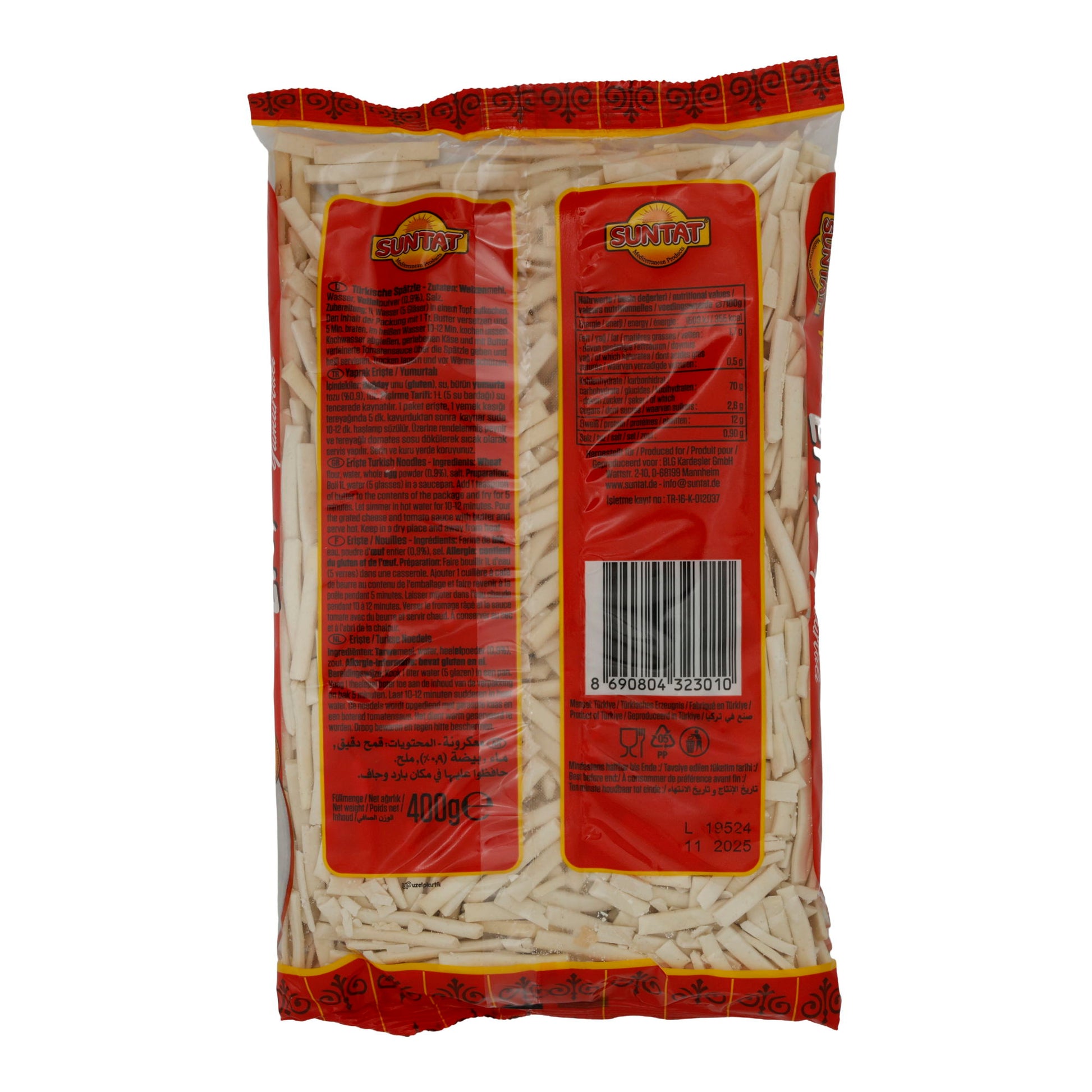Suntat Yaprak Erişte sind vielseitig einsetzbare türkische Eiernudeln, die sich hervorragend für herzhafte Gerichte eignen. Sie können als Beilage zu Fleischgerichten, in Suppen oder als Hauptgericht mit Gemüse und Joghurtsoße serviert werden.