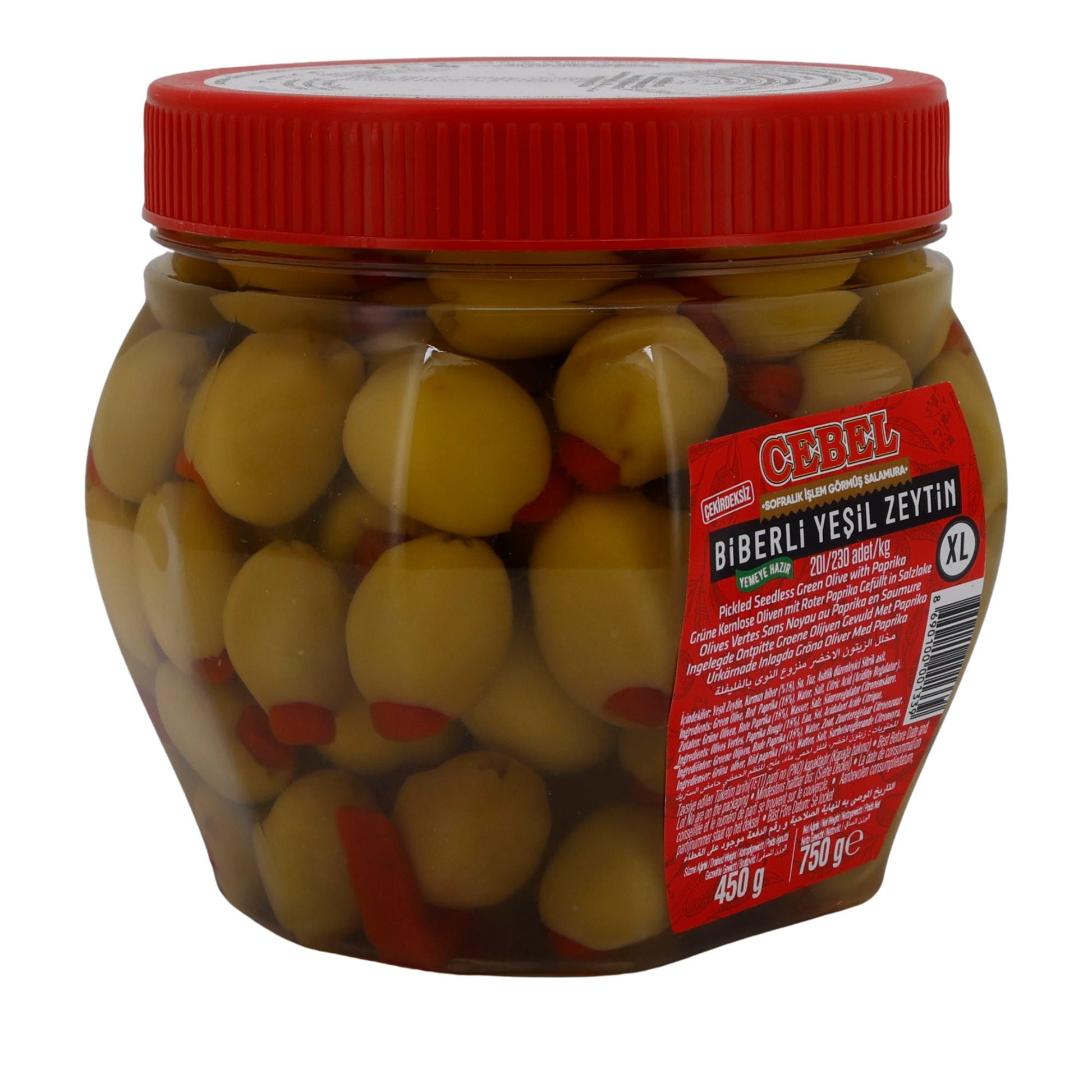Grüne Oliven Cebel mit roter Paprika sind verzehrfertig und ideal für Antipasti-Platten, Salate oder als Snack. Sie können direkt aus dem Glas genossen werden oder als Zutat in verschiedenen Gerichten verwendet werden.