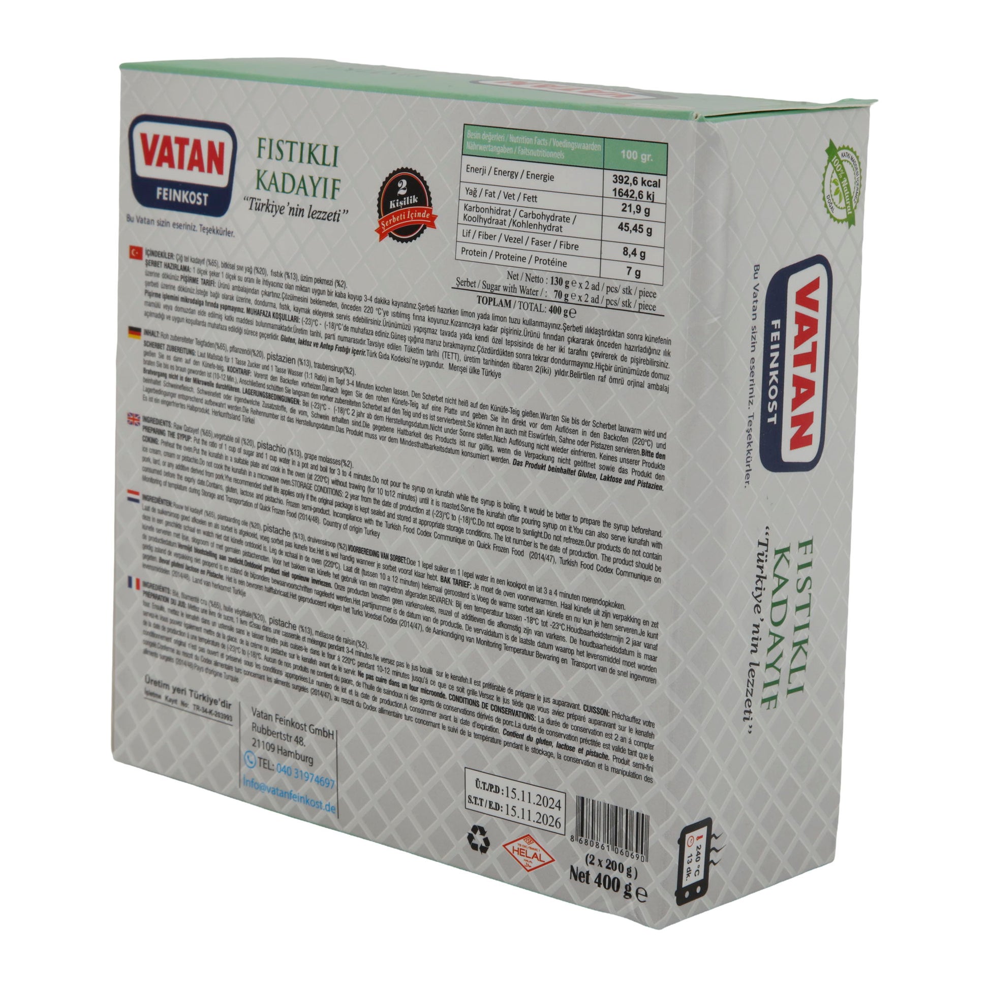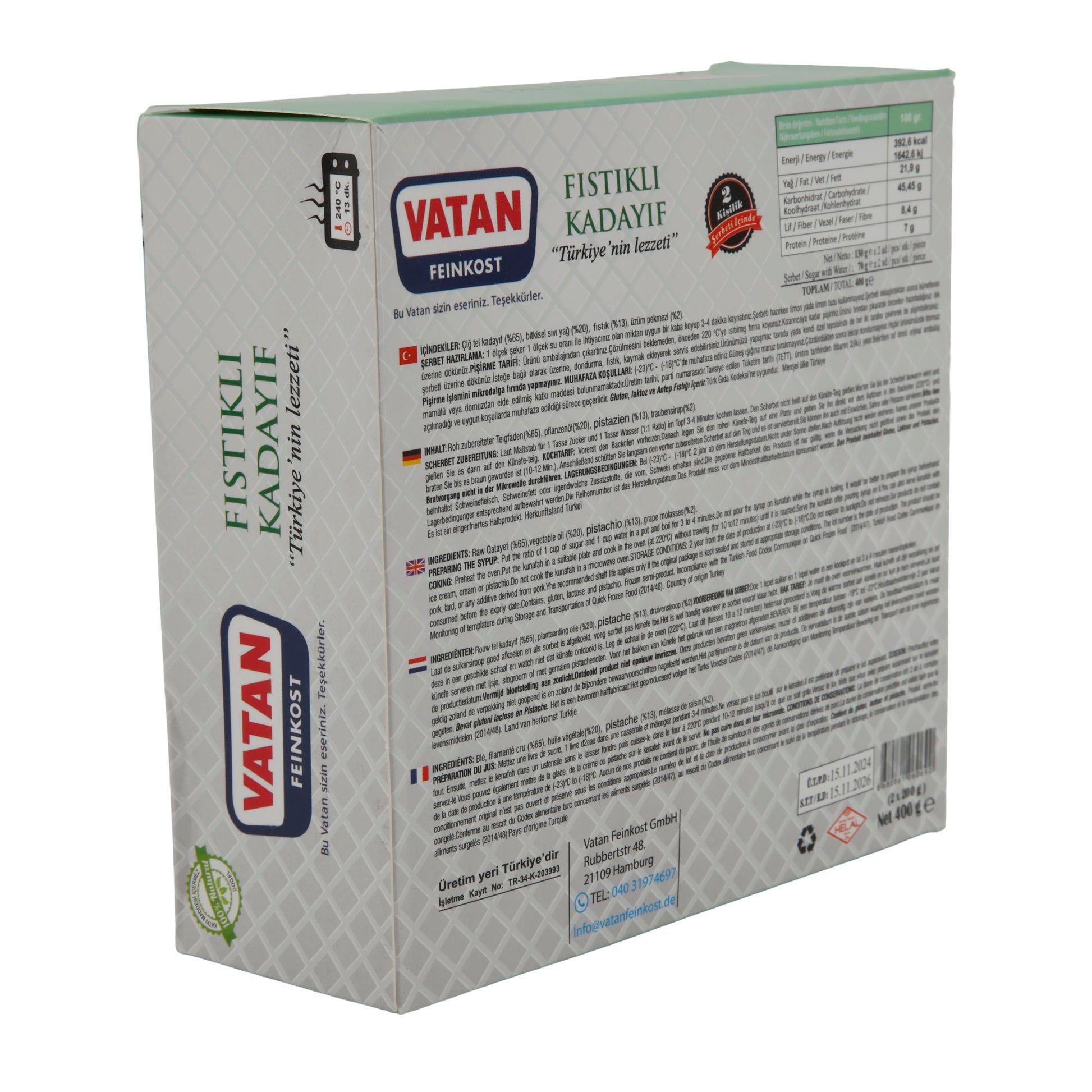 Bestellen Sie jetzt und erleben Sie den unvergleichlichen Geschmack von VATAN Kadayıf mit Pistazien. Entdecken Sie weitere Premium Lebensmittel.