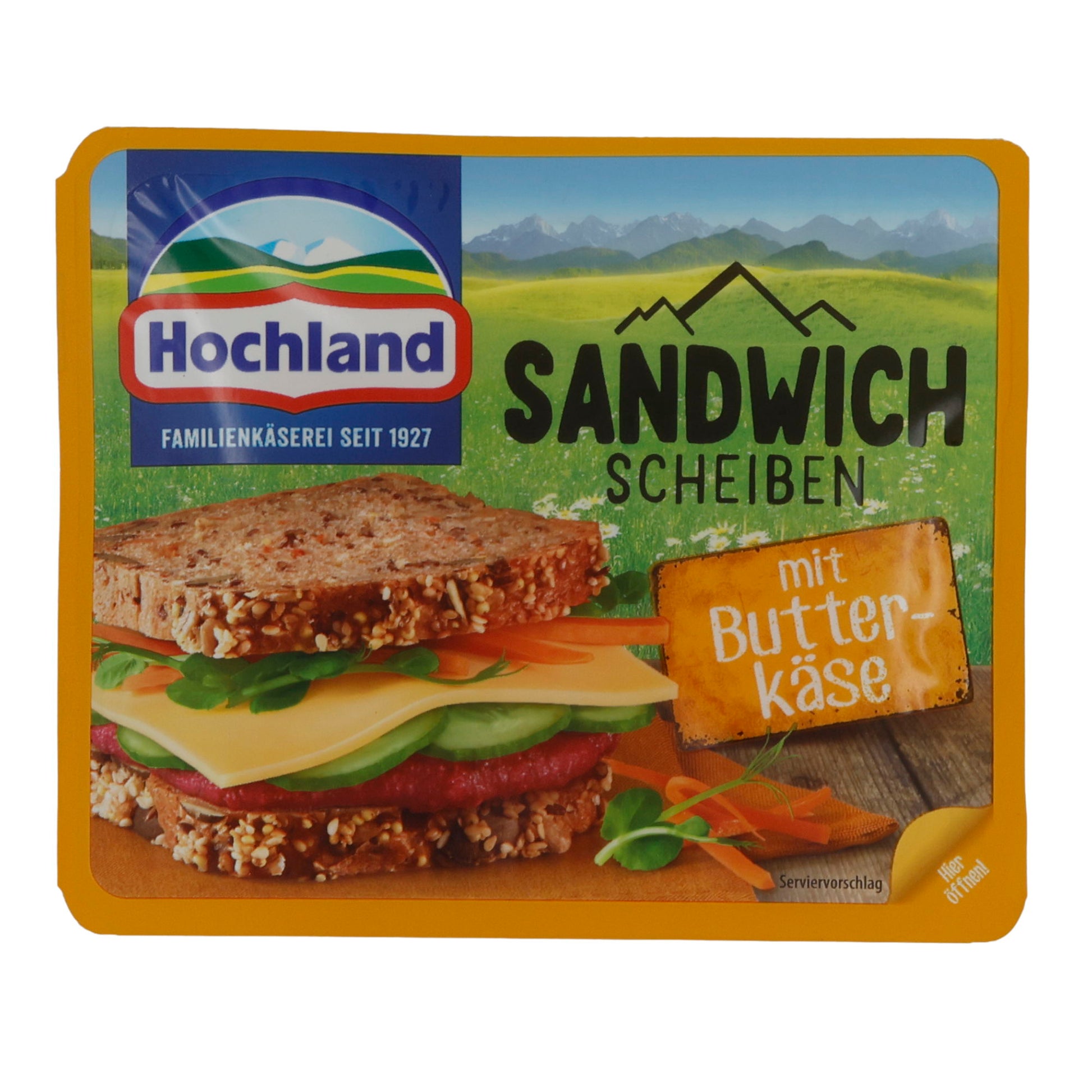 Käsescheiben Hochland Sandwich Scheiben mit Butterkäse liefert cremigen Genuss für Ihre Sandwiches und Snacks.