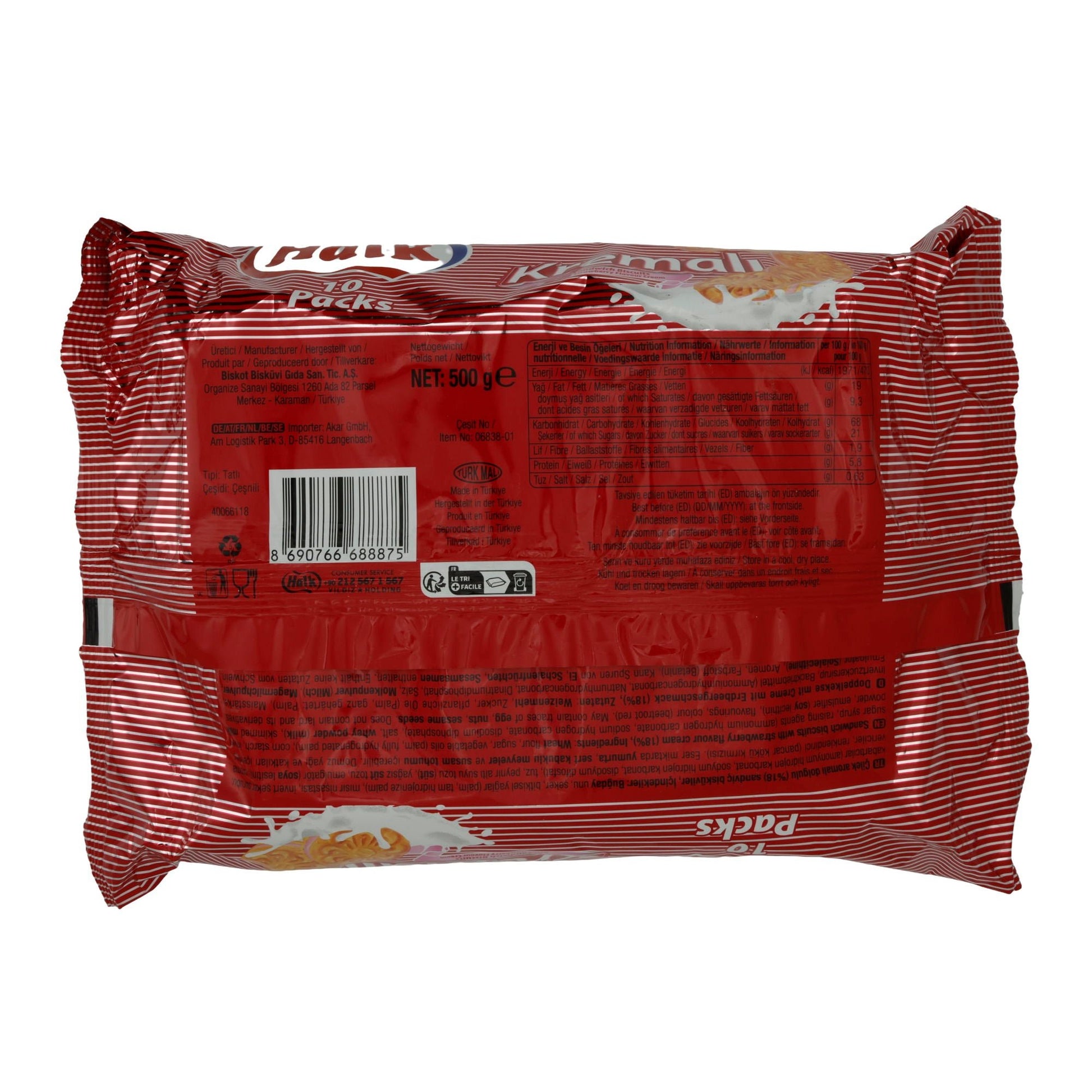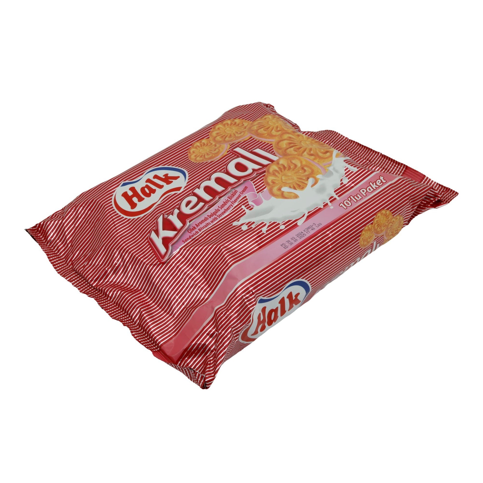 Sandwichkekse Halk Kremalı mit Erdbeercreme sind fertig zum Verzehr und ideal als Snack zwischendurch, zum Kaffee oder Tee sowie als süßer Nachtisch geeignet.
