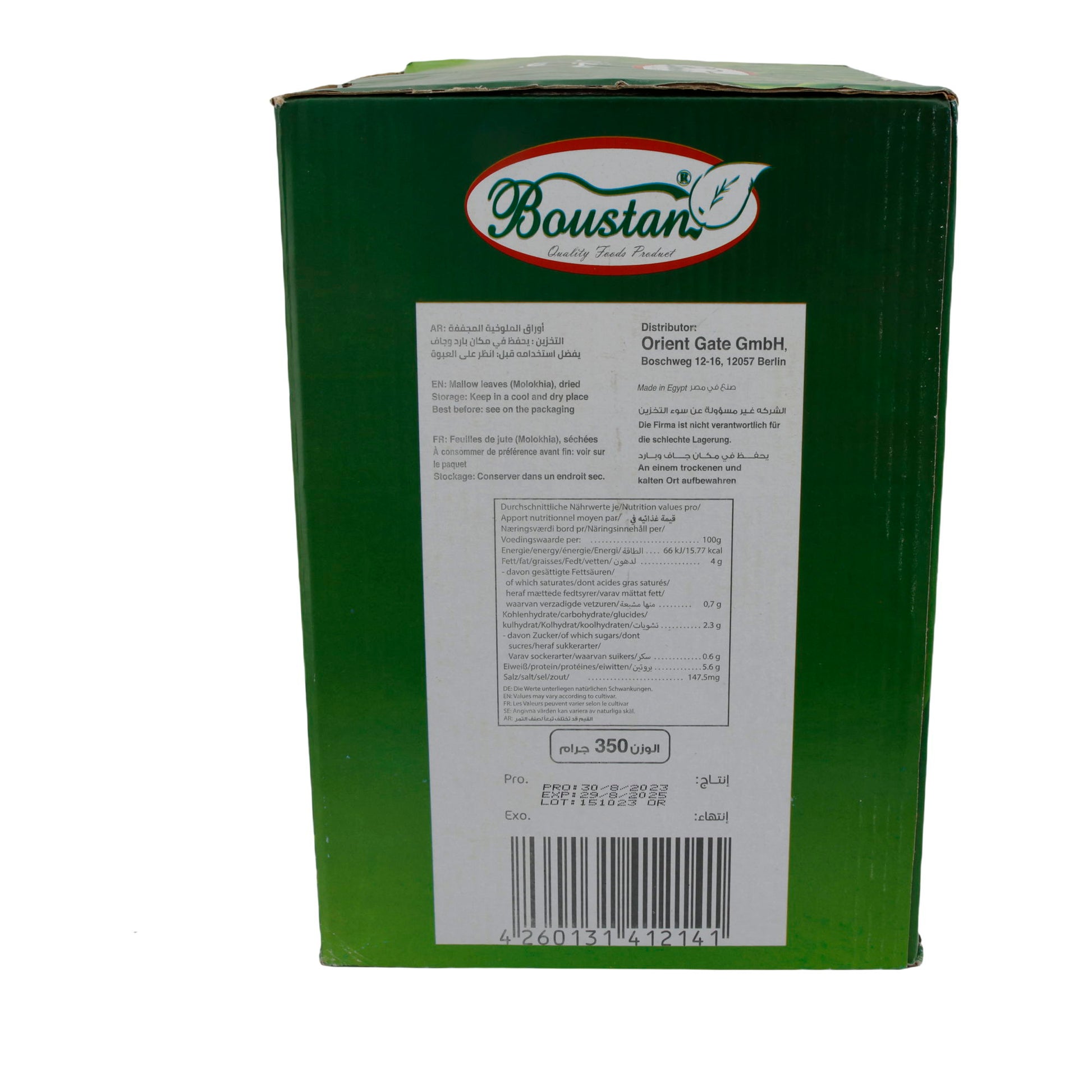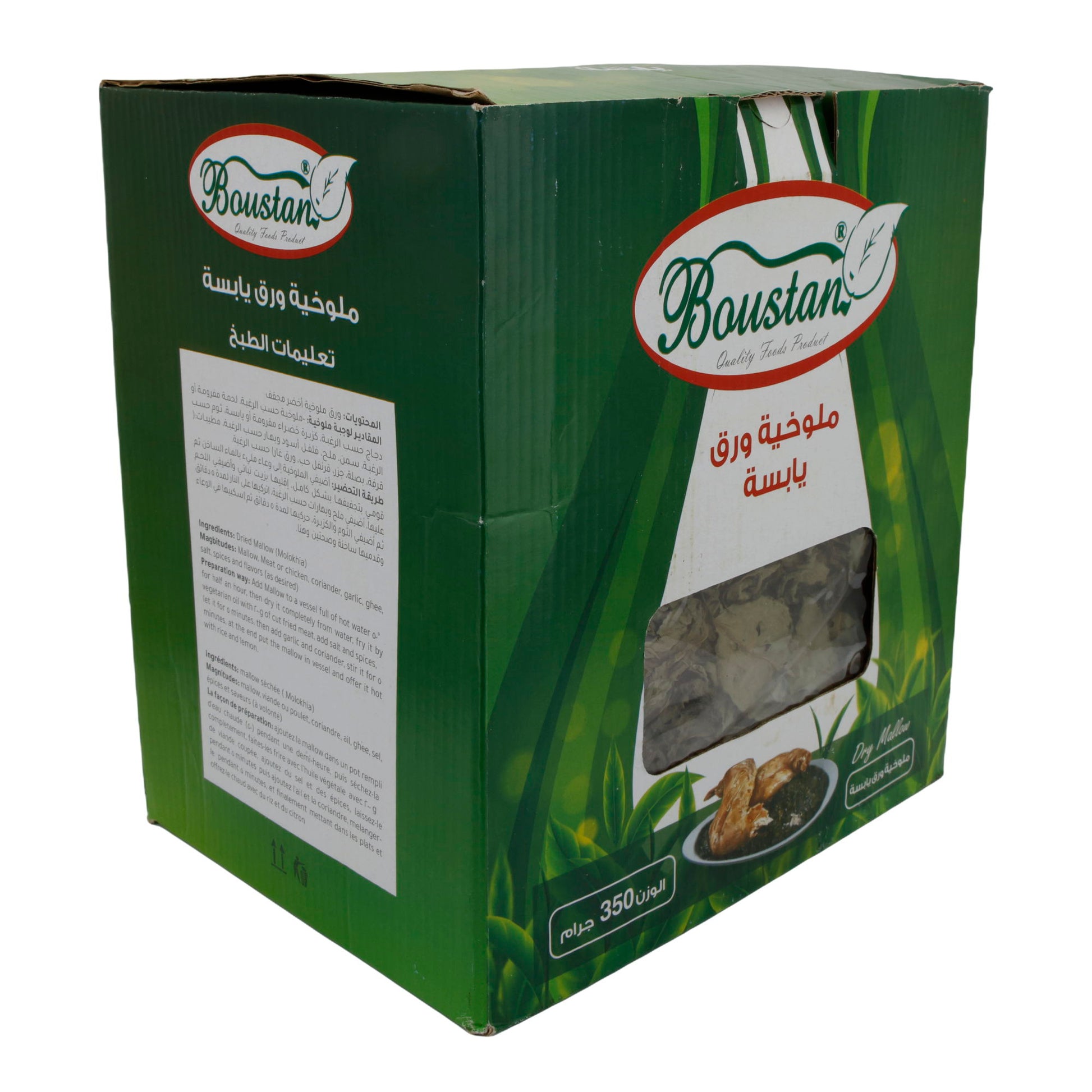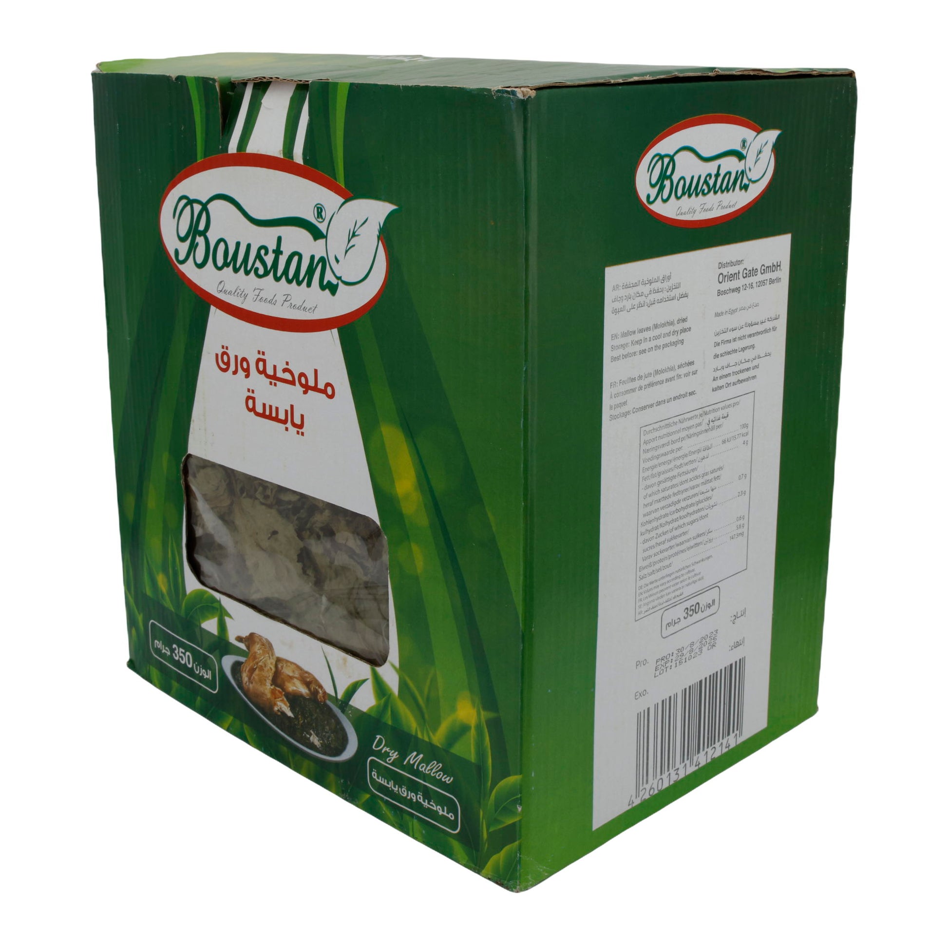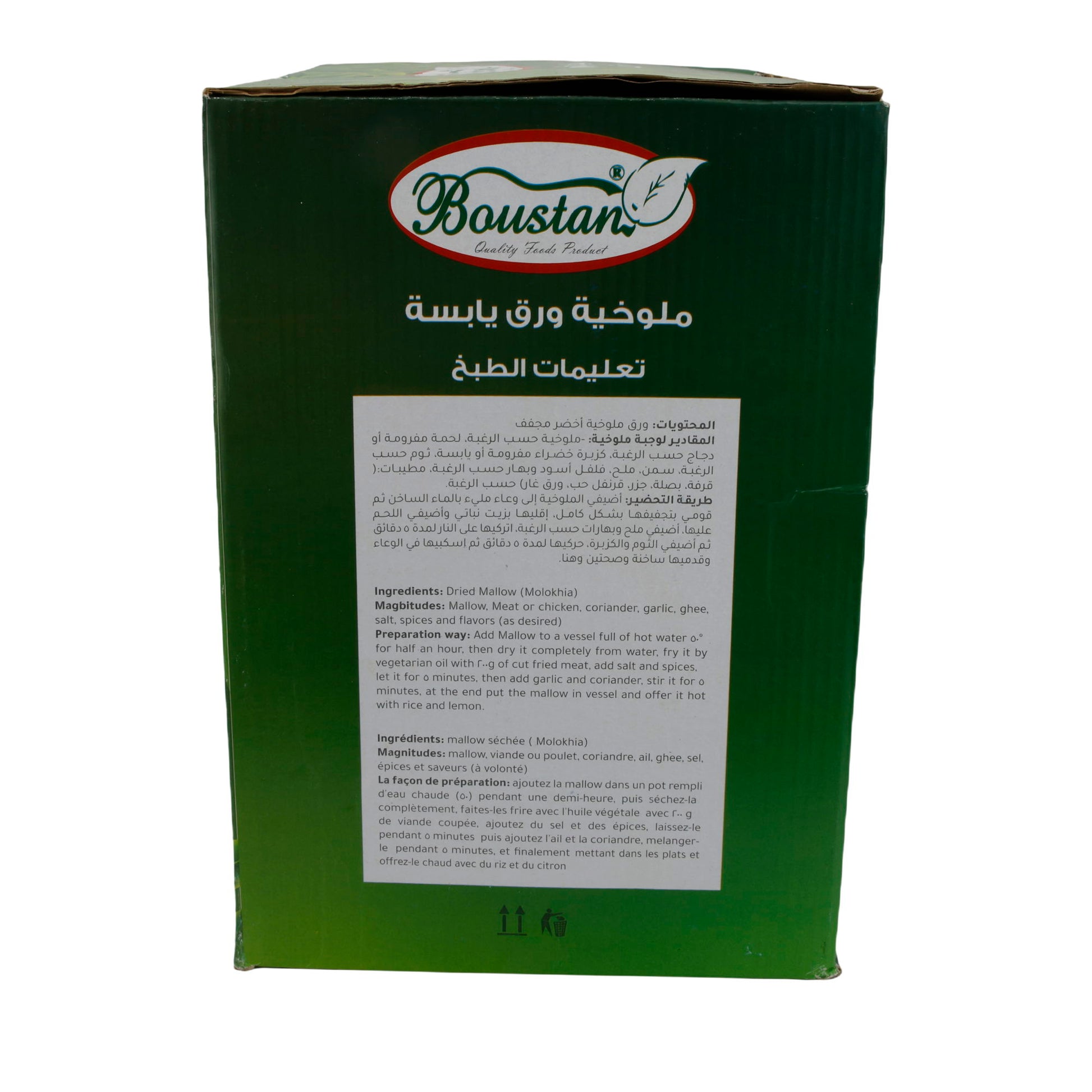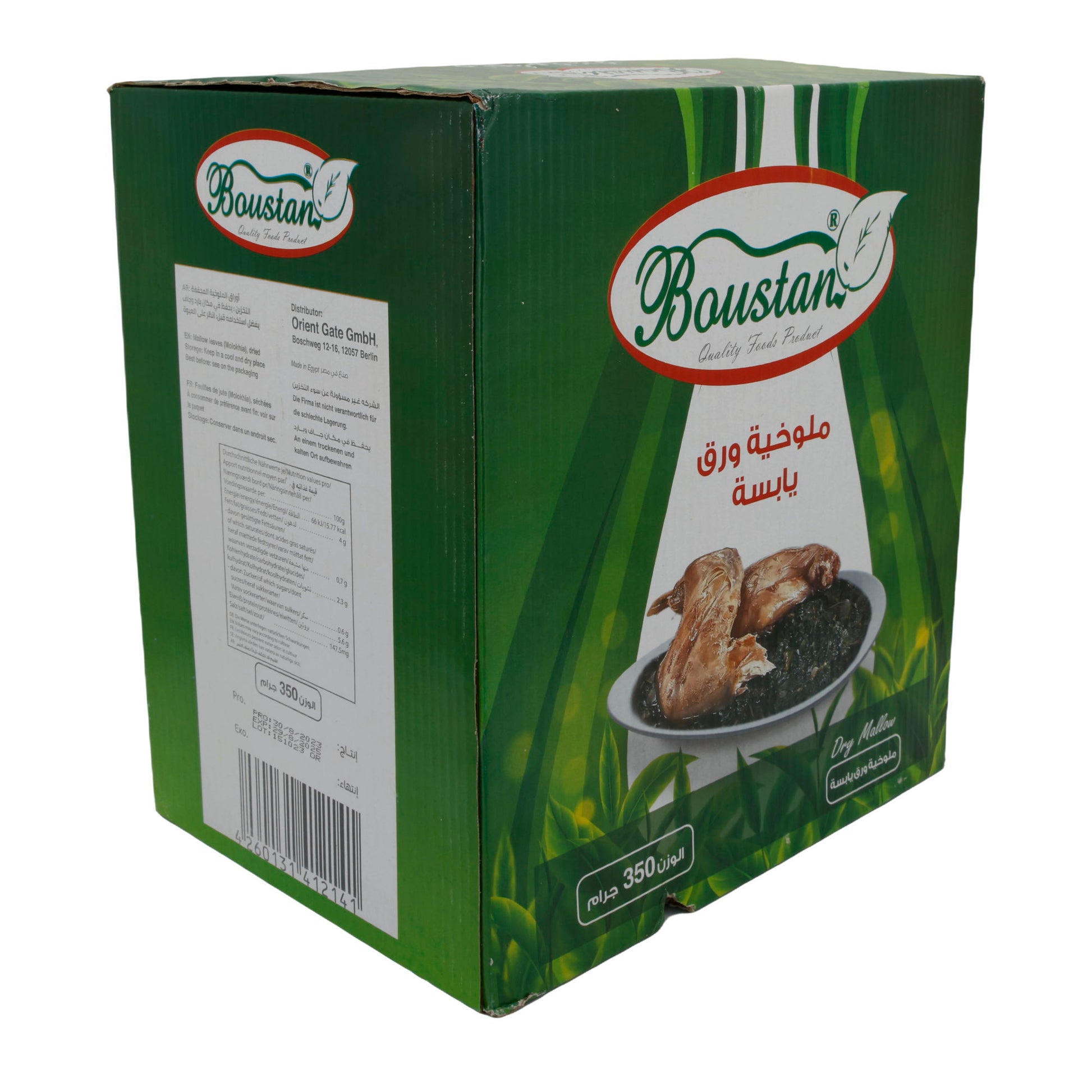 Molokhia-Blätter Boustan sind halal-zertifiziert, vegan und haben eine lange Haltbarkeit von bis zu 24 Monaten bei Zimmertemperatur. Sie stammen von der Langkapsligen Jute und sind eine hochwertige, vielseitige Zutat für authentische Gerichte aus dem Nahen Osten und Nordafrika.