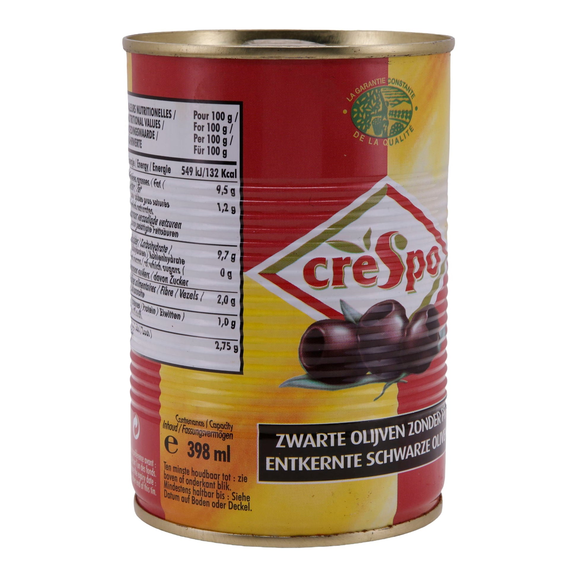 Schwarze Oliven Crespo sind entkernt und verzehrfertig, was die Zubereitung erleichtert. Sie haben eine gleichmäßige schwarze Farbe und eine feste, aber nicht harte Konsistenz. Ihr milder Geschmack ist das Ergebnis der Reifung und der Einlage in Salzlake, die Bitterstoffe reduziert.