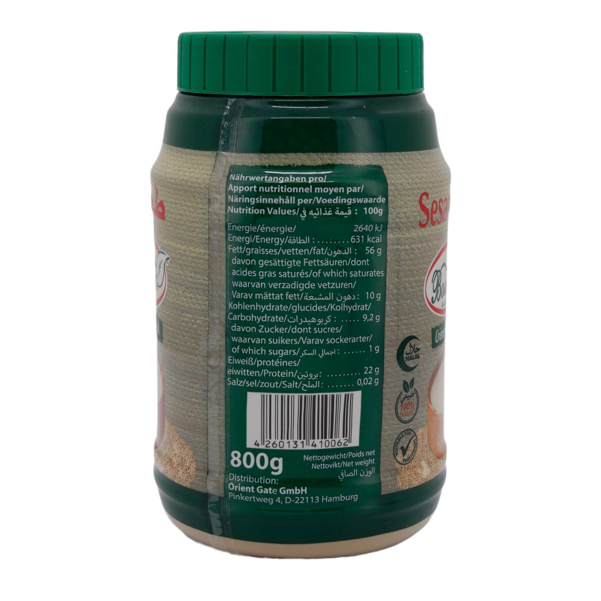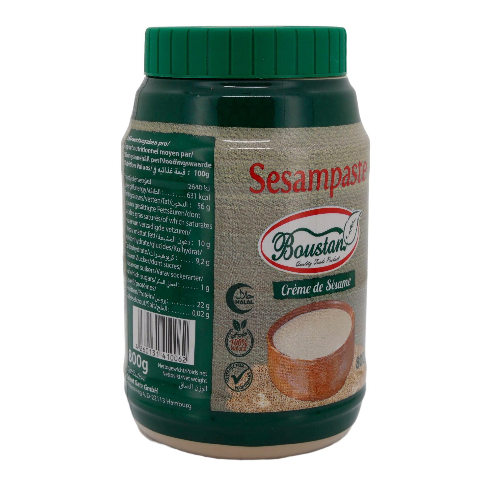 Sesampaste Boustan zeichnet sich durch ihren intensiven, nussigen Geschmack und ihre cremige Konsistenz aus. Sie wird aus 100 % fein gemahlenen, gerösteten Sesamkörnern hergestellt und ist ein Grundnahrungsmittel in der orientalischen Küche.