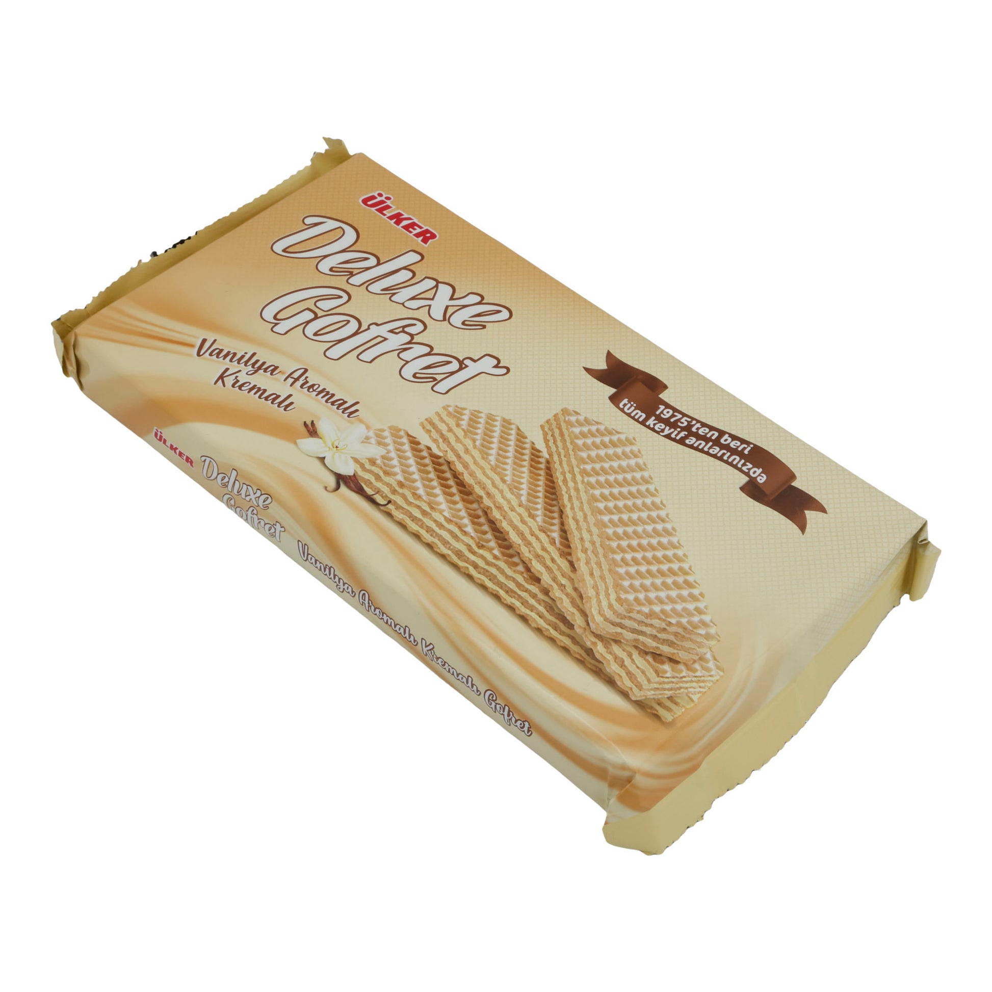 Ülker Deluxe Gofret mit Vanillecreme ist verzehrfertig und ideal als süßer Snack, zum Kaffee oder Tee, als Dessert oder als Beilage zu Eis geeignet.