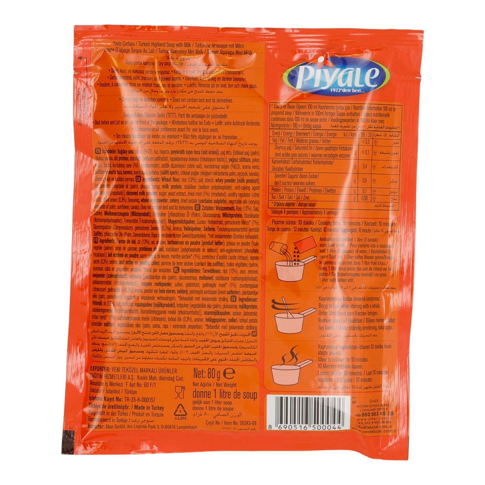 Die Piyale Yayla Çorbası ist eine traditionelle türkische Almsuppe mit Milch, verfeinert mit Joghurt, Reis und aromatischen Kräutern wie Minze. Sie ist angenehm mild, cremig und in nur 10 Minuten servierfertig. Die perfekte Wahl für eine wärmende Mahlzeit mit authentischem Geschmack. Eine Packung ergibt 1 Liter Suppe – ideal für 4 Portionen.