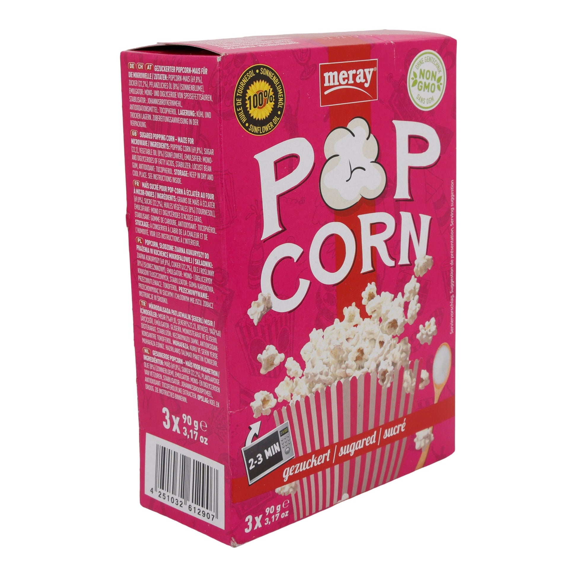 Das zuckrige Mikrowellen-Popcorn von Meray zeichnet sich durch seine einfache Zubereitung und den süßen Geschmack aus. Es wird mit Sonnenblumenöl hergestellt, was für einen milden Geschmack sorgt und keine zusätzlichen Zutaten erfordert.