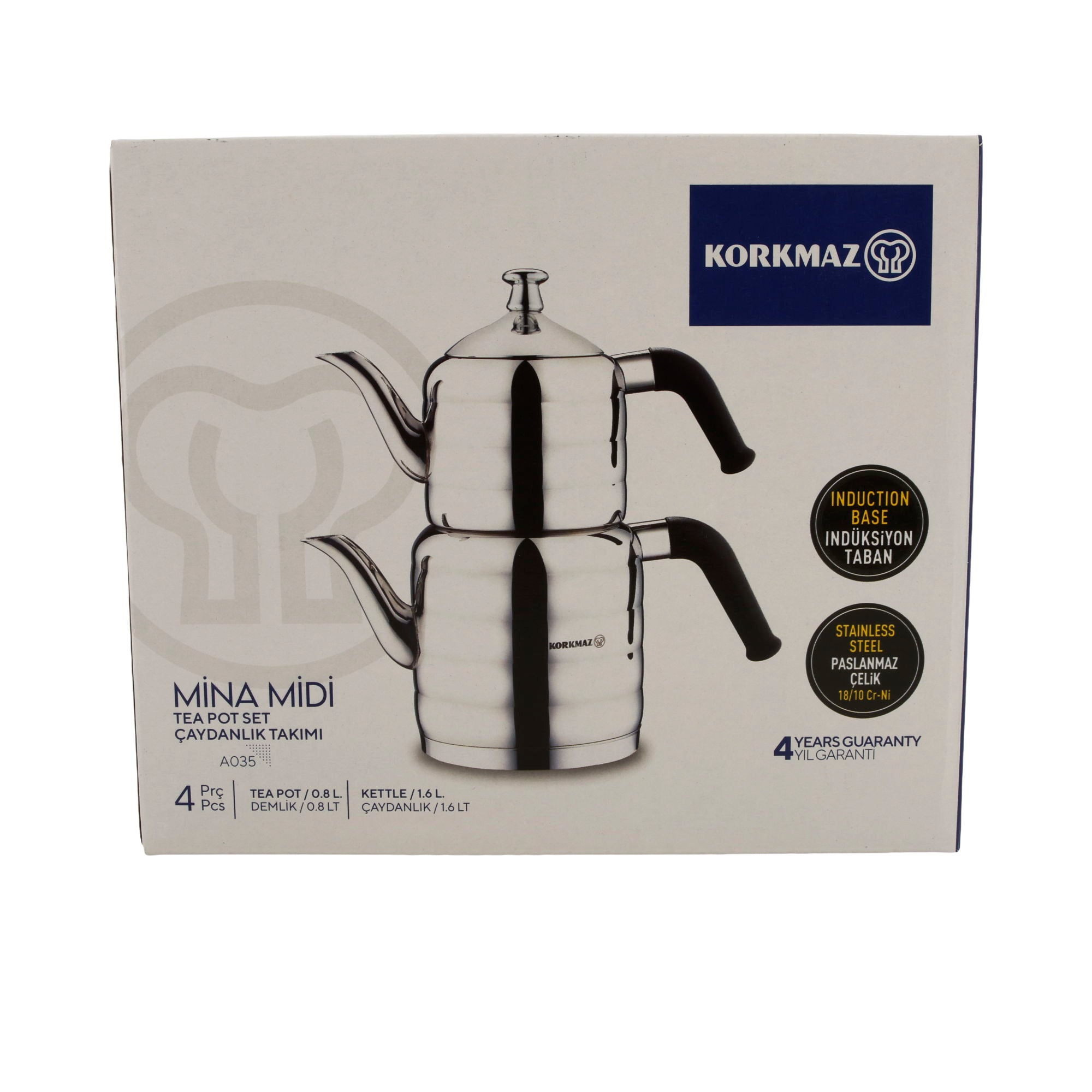 Korkmaz Mina Midi Teekannen-Set A035 | 18/10 Edelstahl | Induktionsgeeignet | 4-teilig (0,8 L + 1,6 L)