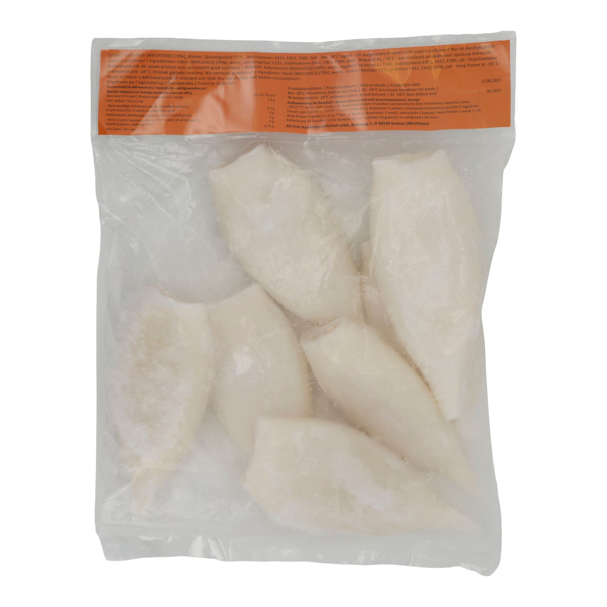 Tuben vom Kalmar (Illex argentinus), Wasser, Stabilisatoren: E451, E452, Säureregulator: E330