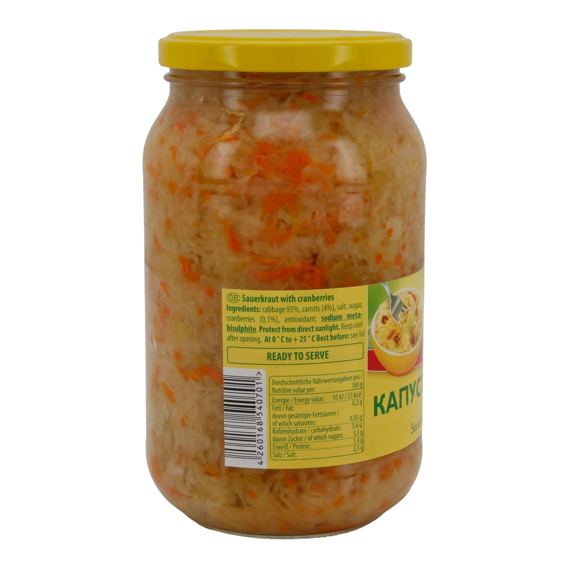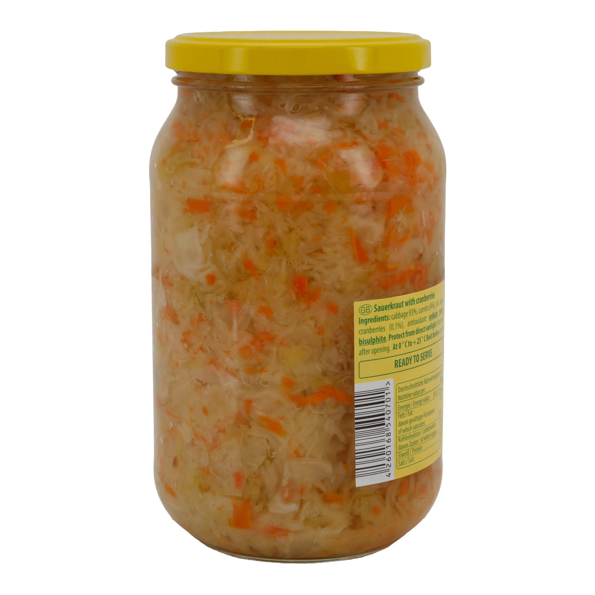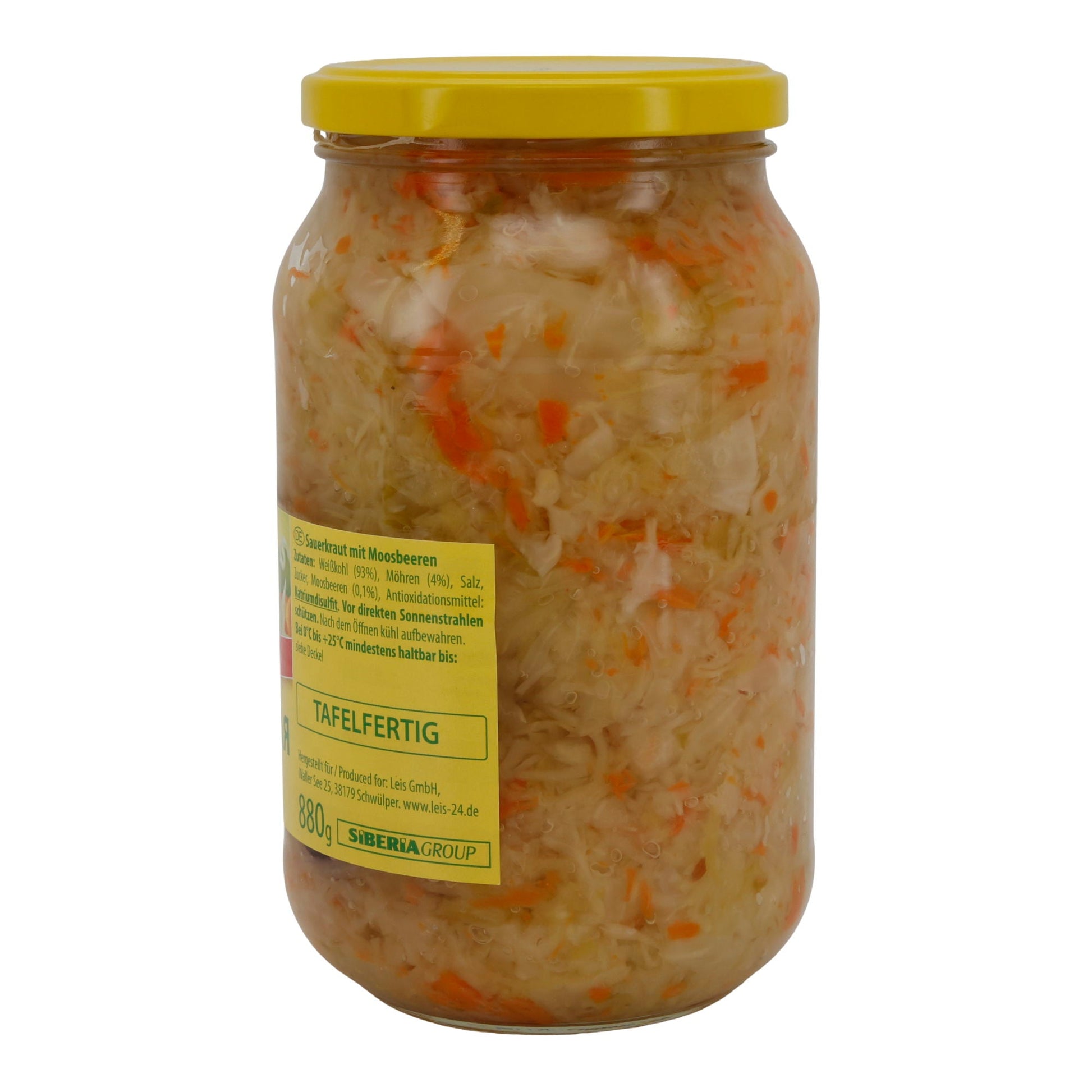 Dieses Sauerkraut zeichnet sich durch die Kombination aus Weißkohl, Karotten und Moosbeeren aus. Es ist reich an Vitamin C und enthält keine künstlichen Aromen, was es zu einer gesunden Wahl macht.