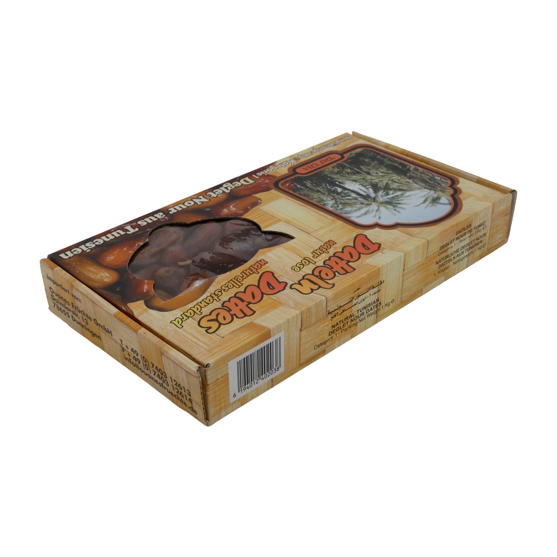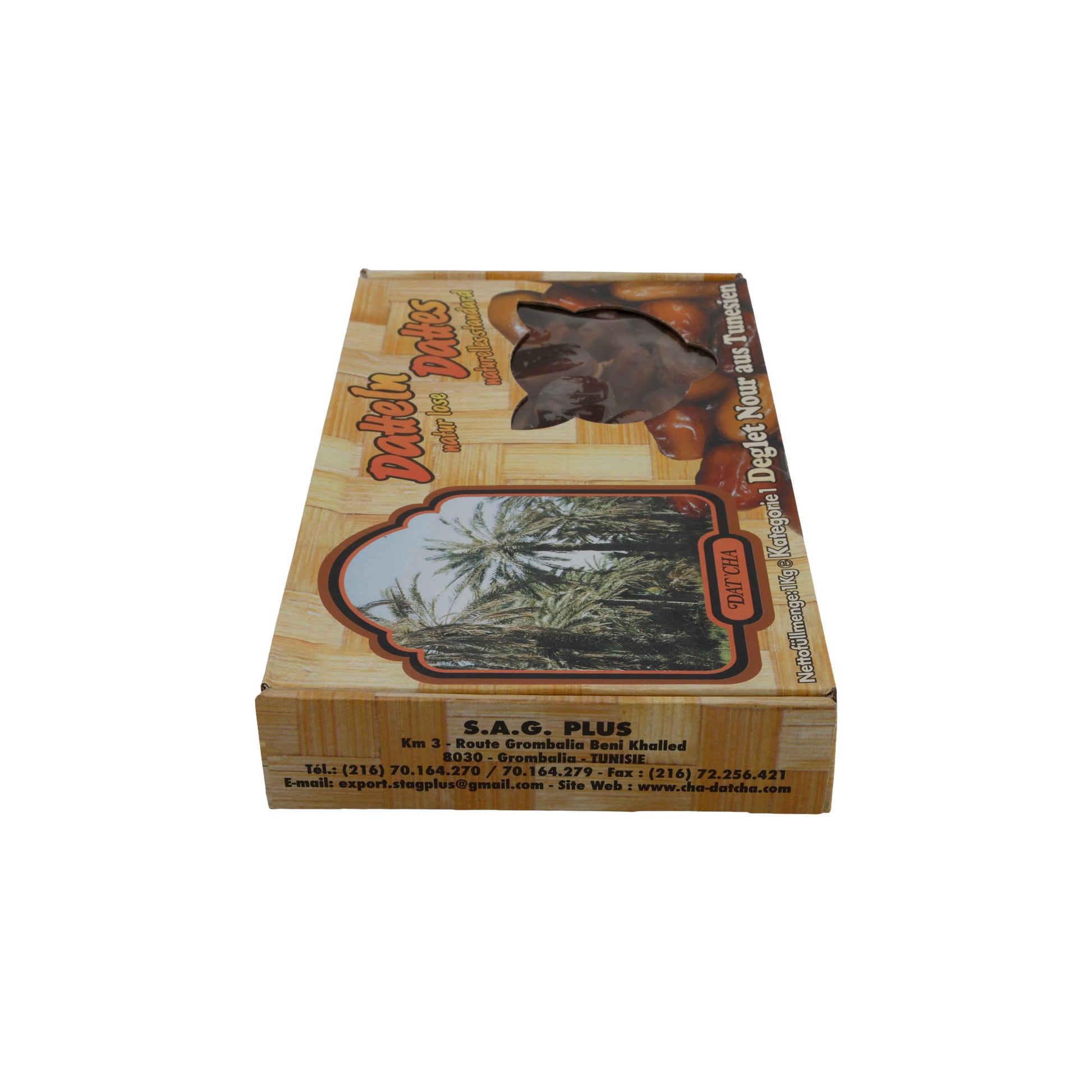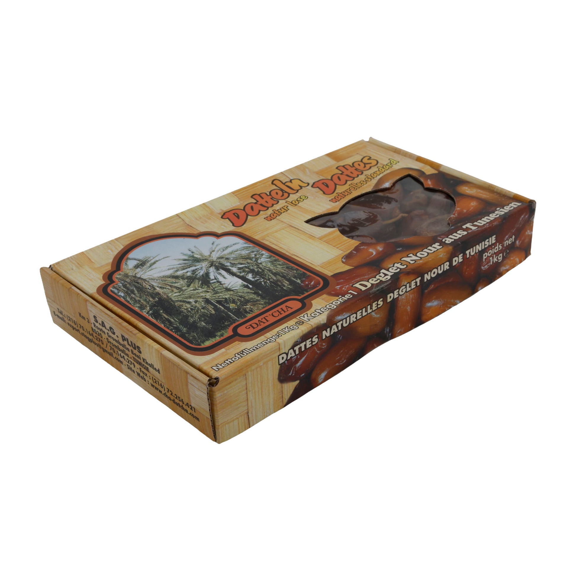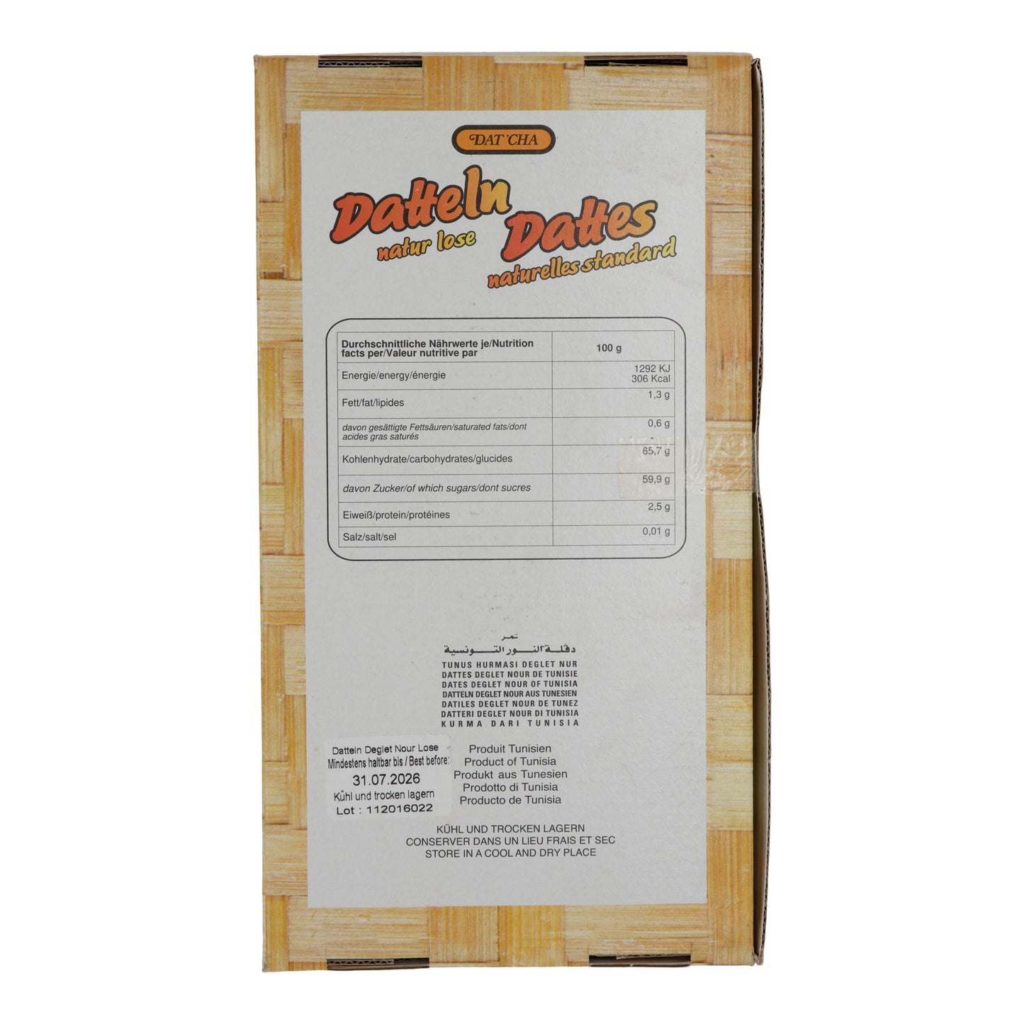 Dat'Cha Datteln Deglet Nour sind naturbelassen, ohne Zusatzstoffe und zeichnen sich durch ihre hellbraune Farbe, weiche Konsistenz und mild-süßen Geschmack aus. Sie sind reich an Ballaststoffen, Kalium und Antioxidantien.