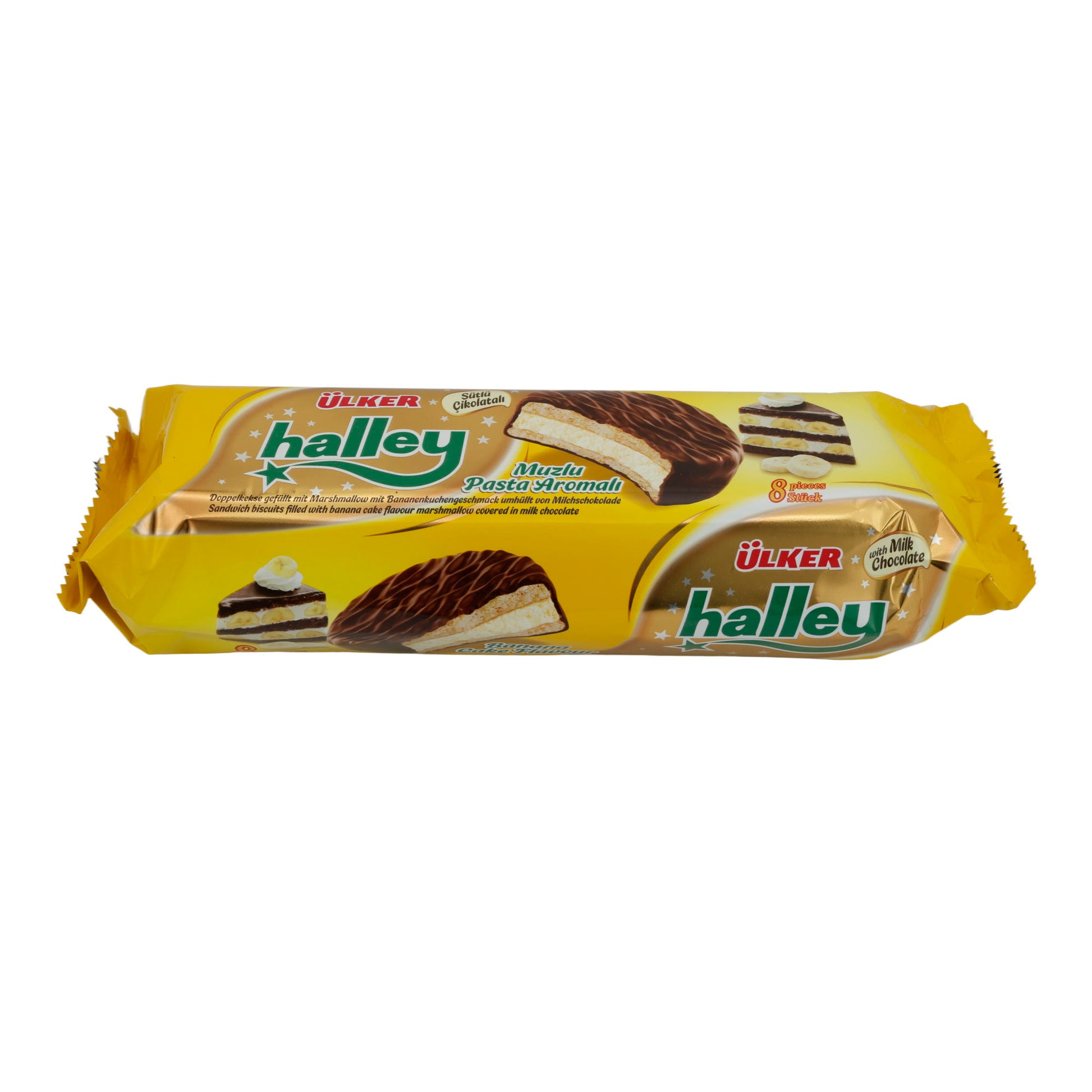 Doppelkekse Ülker | Kekse | Halley Muzlu, Mit Marshmallow-Bananenfüllung & Milchschokolade, 8 Stück 240g bietet ein einzigartiges Geschmackserlebnis.