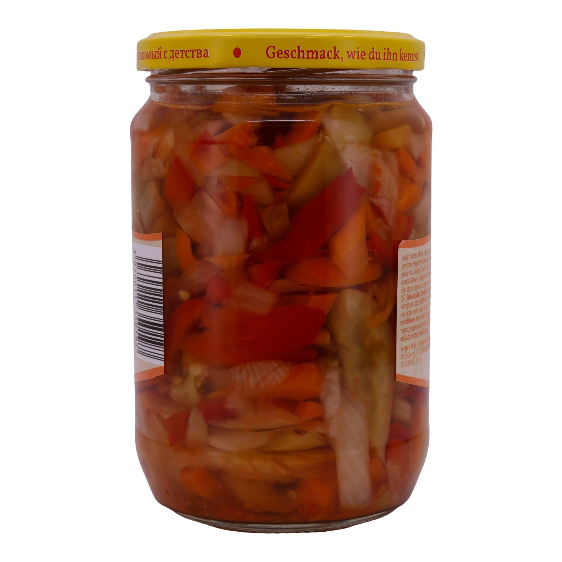 Dieser Salat zeichnet sich durch seine vegane Rezeptur und ausgewogene, leicht süß-saure Würze aus. Er enthält ausschließlich pflanzliche Zutaten wie grüne Tomaten, Zwiebeln, Möhren und Paprika und ist frei von Konservierungsstoffen.