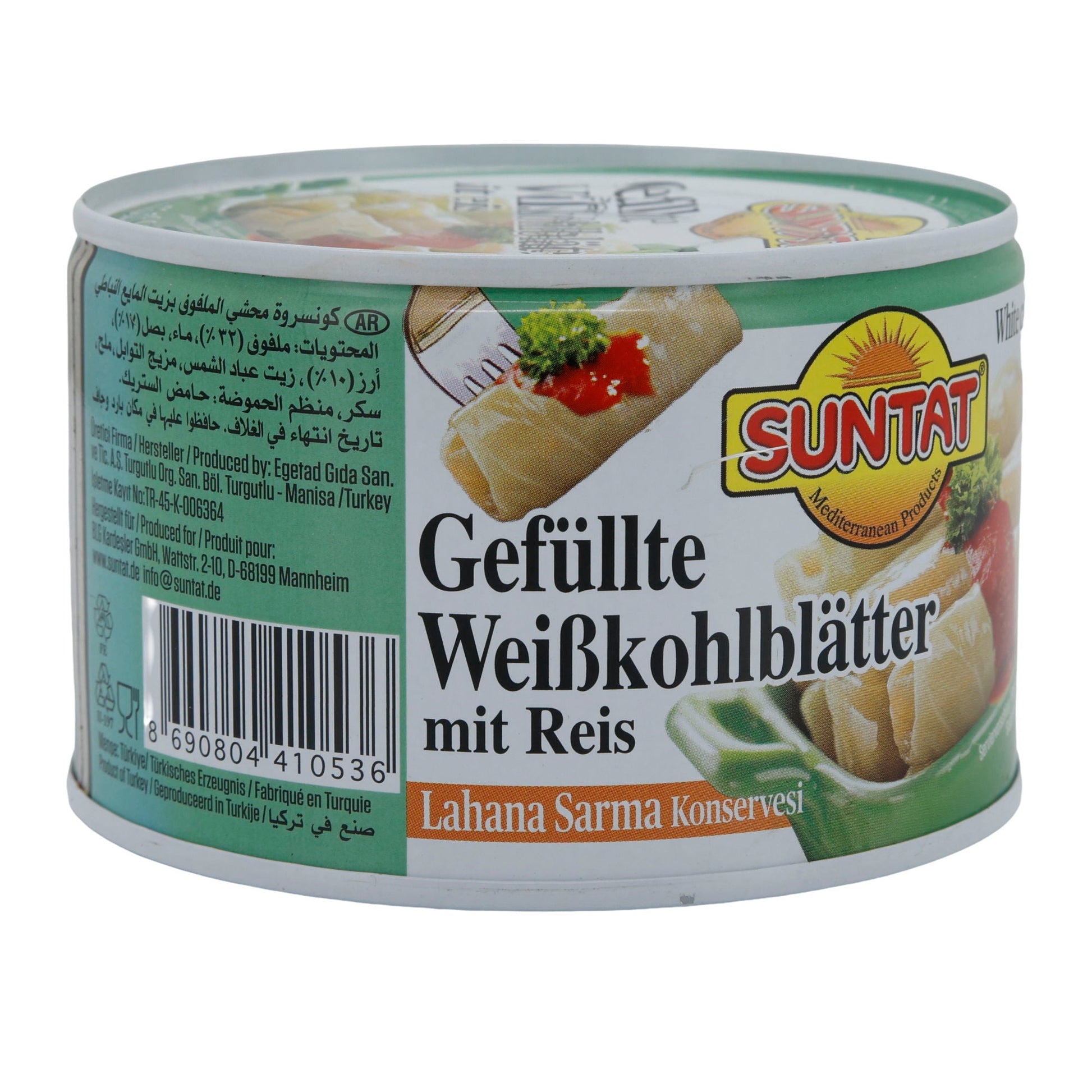 Suntat verwendet zarte, blanchierte Weißkohlblätter und eine würzige Reisfüllung, die mit Tomaten- oder Paprikamark und aromatischen Kräutern wie Dill und Petersilie verfeinert ist. Die Konserve ist vegan und enthält keine tierischen Zutaten.