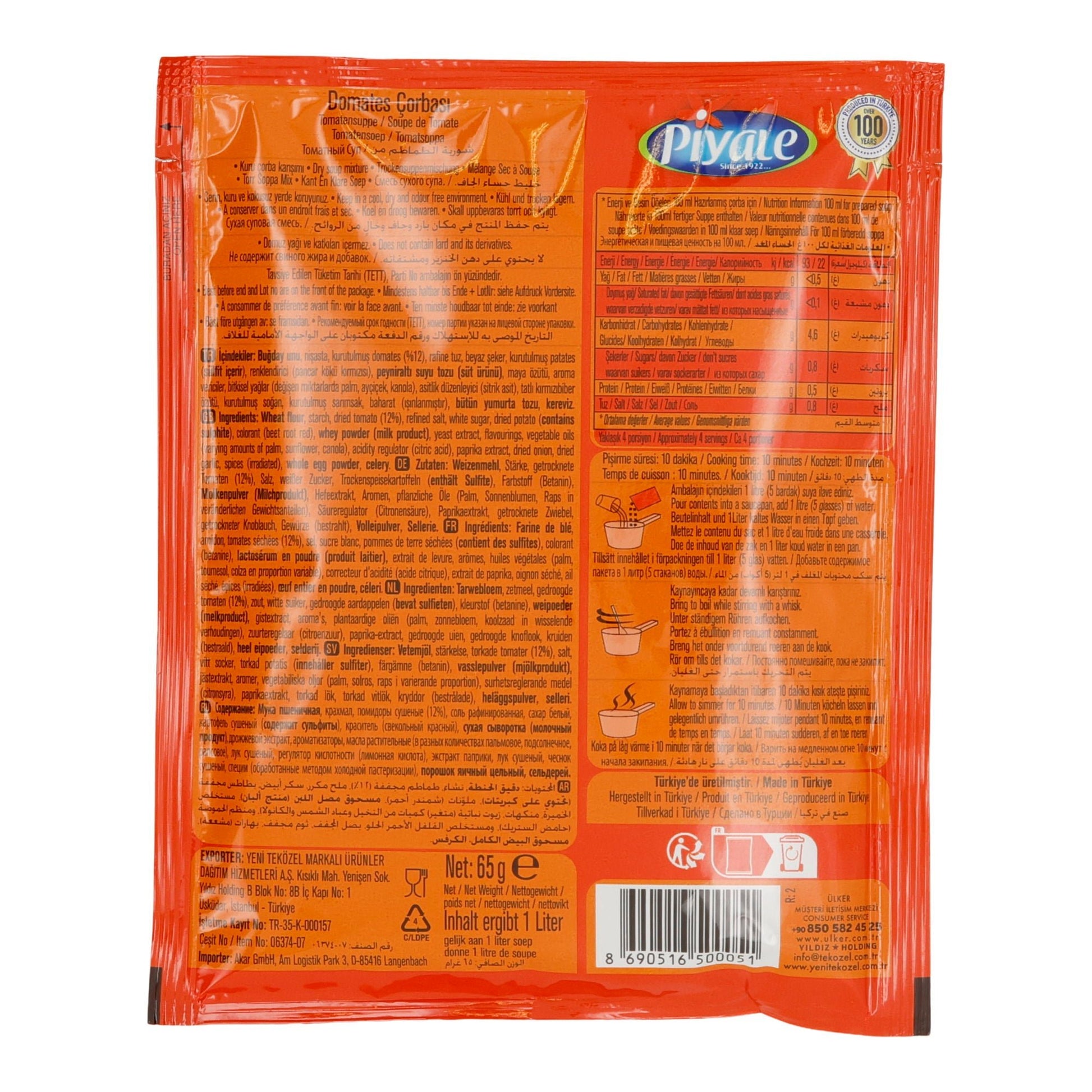 Die Piyale Tomatensuppe wird verwendet, indem der Inhalt des 65 g Beutels in 1 Liter kaltes Wasser eingerührt wird. Anschließend unter ständigem Rühren zum Kochen bringen und bei mittlerer Hitze 5 Minuten köcheln lassen, bis die Suppe cremig ist.