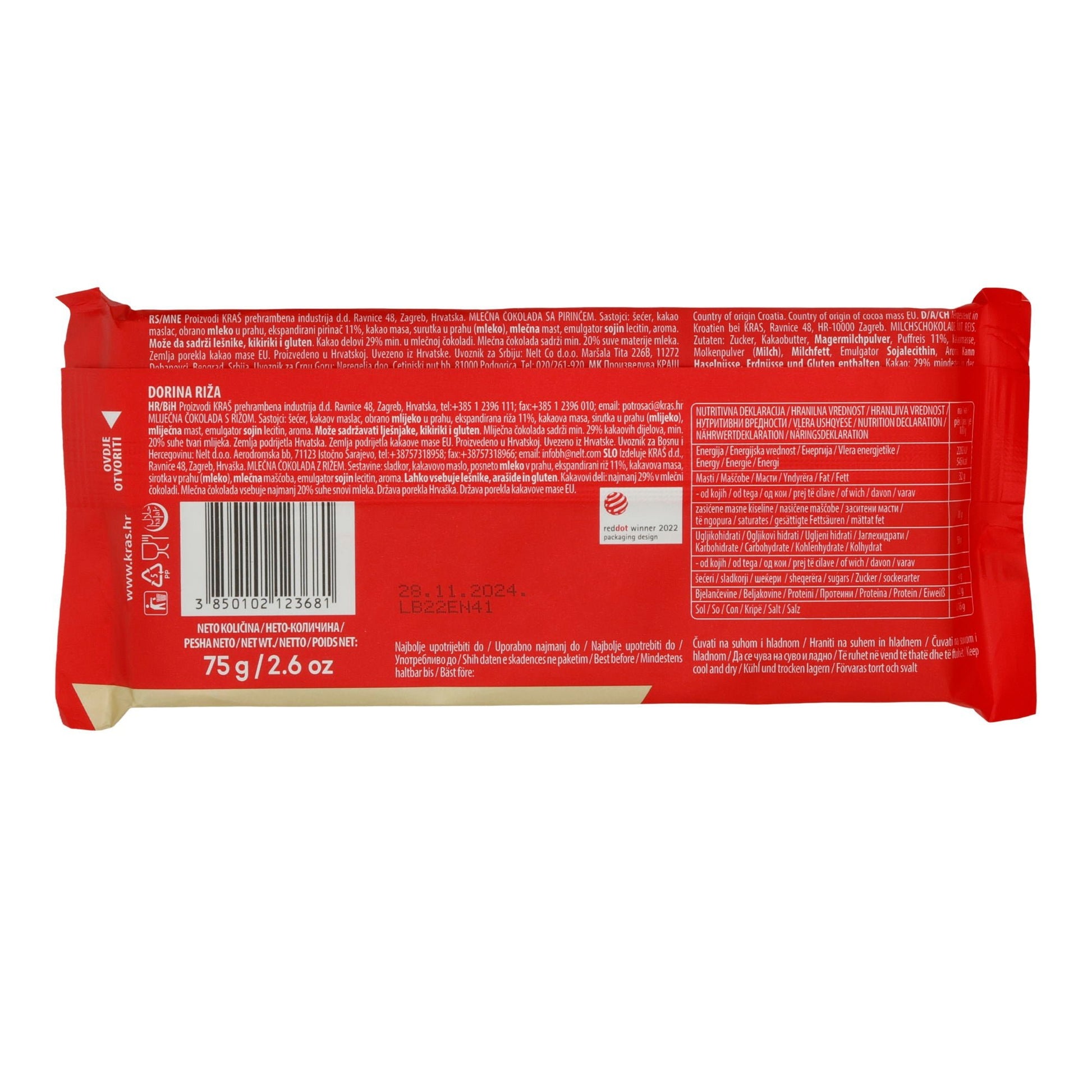 Die Milchschokolade Kraš Dorina mit Puffreis eignet sich ideal als süßer Snack für zwischendurch oder zum Teilen mit Freunden und Familie. Aufgrund ihrer handlichen Größe von 75 g ist sie perfekt für unterwegs.