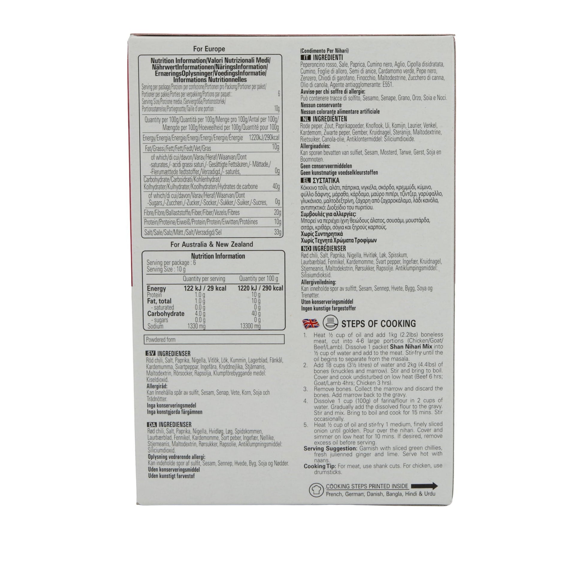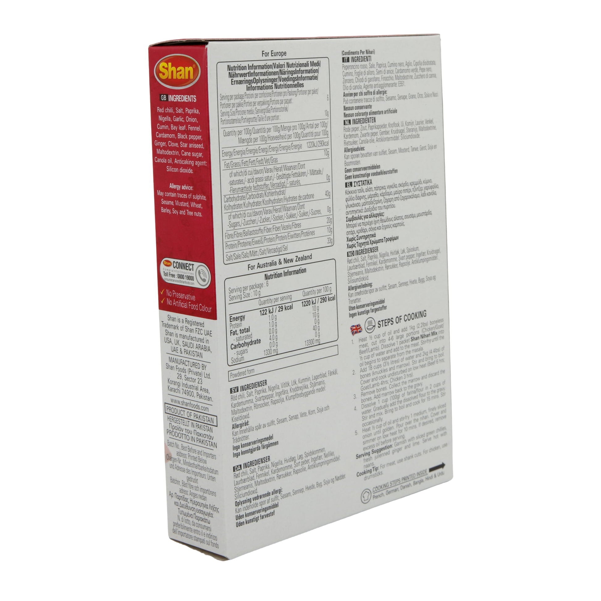Die Nihari Shan Würzmischung wird verwendet, um den traditionellen pakistanischen Fleischeintopf Nihari zuzubereiten. Erhitzen Sie ½ Tasse Öl, braten Sie das Fleisch mit der Gewürzmischung an, fügen Sie 3,5 l Wasser und Knochen hinzu und lassen Sie es auf niedriger Hitze schmoren (Rind ca. 6 Stunden, Lamm 4 Stunden, Huhn 3 Stunden).
