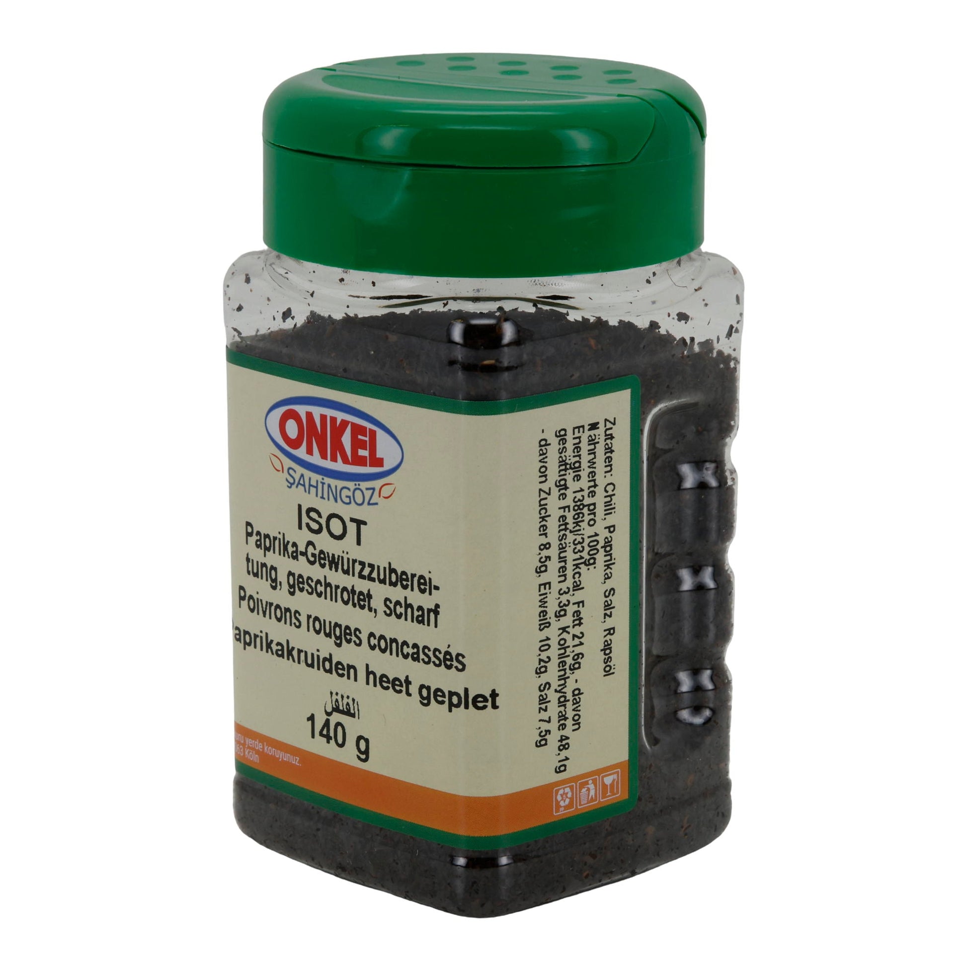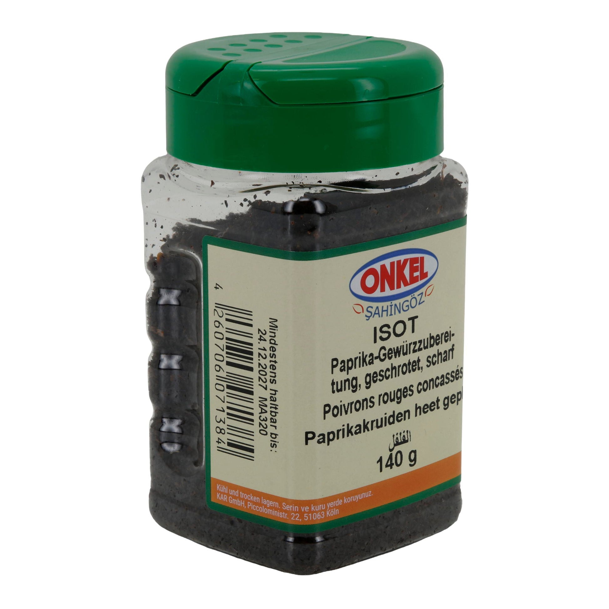Die Paprika-Gewürzzubereitung Onkel Şahingöz Isot ist durch das Rösten besonders aromatisch und scharf, mit einer charakteristischen Rauchnote. Sie besteht aus grob geschroteten Chilis und Paprika, die leicht feucht sind, was das Dosieren erleichtert.