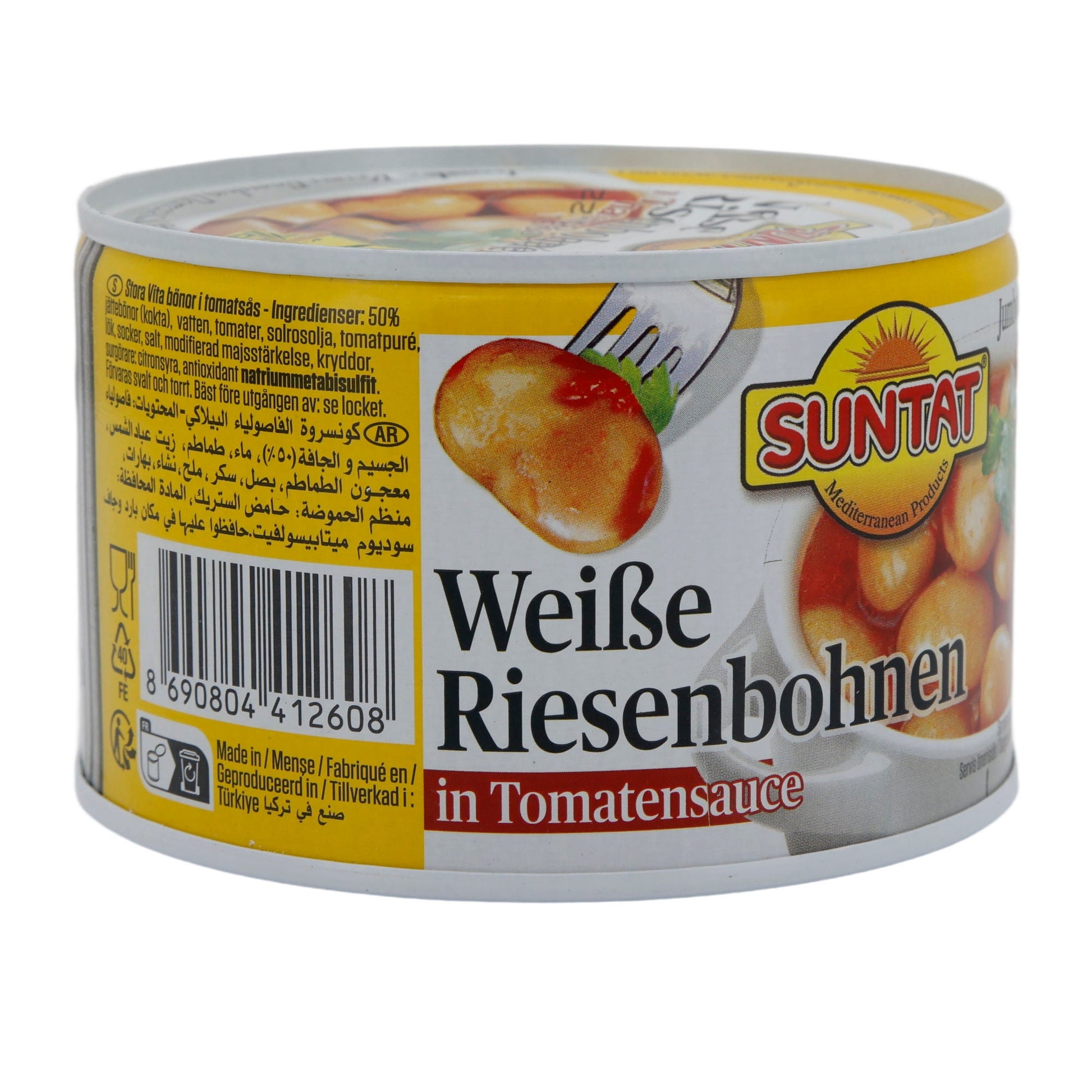 Riesenbohnen Suntat sind große weiße Bohnen in einer aromatischen Tomatensauce, inspiriert von der mediterranen und türkischen Küche. Sie sind reich an pflanzlichem Eiweiß und Ballaststoffen, was sie zu einer gesunden Wahl macht.