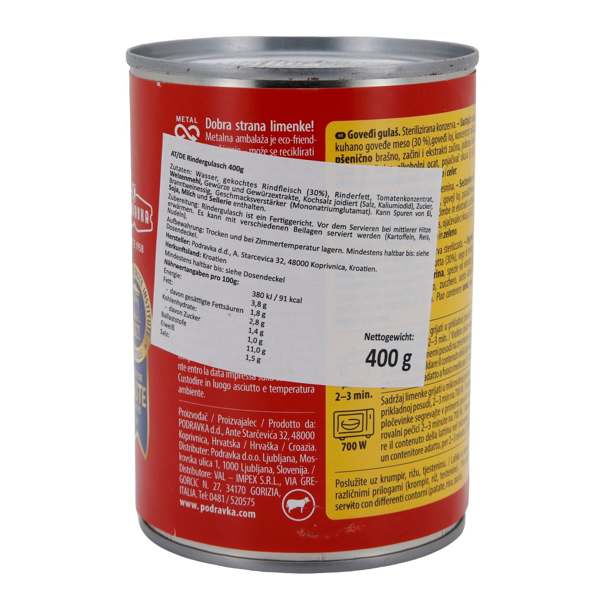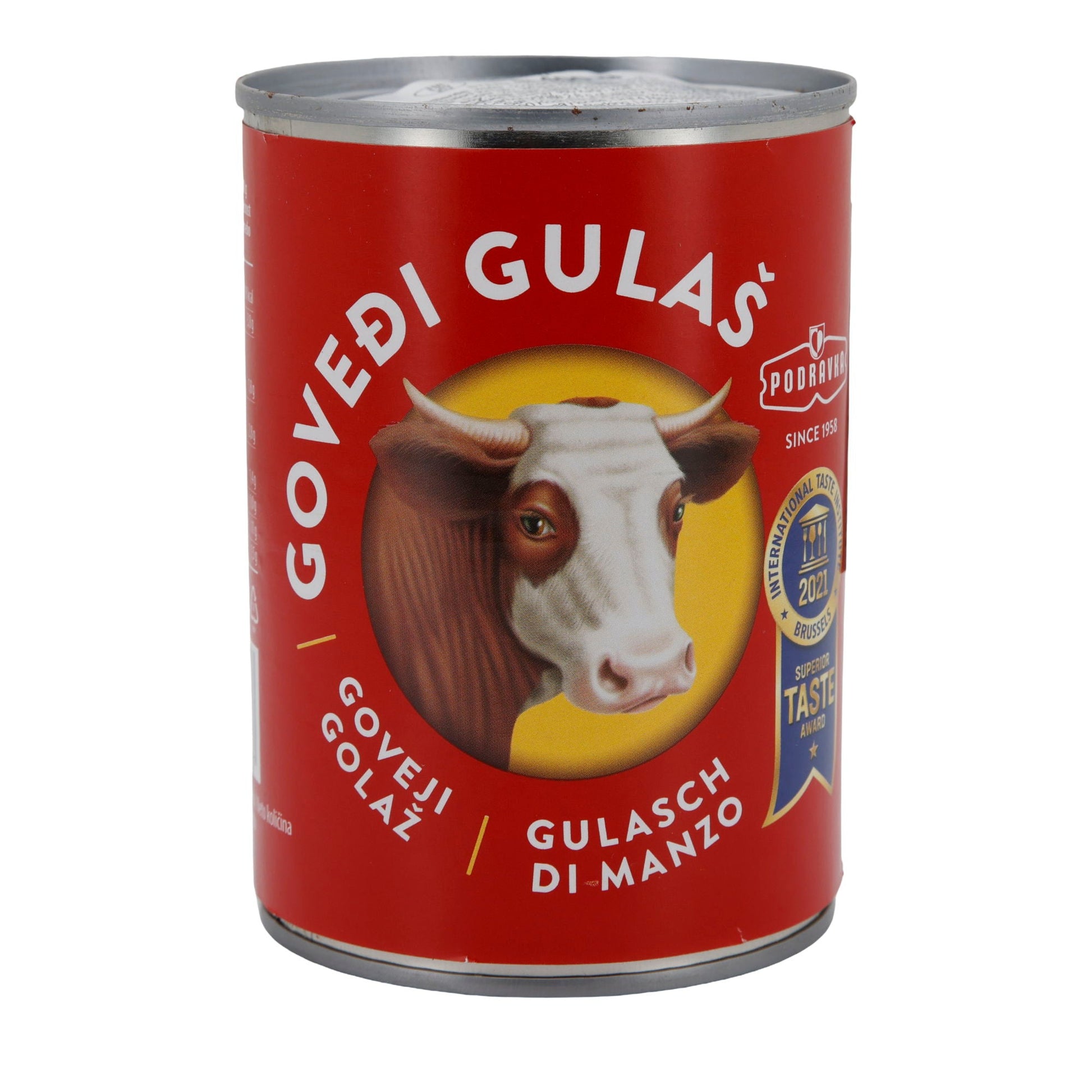 Rindergulasch Podravka zeichnet sich durch seinen hohen Fleischanteil von 30 % und seine mild-würzige Sauce aus. Es wurde mit dem Superior Taste Award ausgezeichnet und ist frei von künstlichen Farbstoffen.
