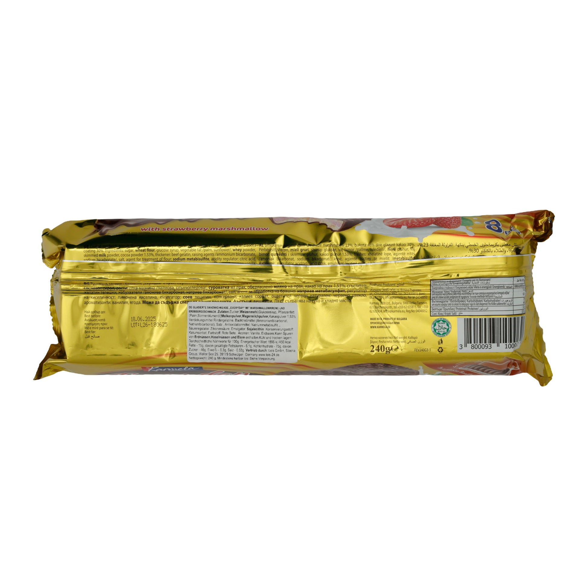 Schokoladenkekse Karmela mit Erdbeer-Marshmallow liefern zartschmelzende Schokolade und eine luftige Füllung.