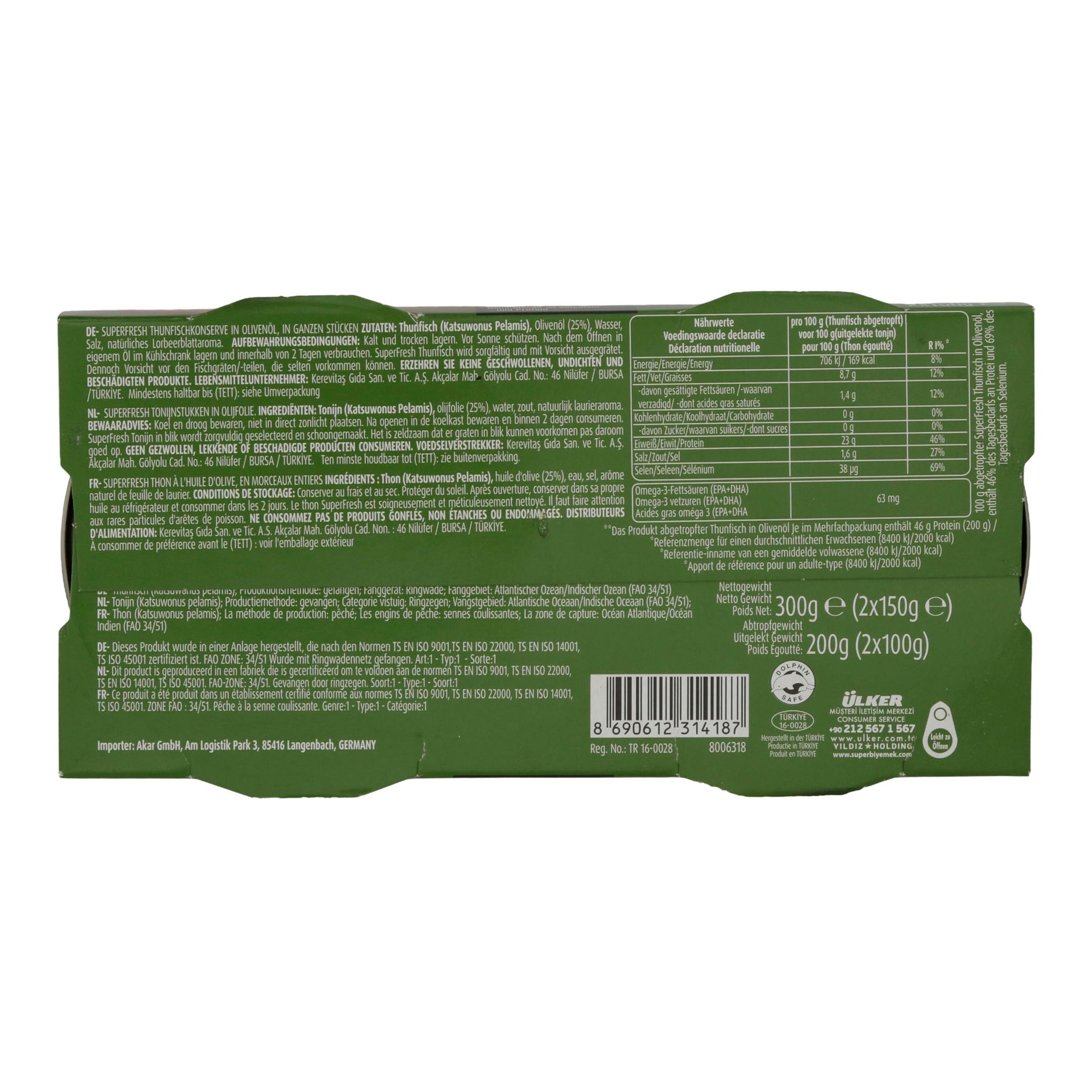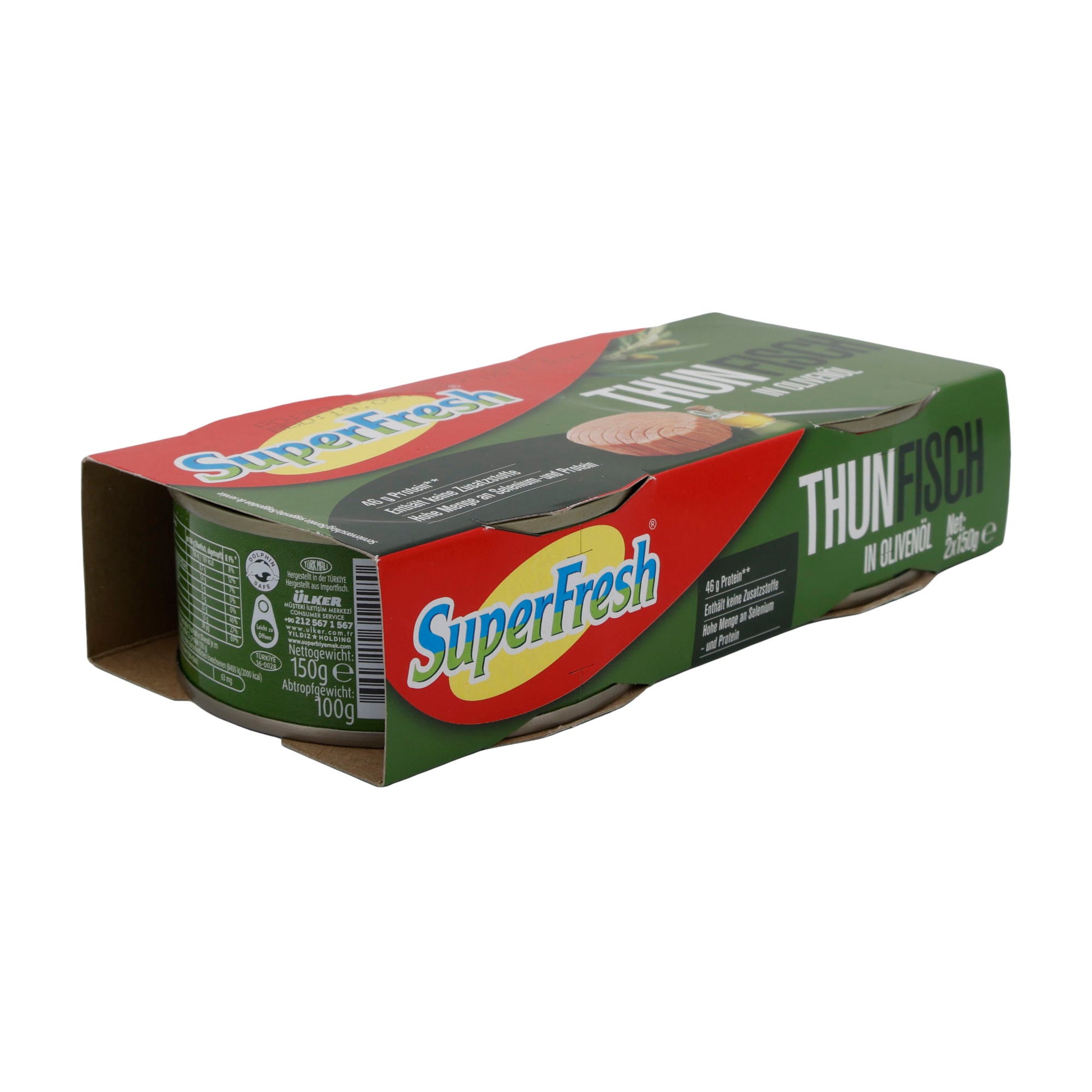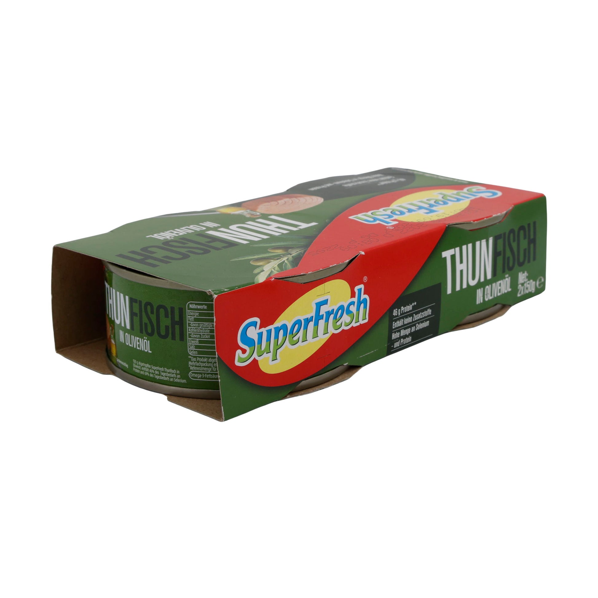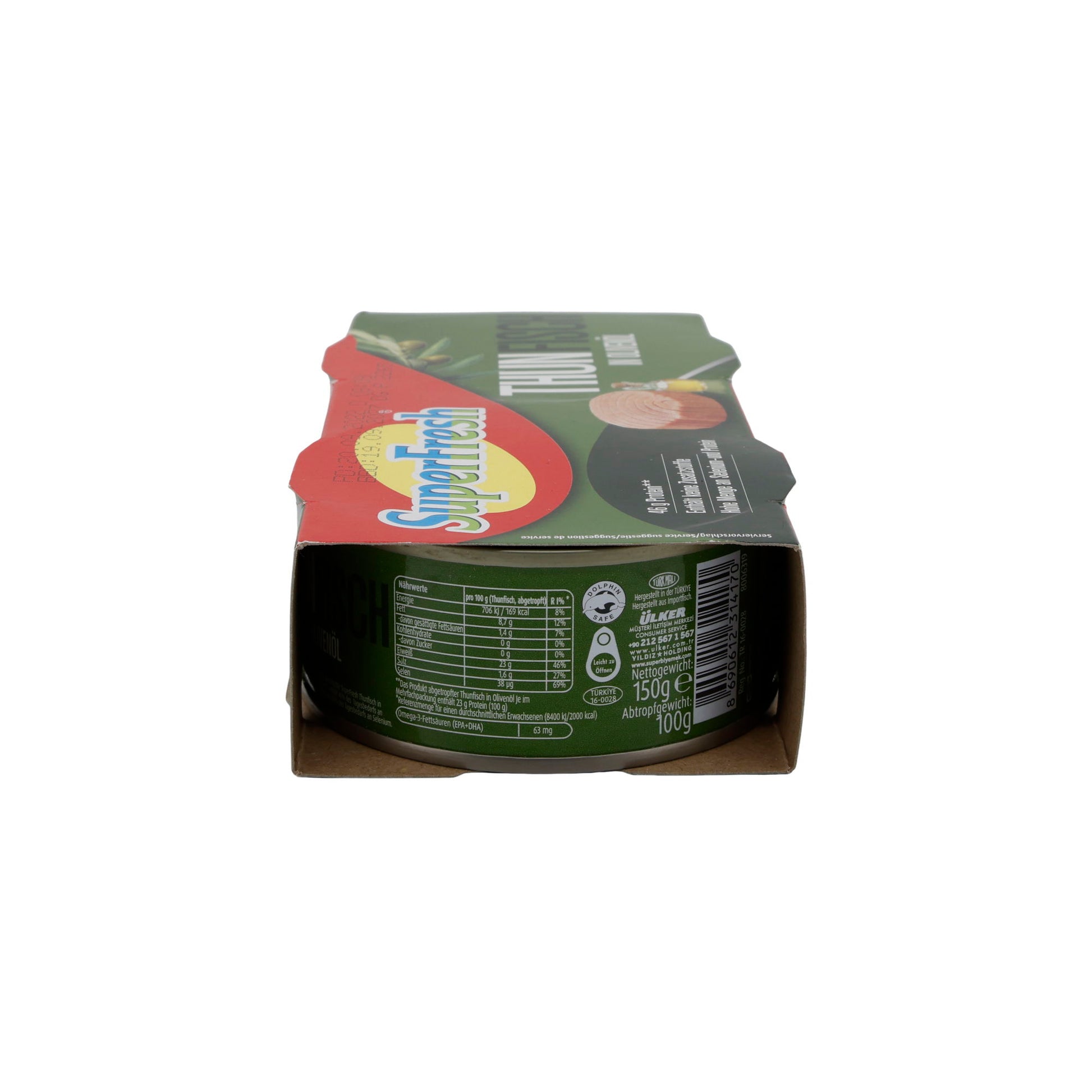Fisch SuperFresh | Thunfisch in Olivenöl | Proteinreich & Omega-3-Quelle | 2 x 150 g bietet Ihnen hochwertigen Thunfisch, eingelegt in feinstem Olivenöl.