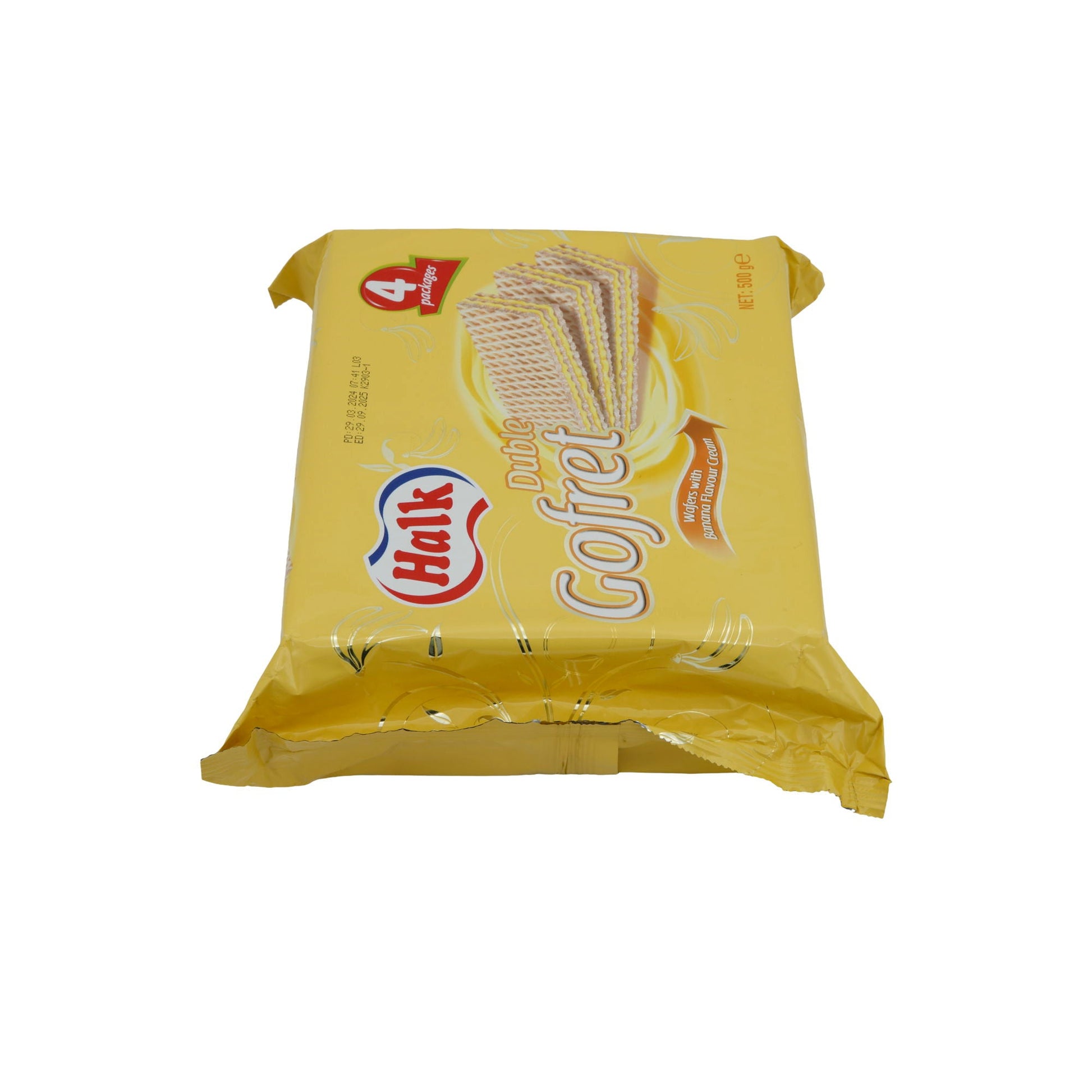 Halk Duble Gofret Waffeln mit Bananencreme sind verzehrfertig und ideal als Snack zwischendurch, zum Kaffee oder Tee geeignet. Sie können auch als Dessertkomponente oder Topping für Eis und Pudding verwendet werden.