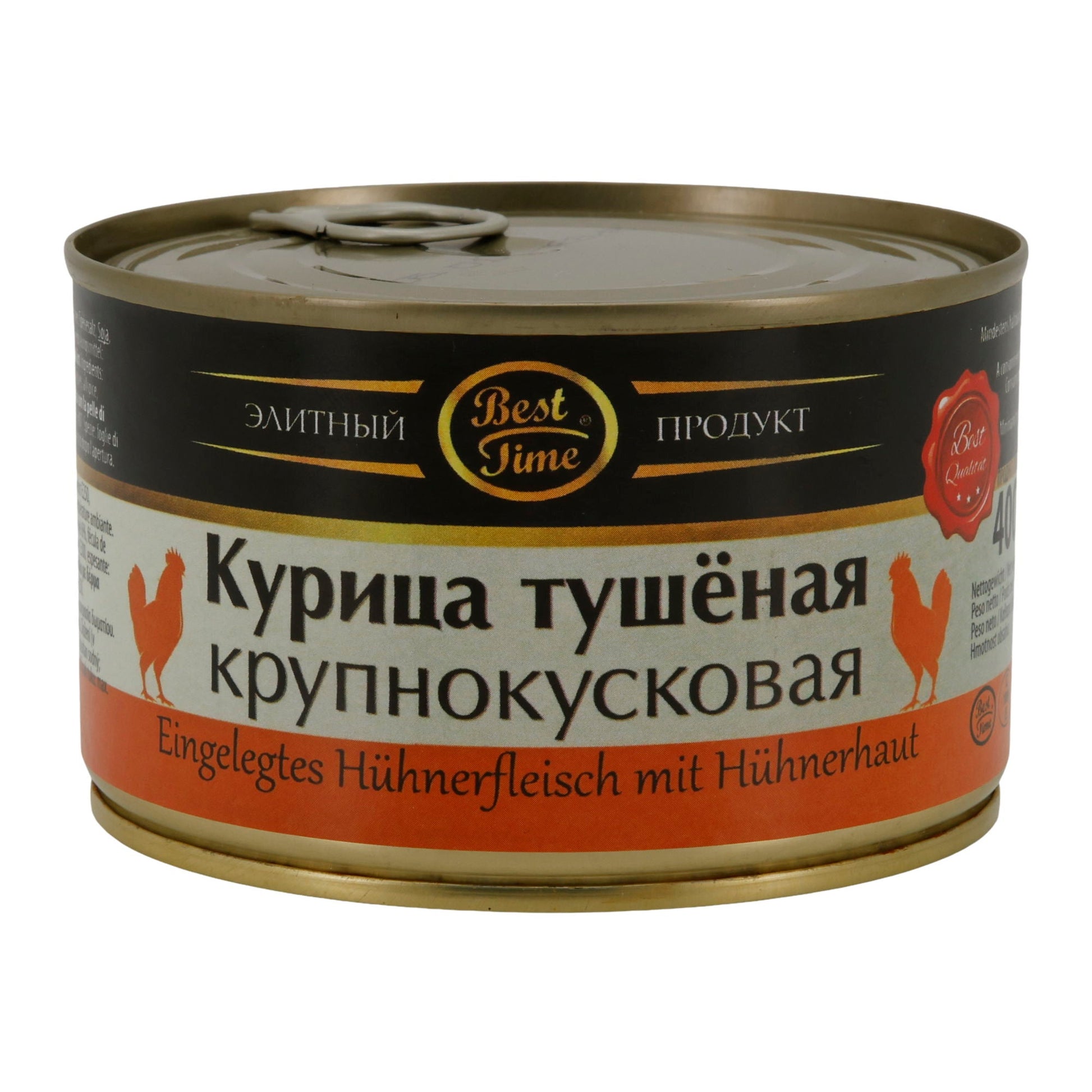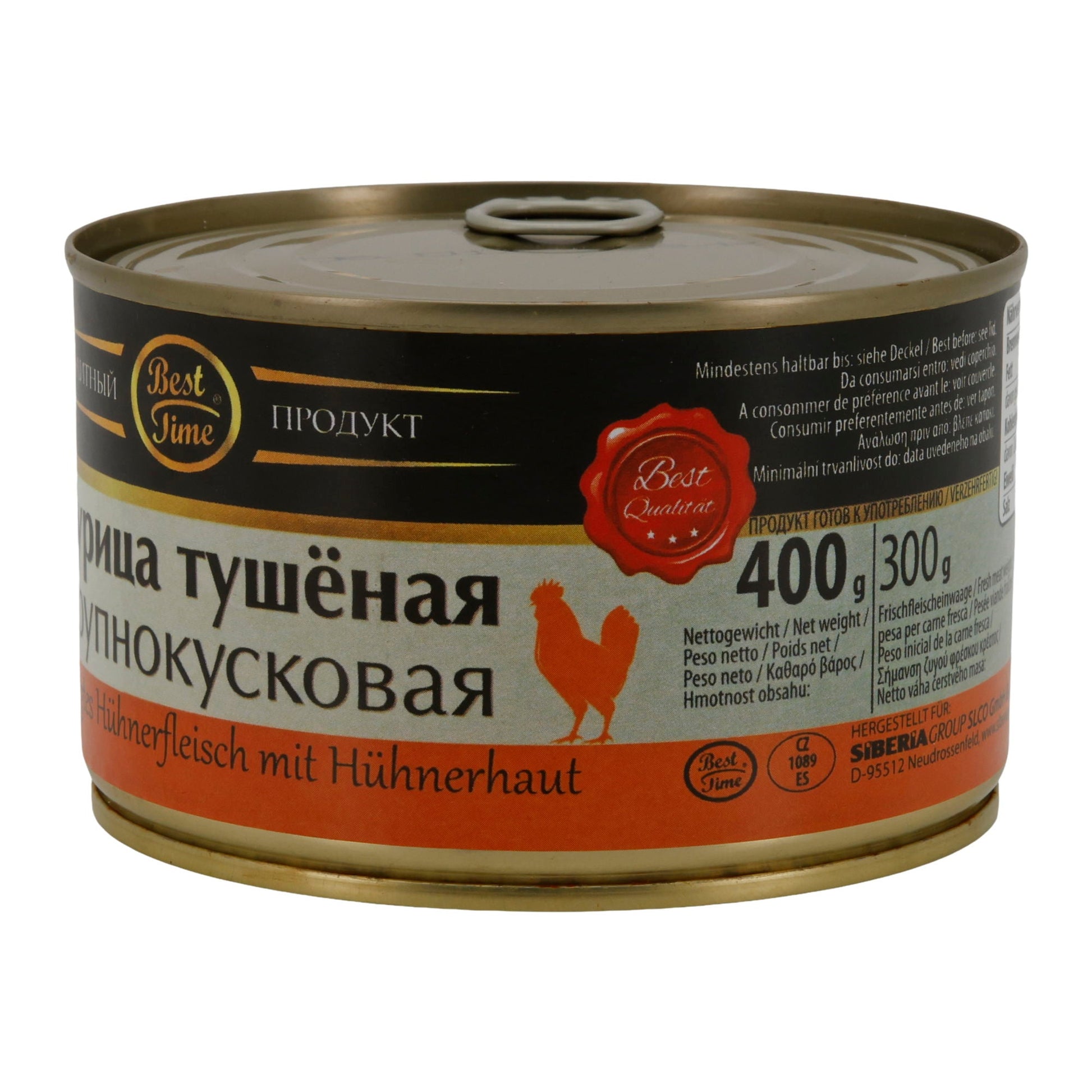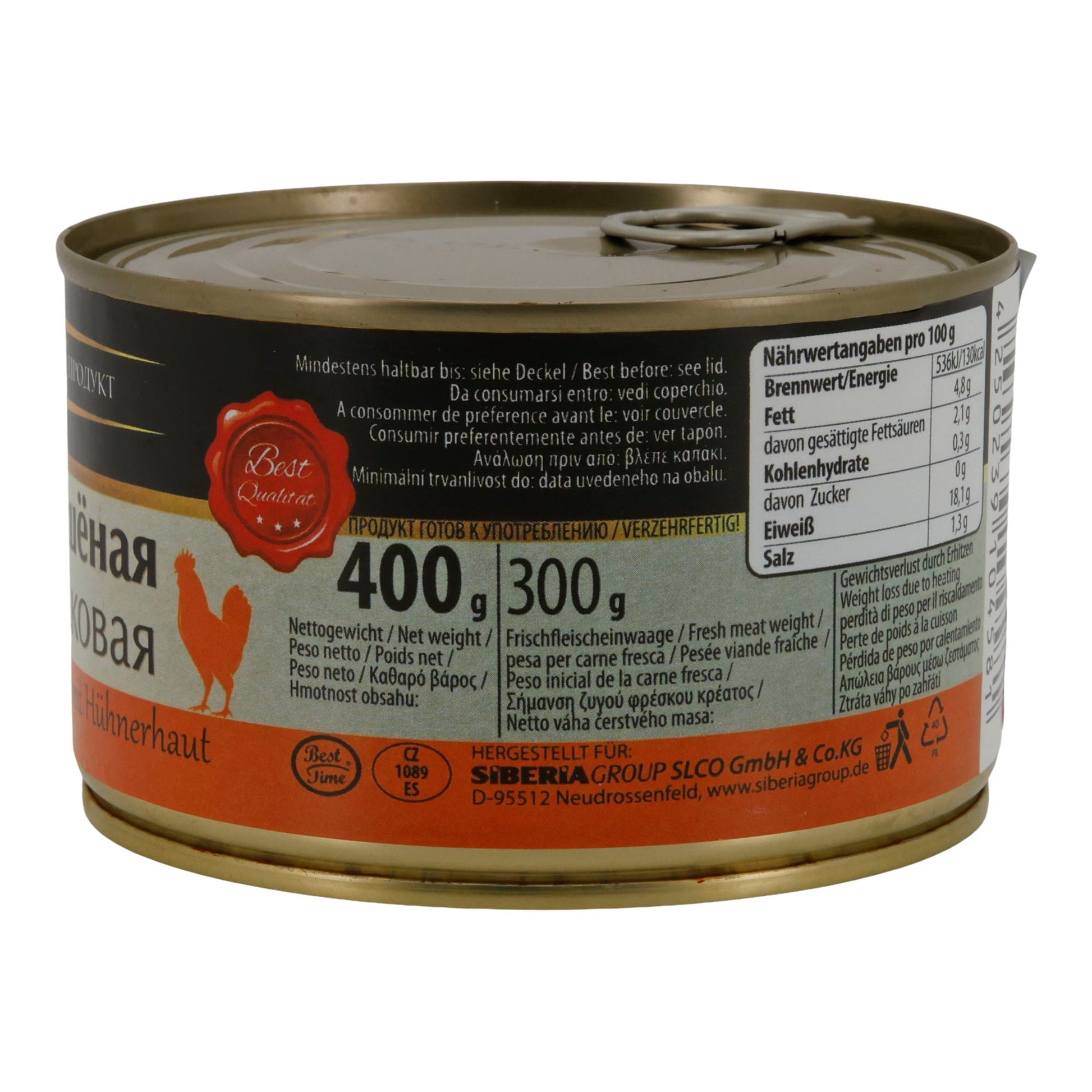 Eingelegtes Hühnerfleisch mit Hühnerhaut von BEST TIME kann direkt aus der 400 g Dose verwendet werden. Es eignet sich ideal als Einlage in Suppen oder Eintöpfen, als Zutat in Salaten oder als Füllung für Wraps und Sandwiches. Für warme Gerichte einfach in einer Pfanne erhitzen.