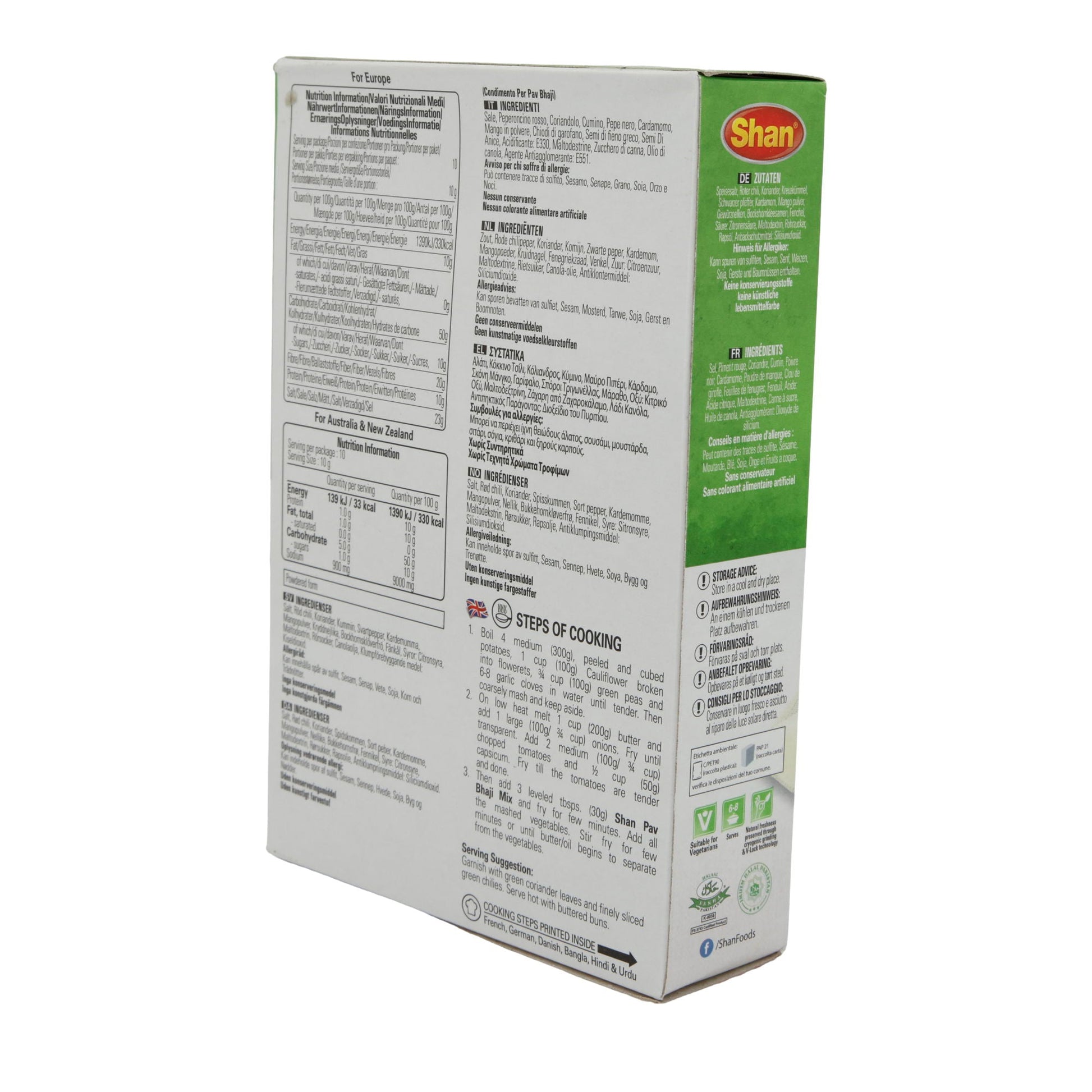 Die Shan Pav Bhaji Gewürzmischung wird traditionell für das indische Gericht Pav Bhaji verwendet. Kochen Sie Kartoffeln, Blumenkohl, Erbsen und Knoblauch weich, zerstampfen Sie sie grob und braten Sie sie mit Zwiebeln, Tomaten und Paprika an. Fügen Sie 3 EL der Gewürzmischung hinzu und braten Sie weiter, bis sich das Aroma entfaltet.