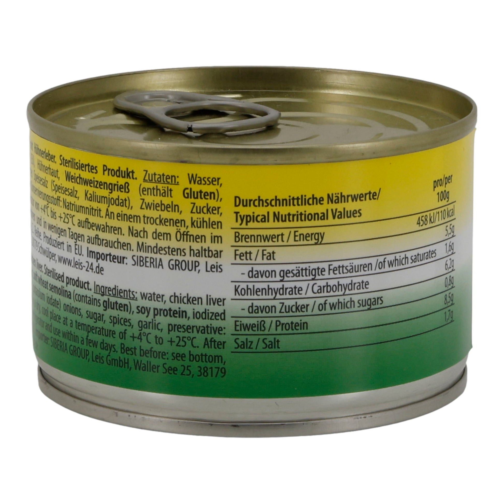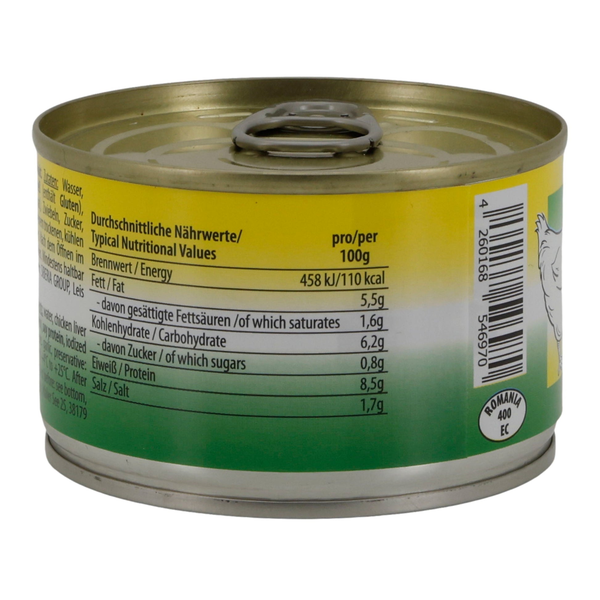Wasser, Hühnerleber (15 %) (EU), Hühnerhaut, Weichweizengrieß (enthält Gluten), Sojaprotein, jodiertes Speisesalz (Speisesalz, Kaliumjodat), Zwiebeln, Zucker, Gewürze, Knoblauch, Konservierungsstoff: Natriumnitrit