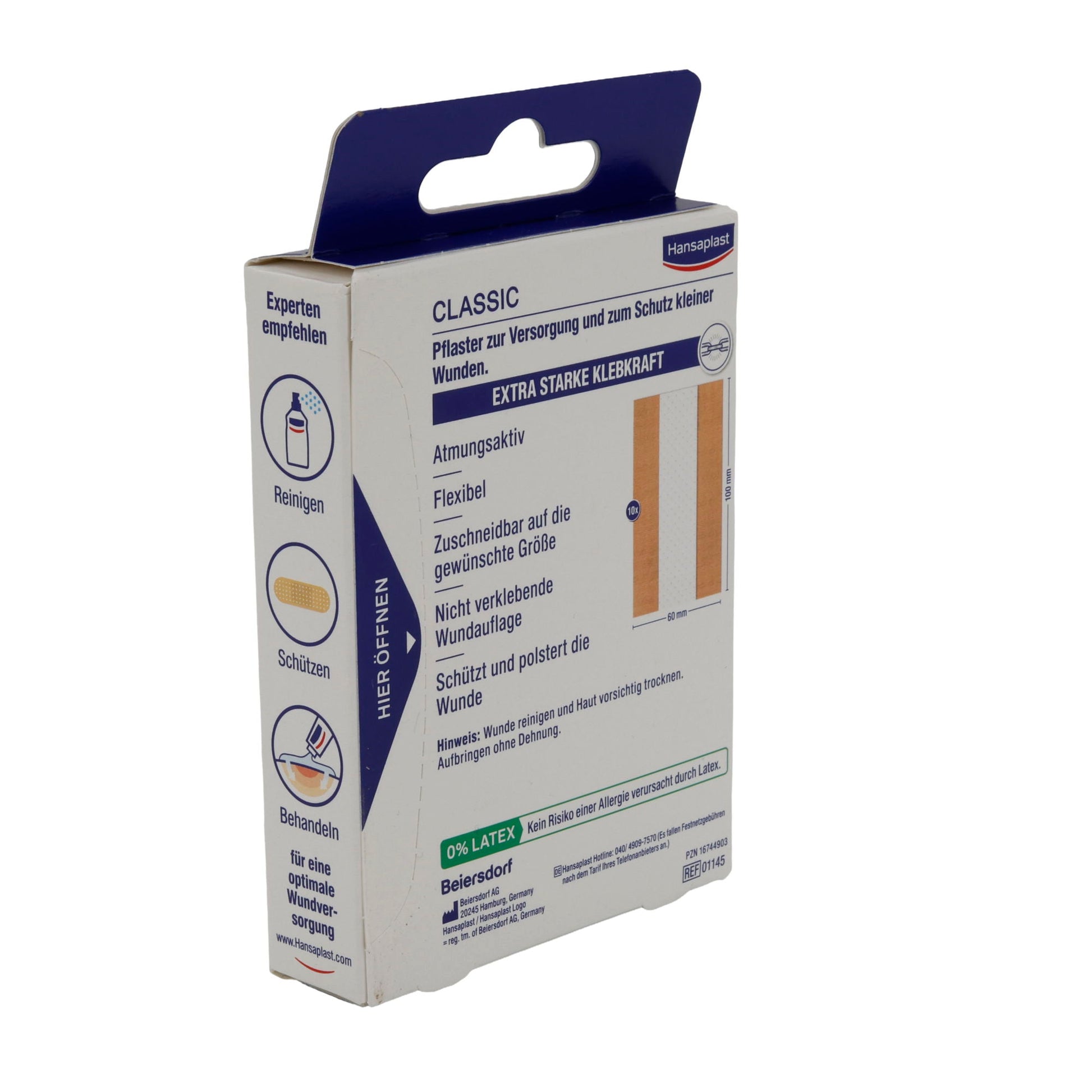 Das Hansaplast Classic Pflaster wird verwendet, indem Sie die Wunde zuerst gründlich reinigen und trocknen. Schneiden Sie das Pflaster auf die benötigte Größe zu und kleben Sie es so auf, dass die Wundauflage die Verletzung vollständig bedeckt. Die starke Klebkraft sorgt für sicheren Halt, auch bei Bewegung.