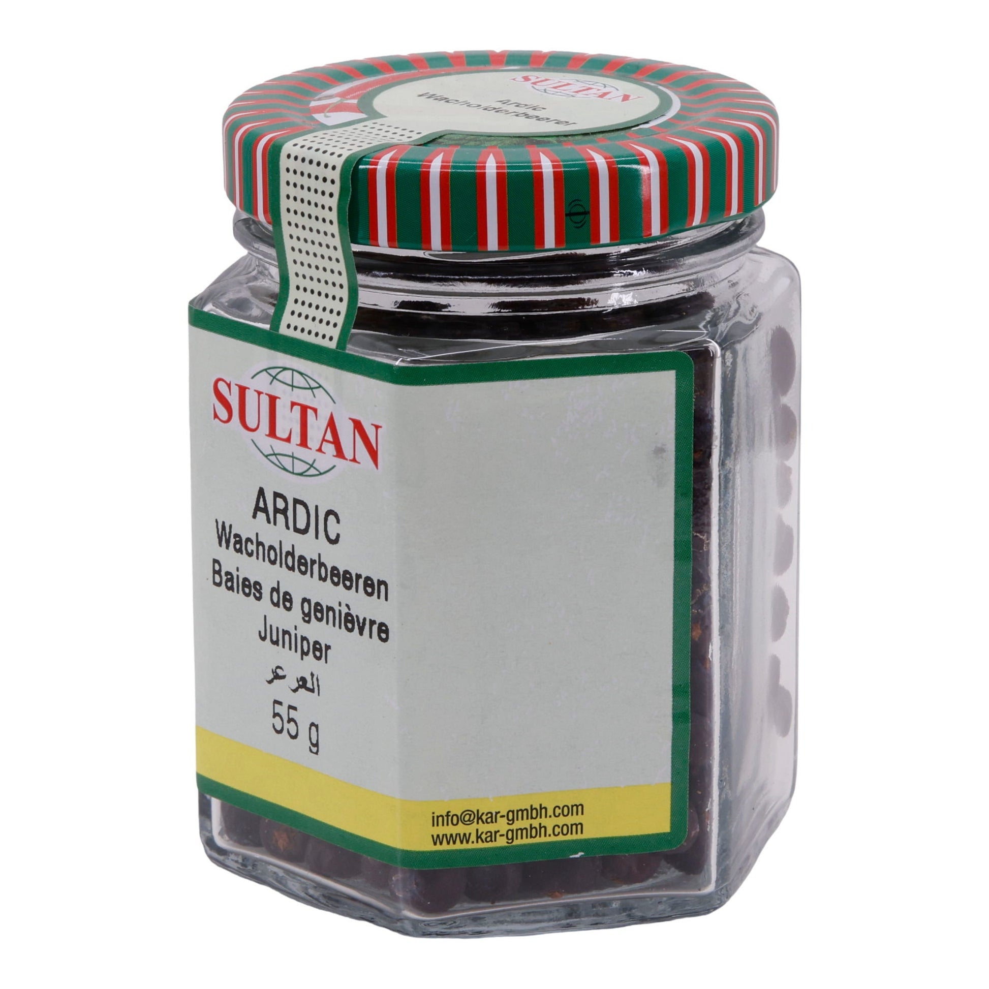 Sultan Wacholderbeeren sind ein vielseitiges Gewürz, das in der Küche für seinen süßlich-harzigen Geschmack geschätzt wird. Ideal zum Verfeinern von Fleischgerichten, insbesondere Wild, sowie für Sauerkraut und Marinaden. Die Beeren sind in einem praktischen 55g-Glas verpackt, das die Aromen frisch hält.