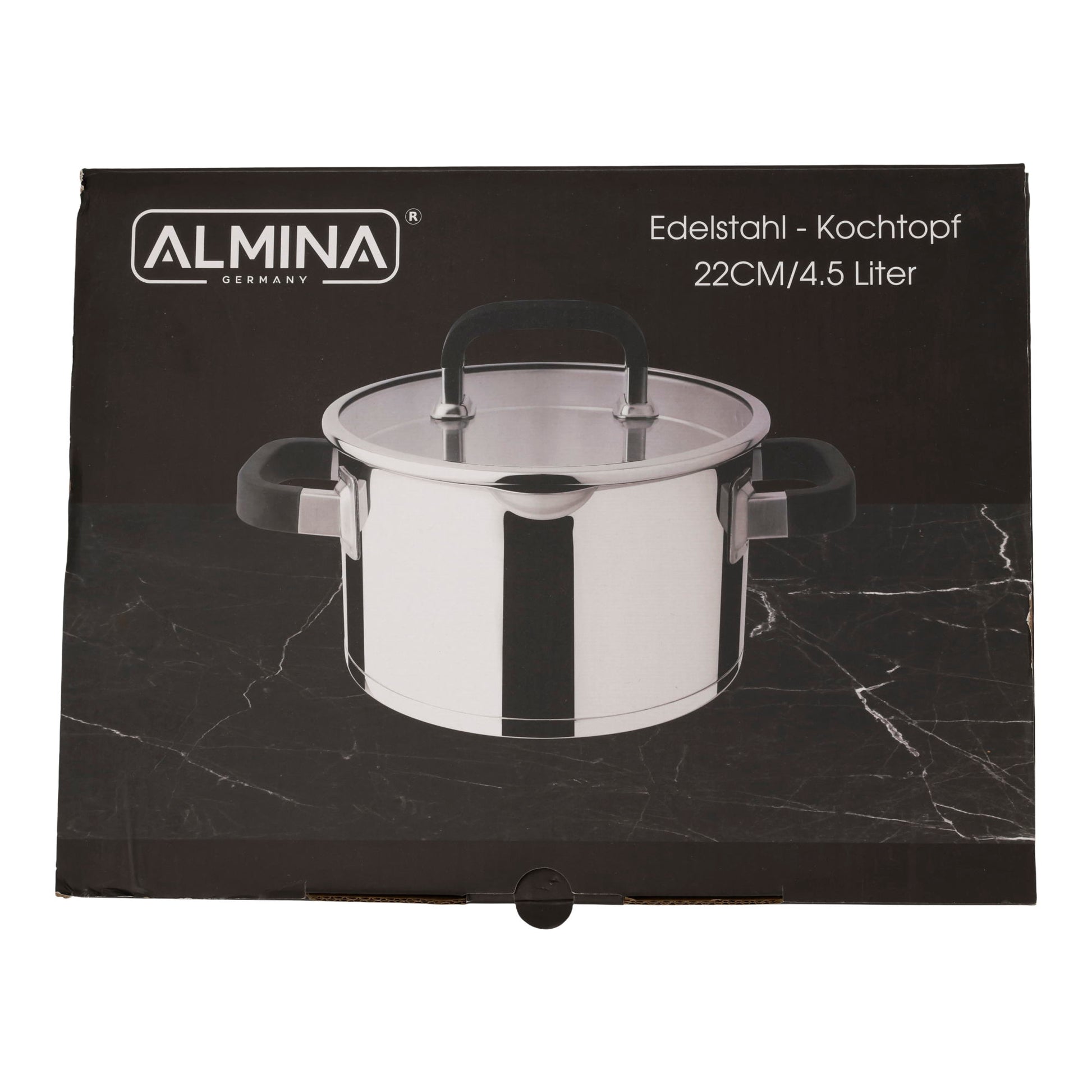 Almina Edelstahl Kochtopf – 22 cm, 4,5 Liter – Induktionsgeeignet mit Glasdeckel