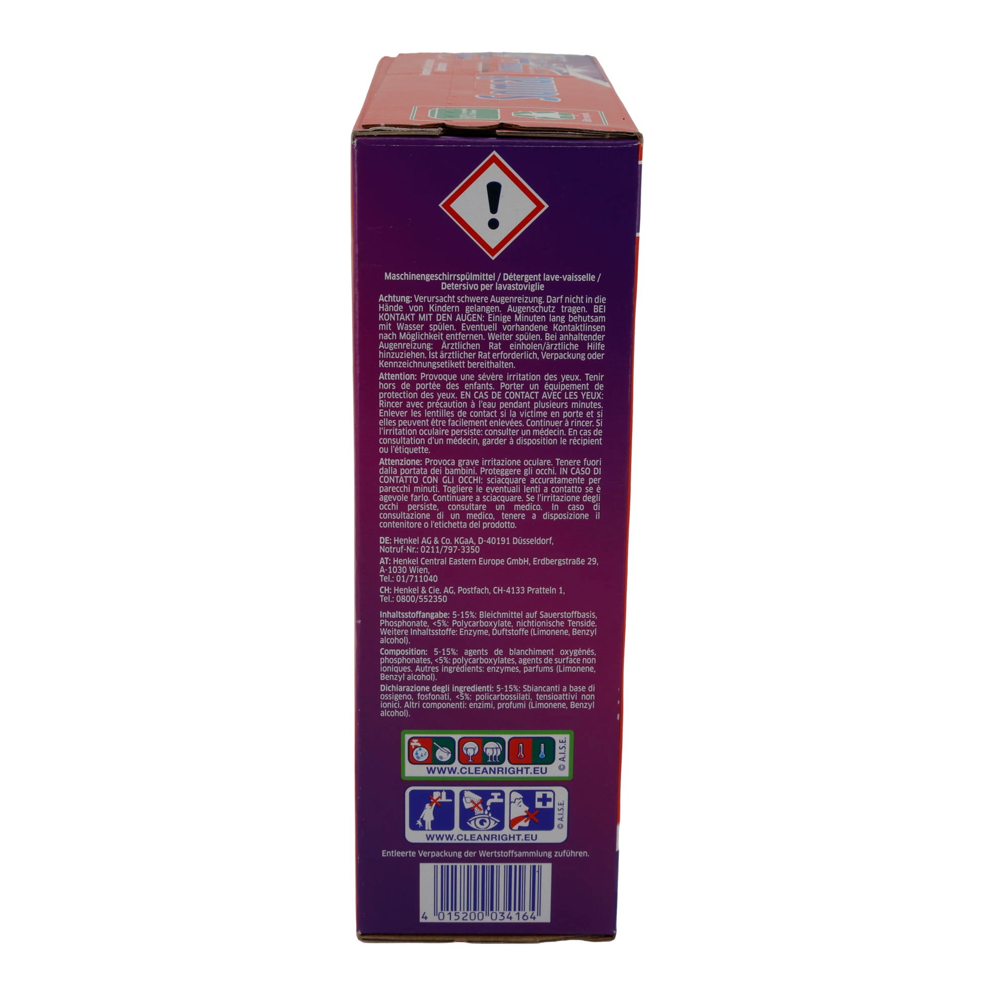 5–15 % Bleichmittel auf Sauerstoffbasis, Polycarboxylate, < 5 % nichtionische Tenside, Phosphonate, Enzyme (Subtilisin, Amylase), Duftstoffe (Limonene, Benzyl Alcohol)