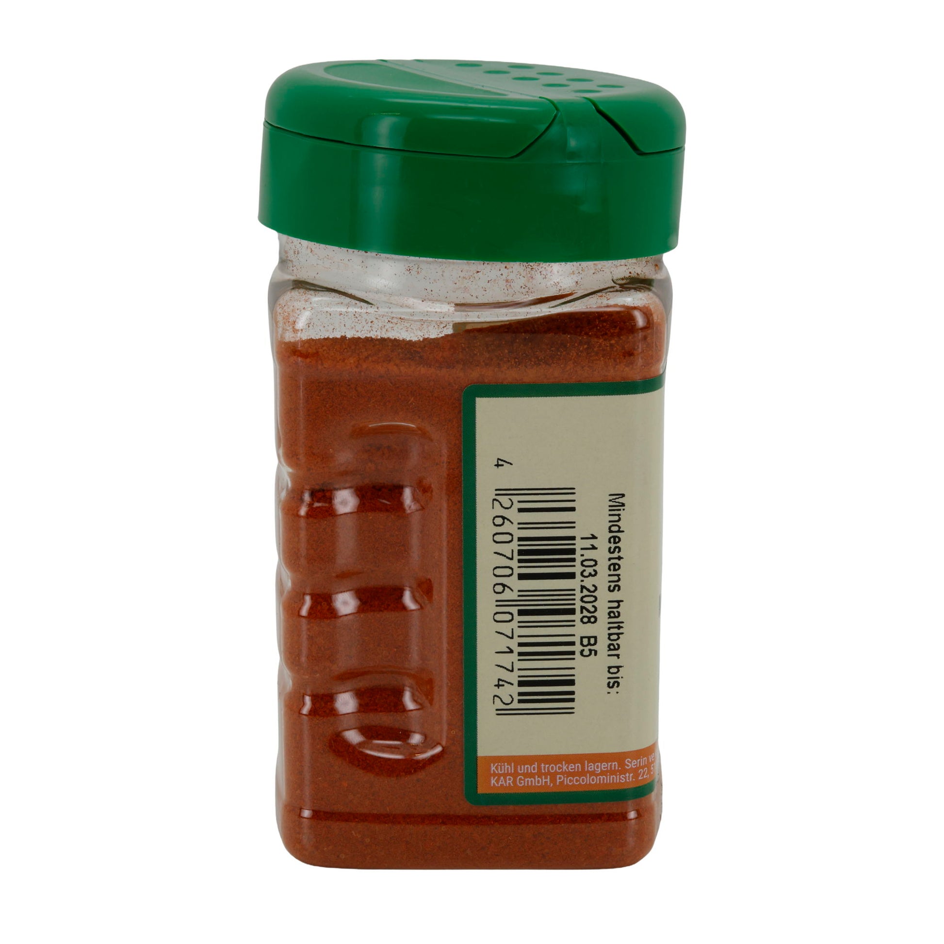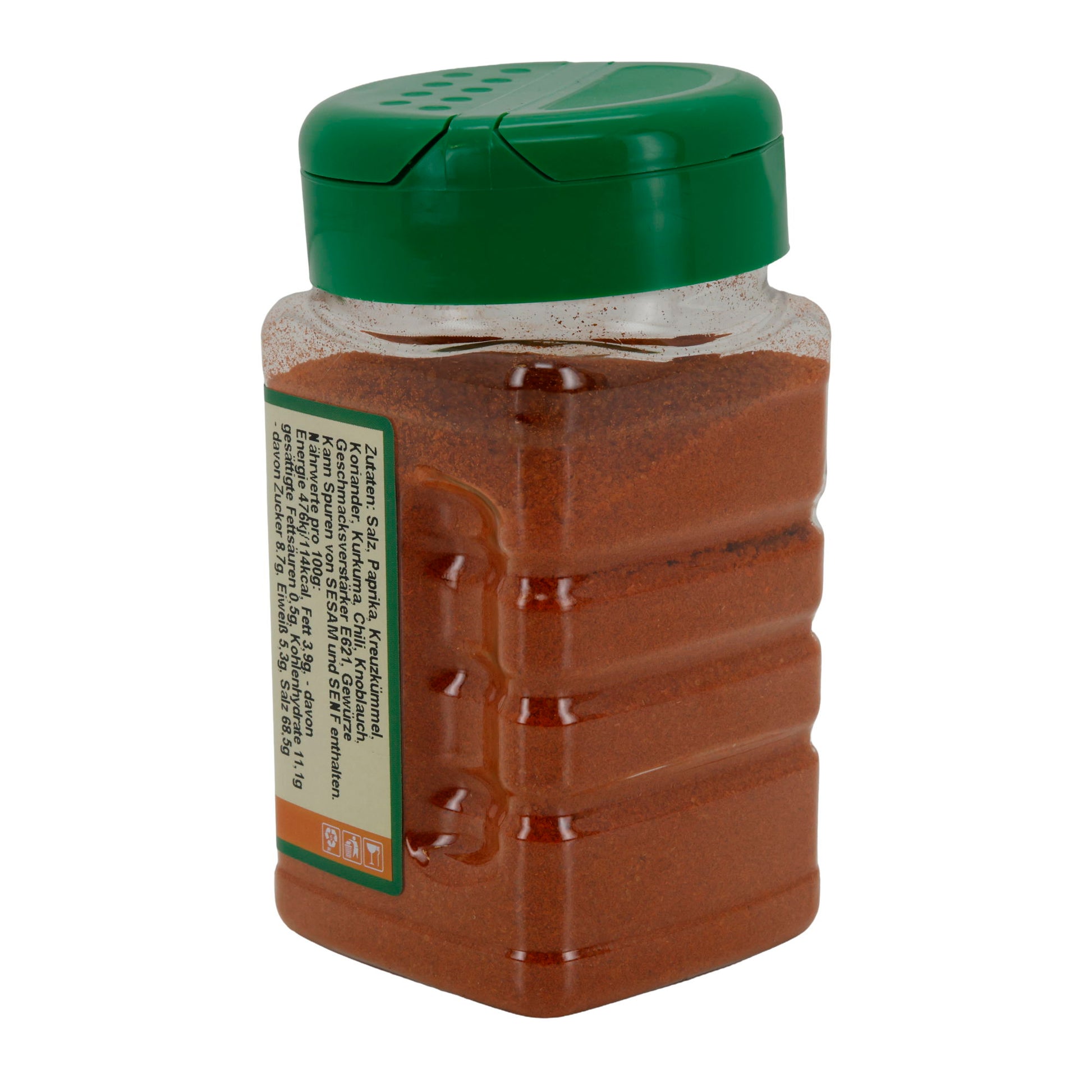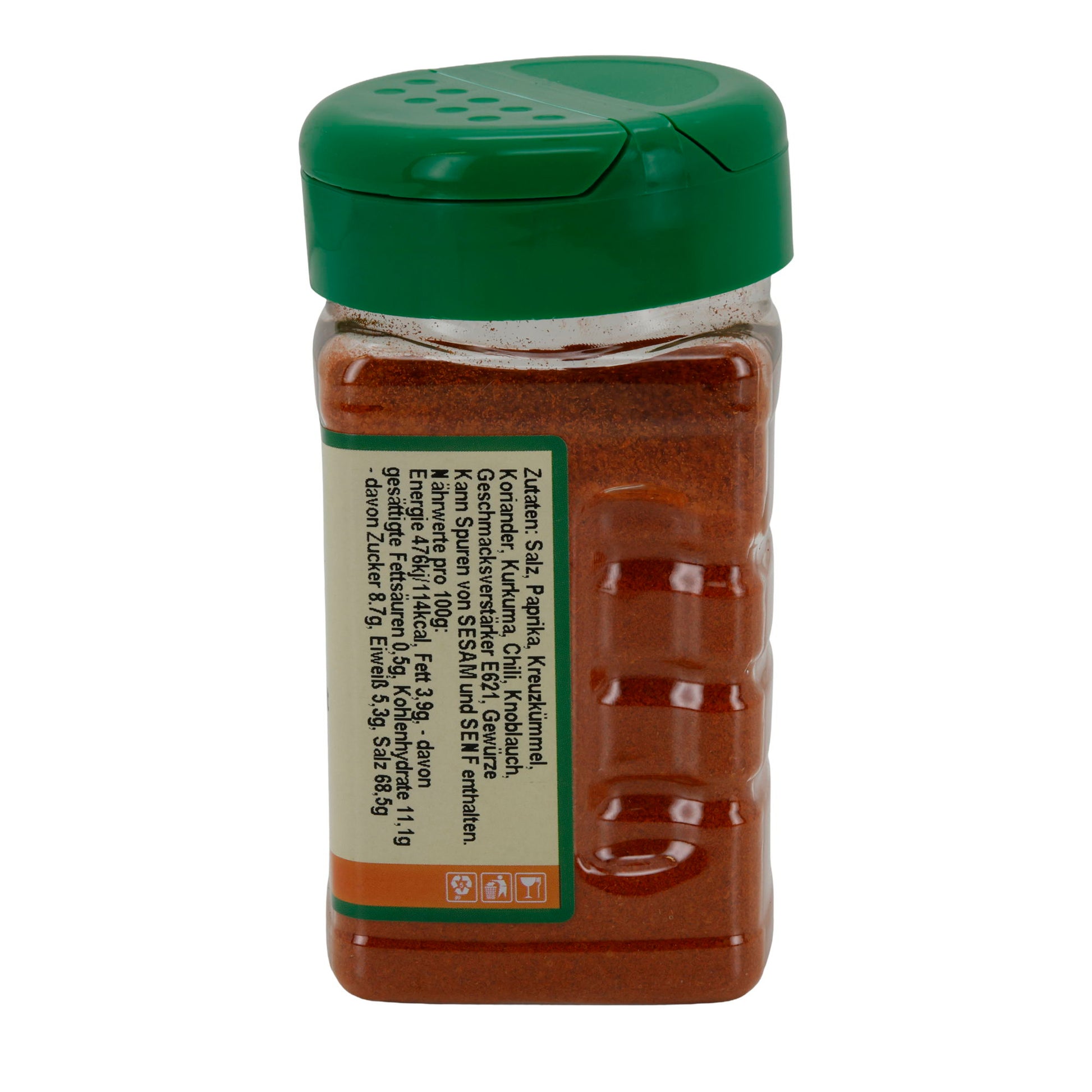 "Salz, Paprika, Kreuzkümmel, Koriander, Kurkuma, Chili, Knoblauch. Kann Spuren von SESAM und SENF enthalten."
