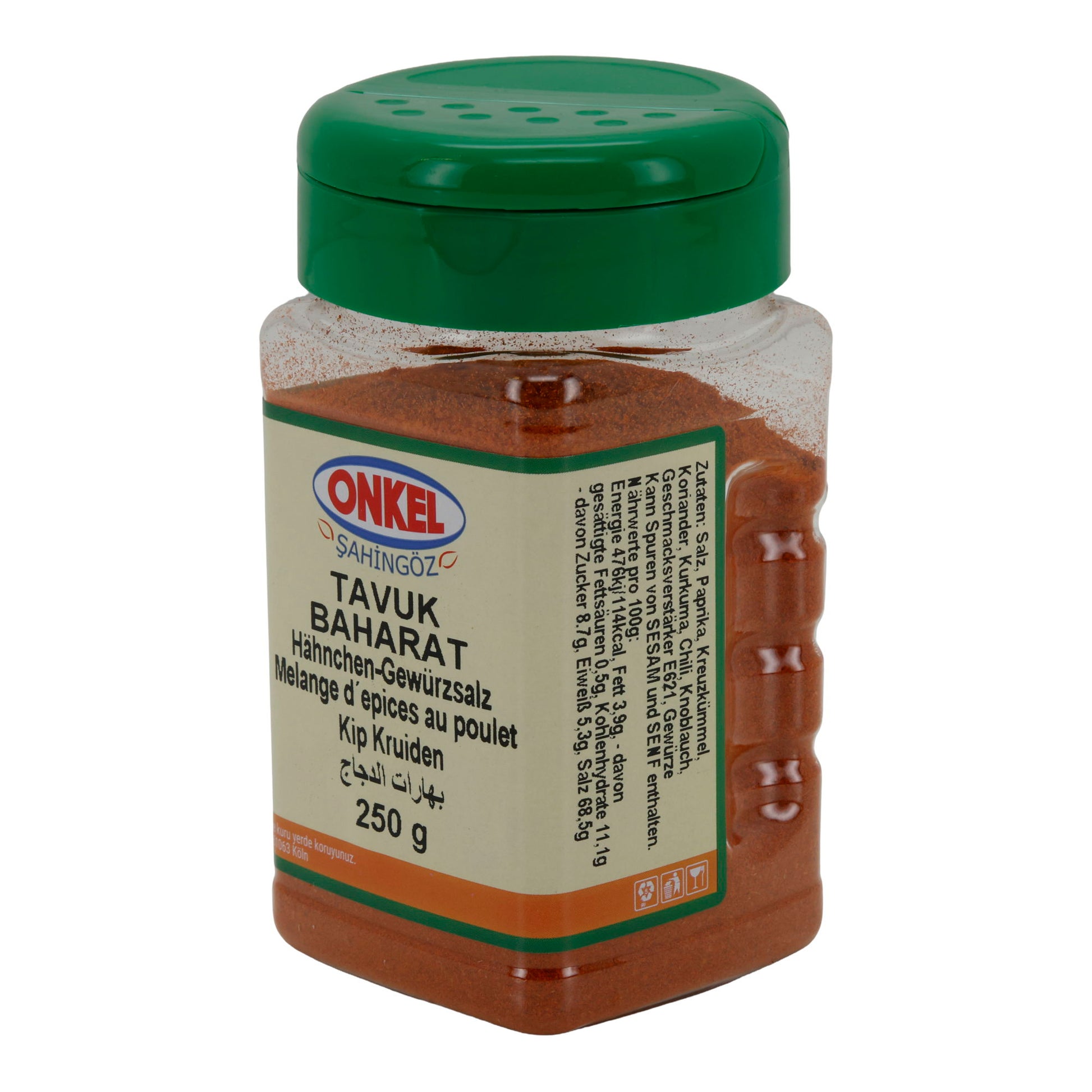 Das Hähnchen-Gewürzsalz „Tavuk Baharat“ von Onkel Şahingöz ist eine kräftige, <strong>aromatisch</strong>e Gewürzmischung, die speziell zur Ver<strong>feine</strong>rung von Geflügelgerichten entwickelt wurde. Die Kombination aus Paprika, Kreuzkümmel, Koriander und weiteren Gewürzen sorgt für ein würziges, herzhaftes Aroma. Ideal für gebratenes, gegrilltes oder geschmortes Hähnchen.