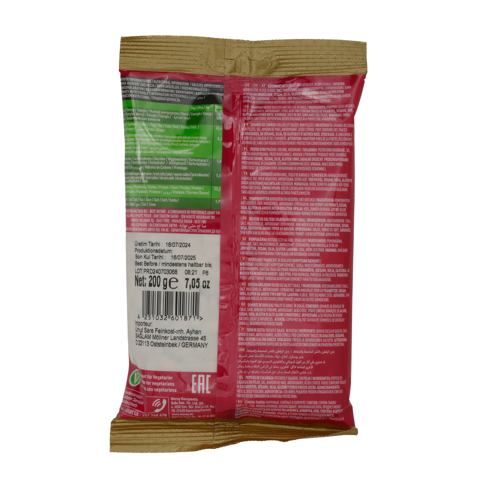 Kerne Meray Kürbiskerne Trakya zeichnen sich durch ihre Herkunft aus der Region Thrakien in der Türkei aus, bekannt für fruchtbare Böden und hochwertige Kürbiskerne. Sie werden traditionell geröstet und leicht gesalzen, um das nussige Aroma zu betonen.