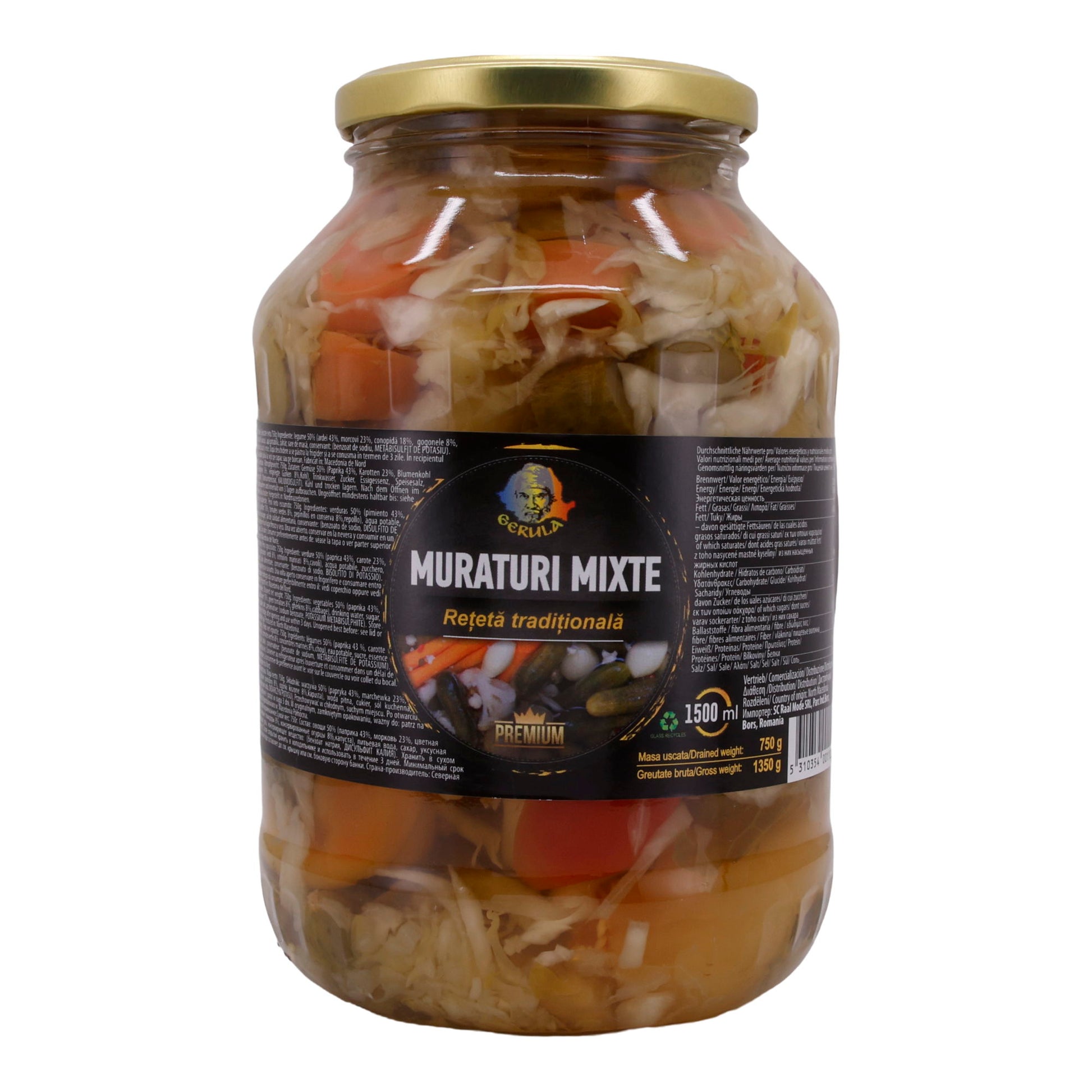 Muraturi Mixte Gerula ist eine traditionelle rumänische Gemüsemischung, die ohne künstliche Zusätze eingelegt wird. Sie enthält eine ausgewogene Mischung aus Weißkohl, Karotten, grünen Tomaten, Gurken und Paprika.