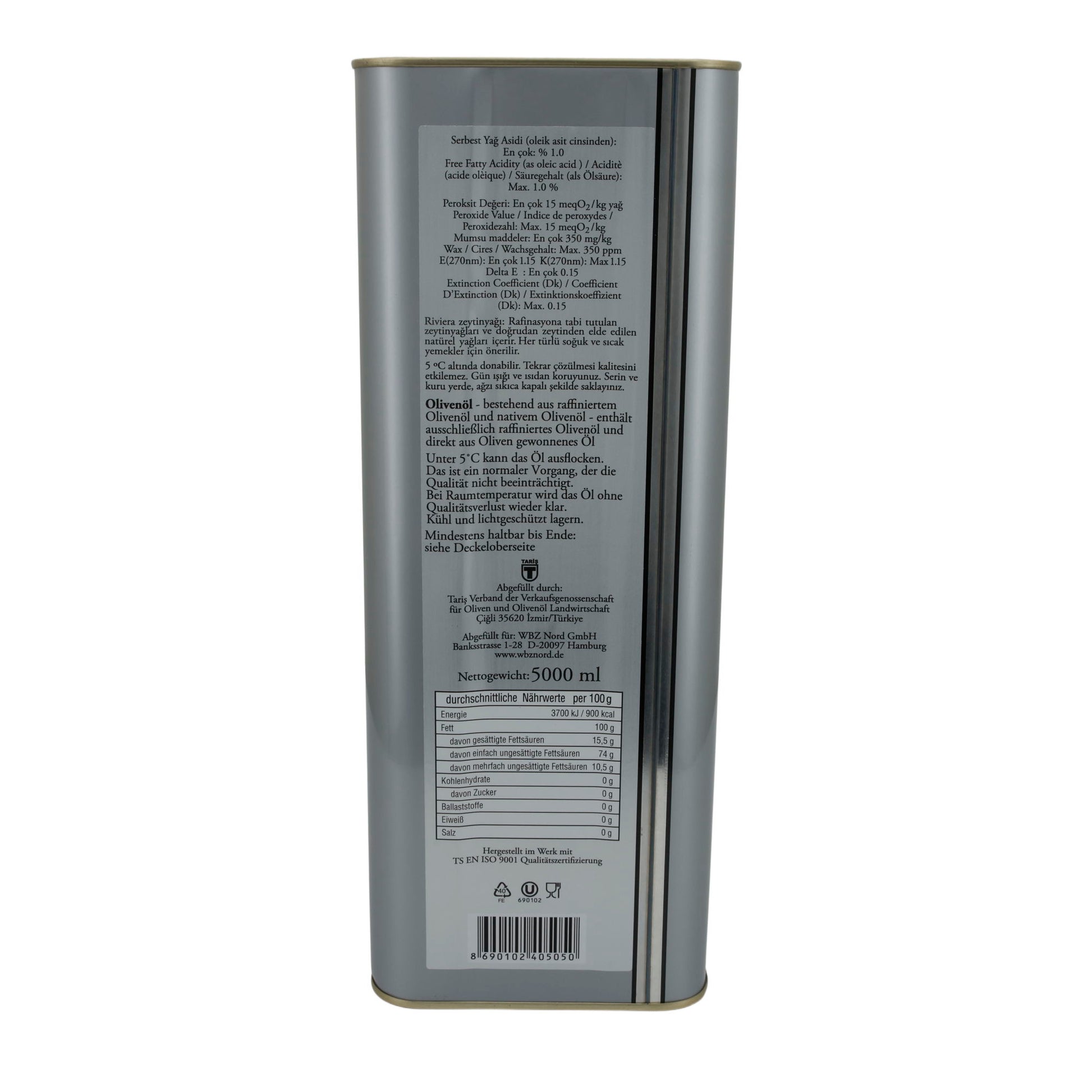Taris Riviera Olivenöl ist eine Mischung aus raffiniertem und nativem Olivenöl mit einem maximalen Säuregehalt von 1,0 %. Es bietet eine milde Geschmacksnote und eine helle Farbe, ideal für vielseitige Anwendungen in der Küche.