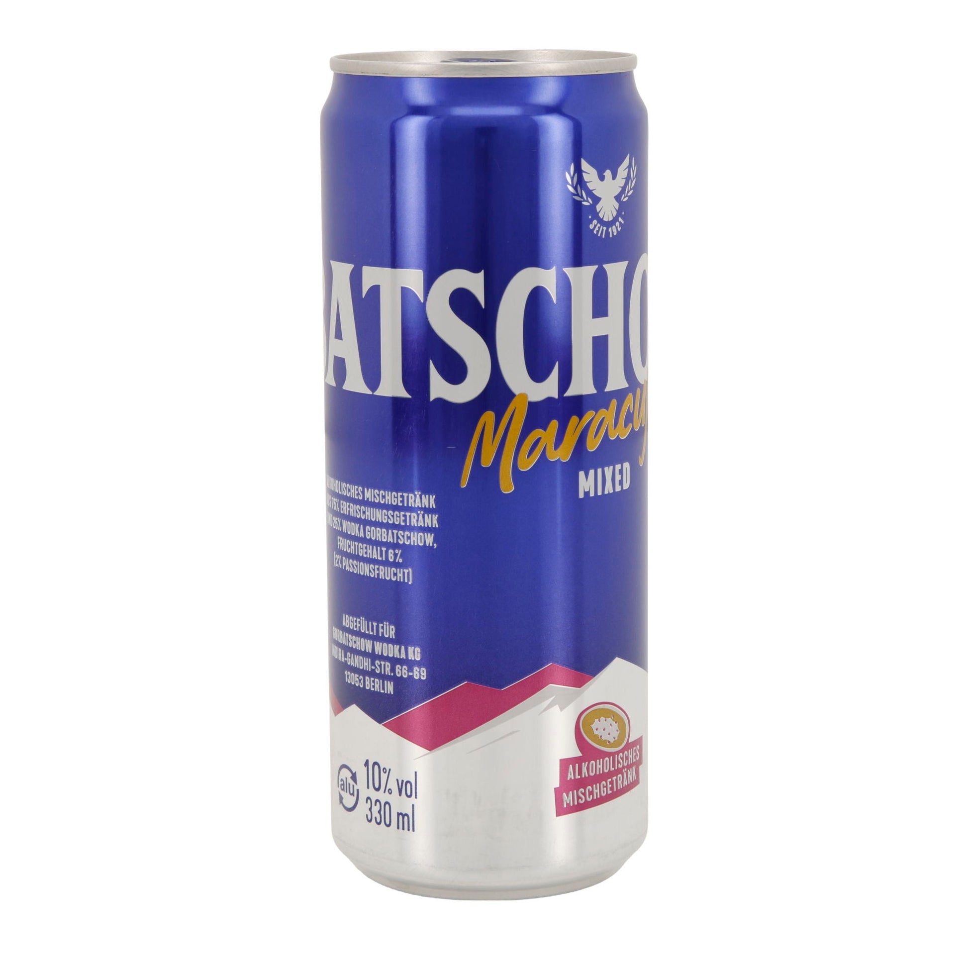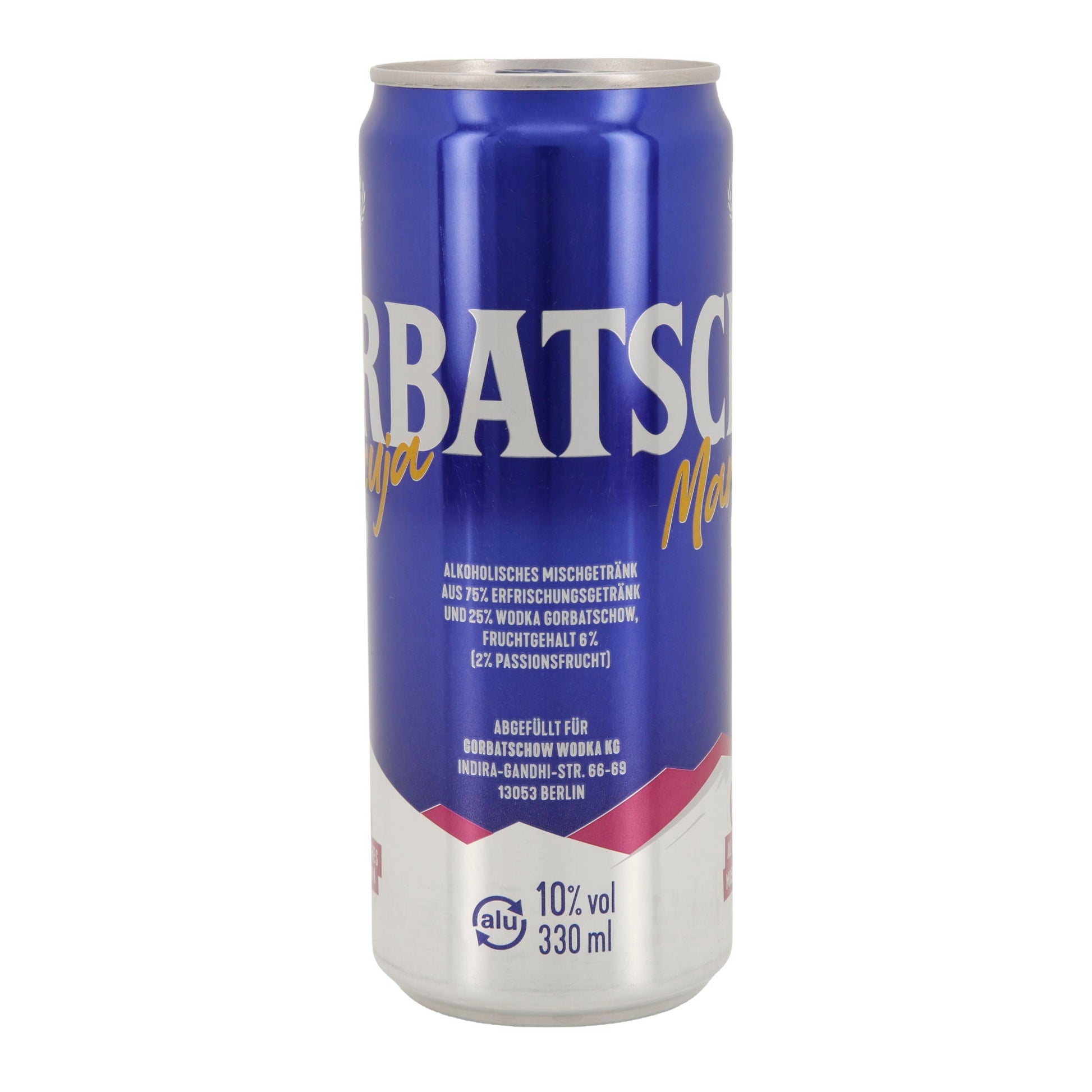 Gorbatschow Maracuja Mixed ist ein intensives, fruchtiges Mischgetränk mit 10 % Alkoholgehalt. Es vereint 25 % Wodka Gorbatschow mit 75 % Erfrischungsgetränk und einem Fruchtgehalt von 6 % (davon 2 % Passionsfrucht). Die tropische Maracuja-Note sorgt für ein erfrischend süßes Geschmackserlebnis – ideal für Partys, Sommerabende oder unterwegs. Praktisch verpackt in der stylischen 0,33 l Aluminiumdose.