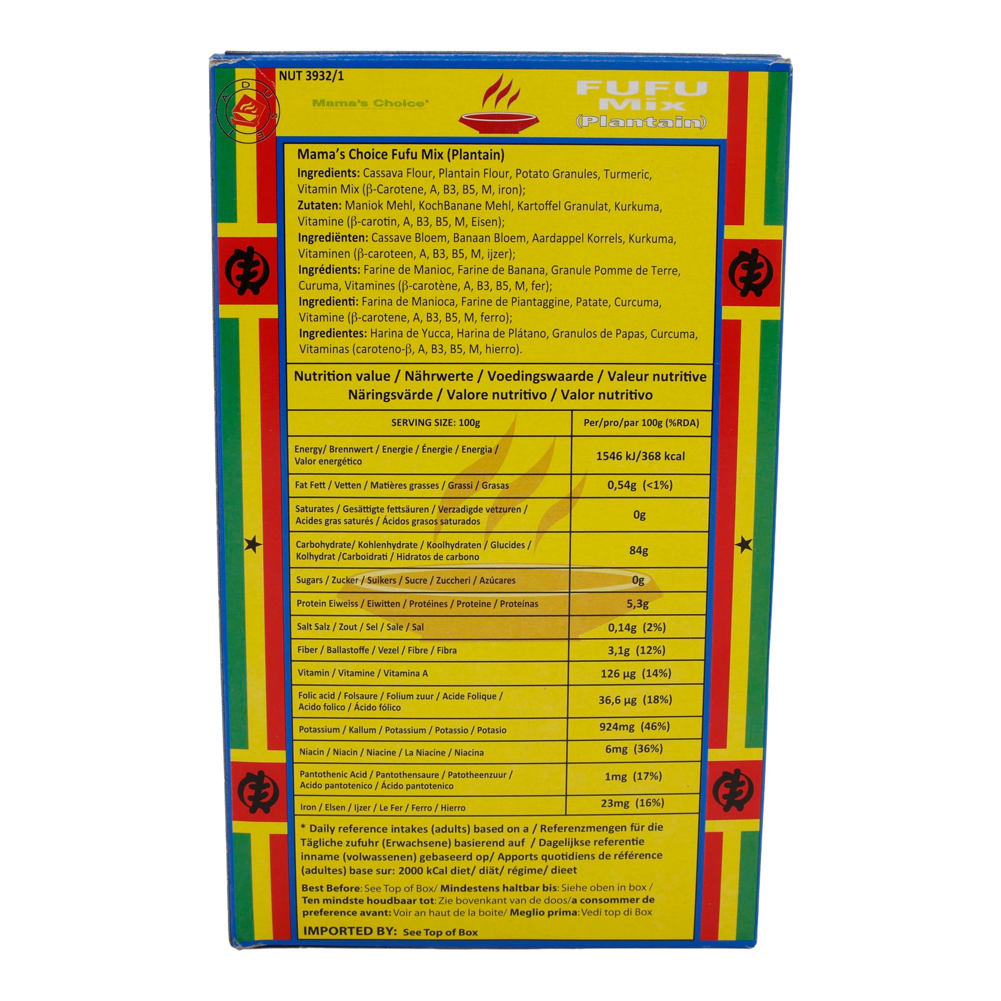 Mama's Choice Plantain Fufu Mix ist besonders, weil es aus angereichertem Kochbananenmehl besteht und glutenfrei ist. Es enthält zudem Maniokmehl, Kartoffelgranulat, Kurkuma und einen Vitaminmix, der wichtige Nährstoffe wie Beta-Carotin und B-Vitamine liefert.