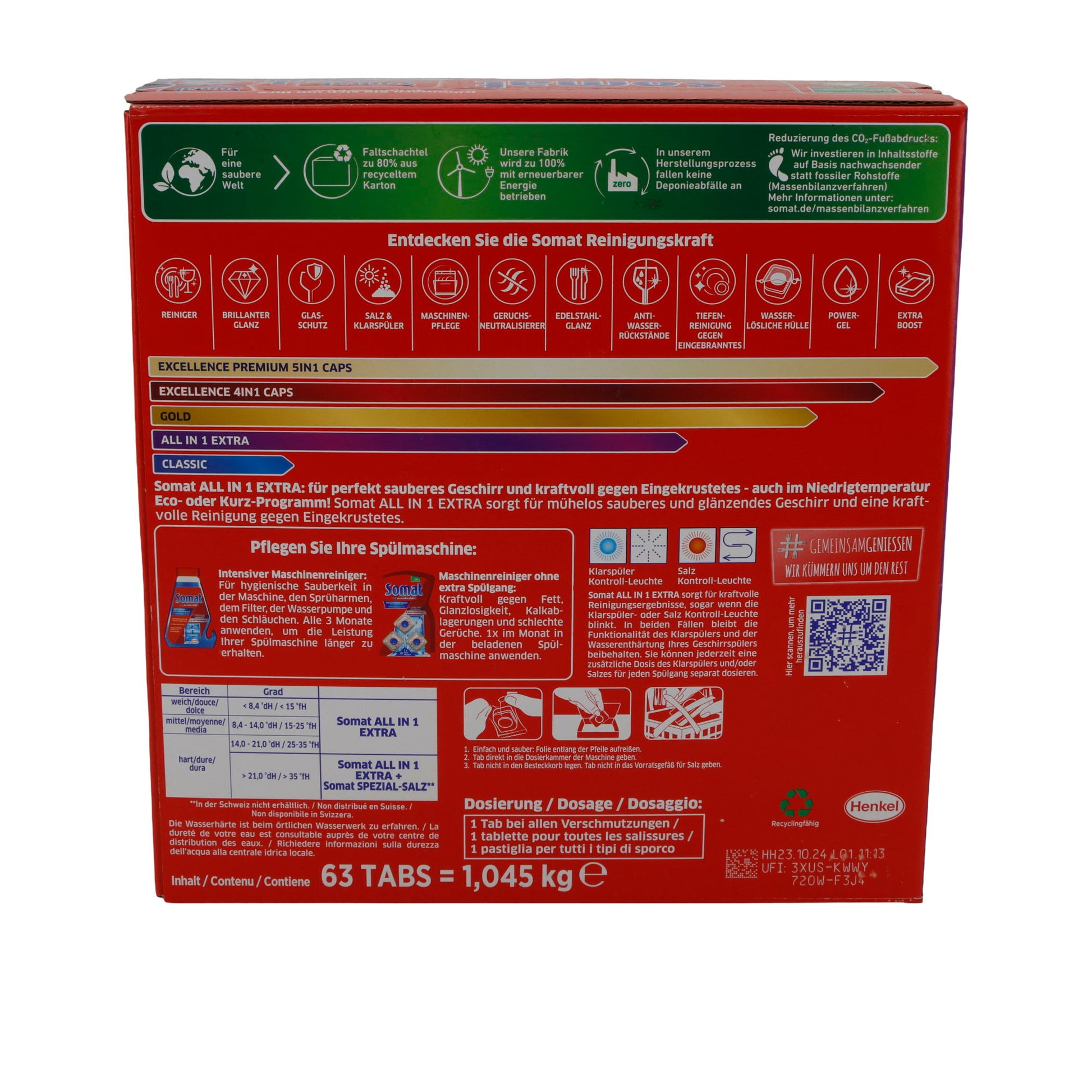 Geschirrspültabs Somat | All in 1 Extra | Kraftvoll gegen Eingebranntes | 63 Stück bietet eine effiziente Reinigung für Ihr Geschirr.