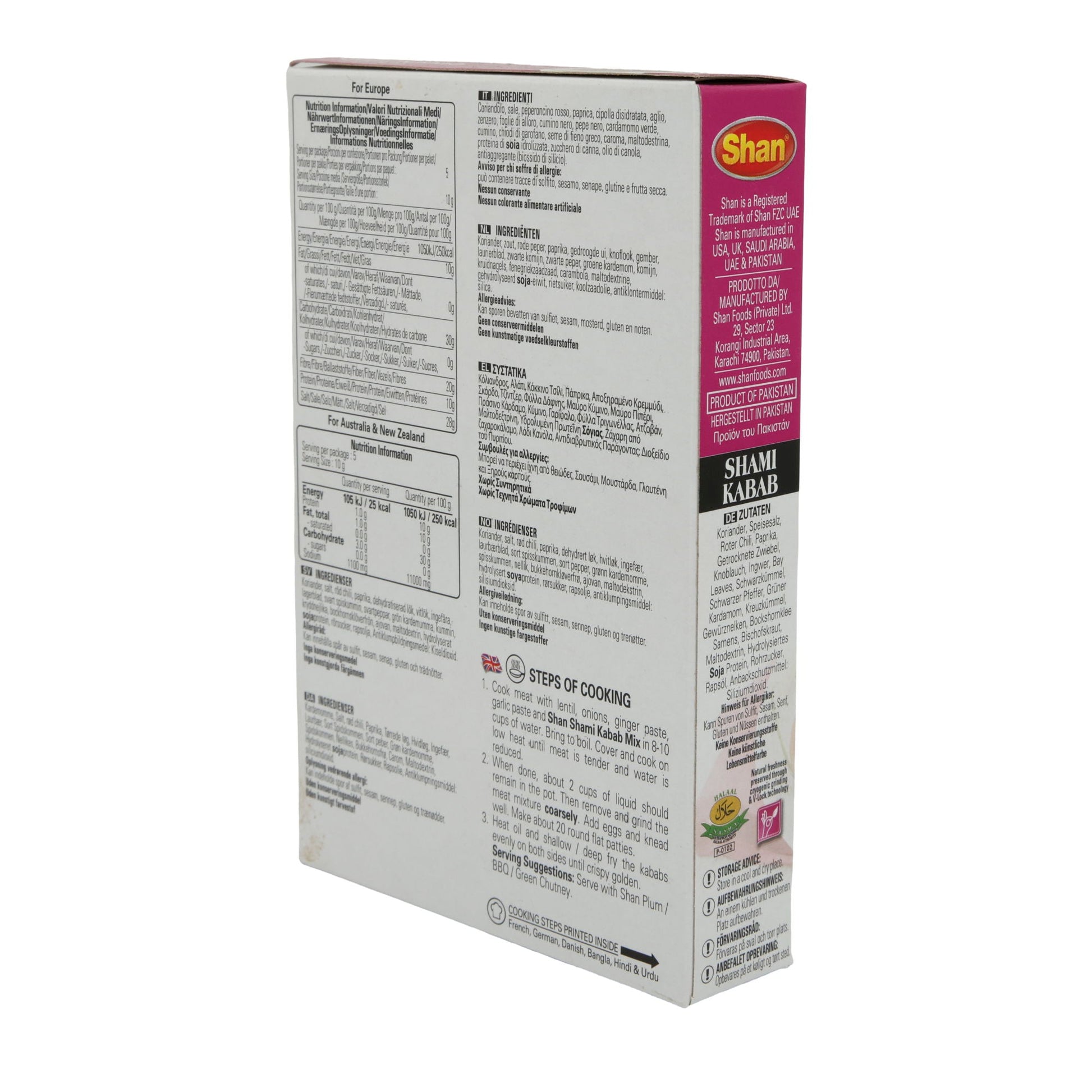 Die Shan Shami Kabab Gewürzmischung wird verwendet, um traditionelle Fleisch- und Linsenpatties, bekannt als Shami Kabab, zuzubereiten. Mischen Sie 1 kg Hackfleisch, 200 g Chana Dal, 250 g Zwiebeln, 2 EL Knoblauchpaste, 1 EL Ingwerpaste und 1 Packung Gewürzmischung mit 8–10 Tassen Wasser. Kochen Sie bei geringer Hitze, bis das Fleisch zart ist und das Wasser fast verdampft ist.
