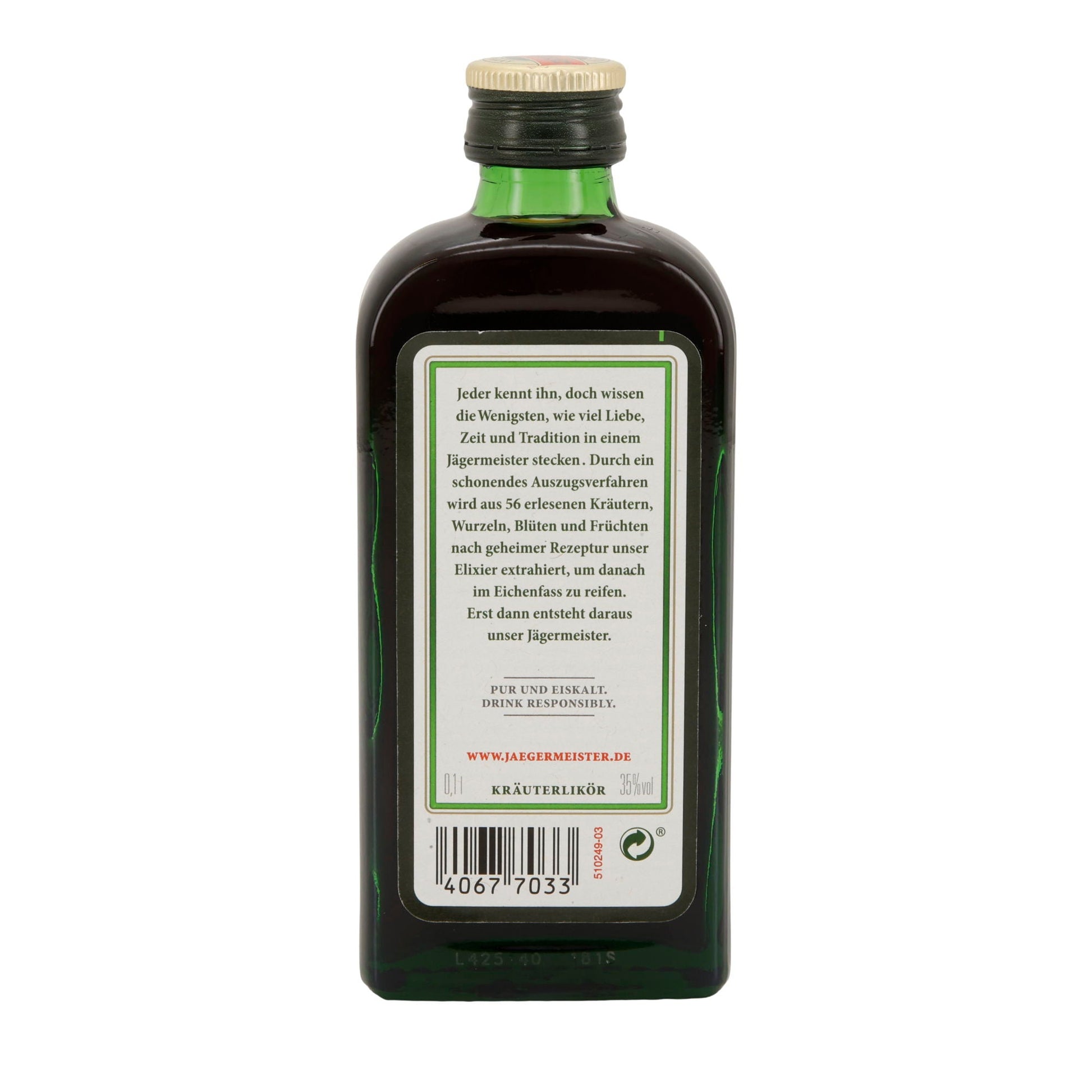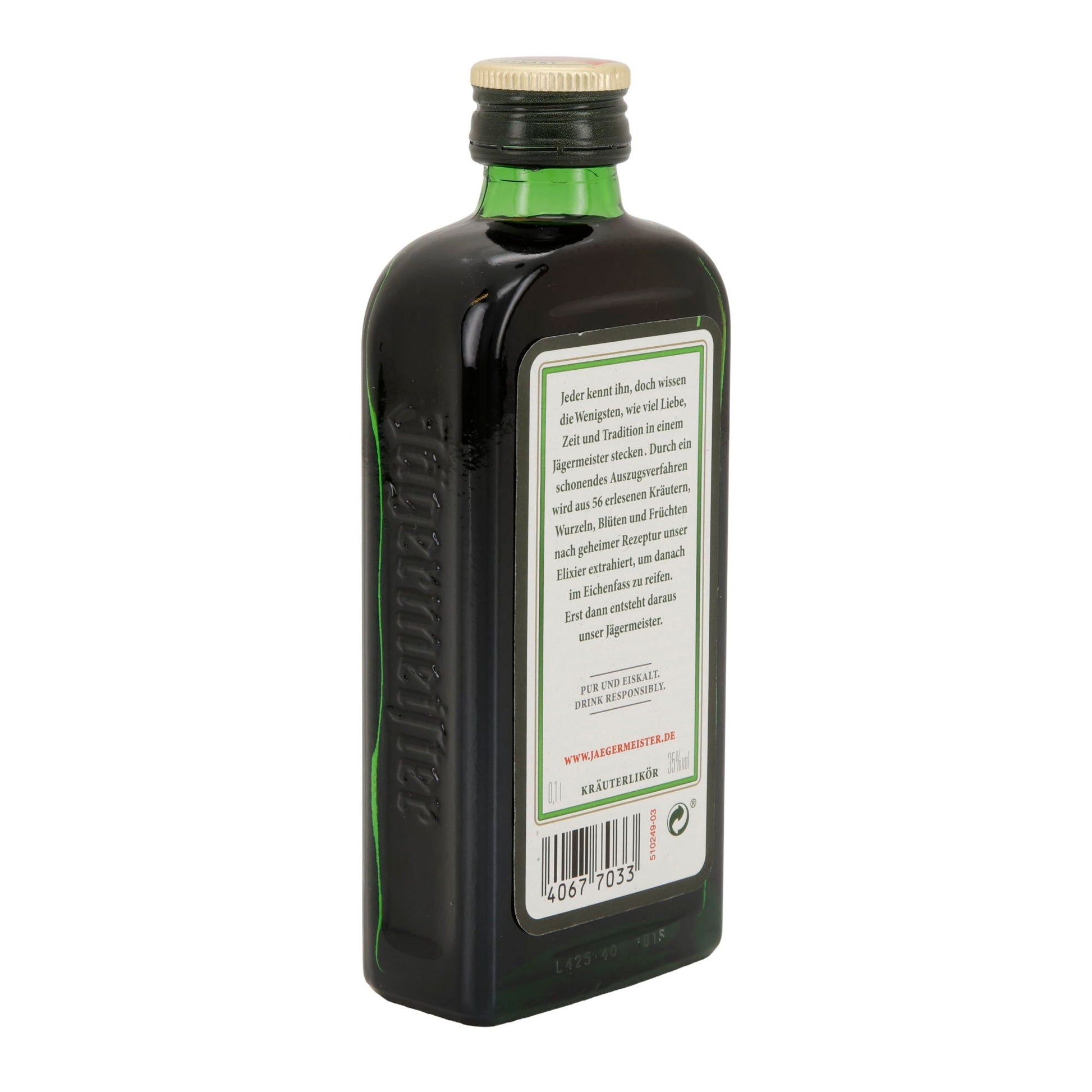 Jägermeister ist ein deutscher Kräuterlikör mit 35 % vol Alkohol, hergestellt aus einer geheimen Mischung von 56 Kräutern, Blüten, Wurzeln und Früchten. Er ist bekannt für sein charakteristisches Geschmacksprofil mit Noten von Lakritz und Anis.