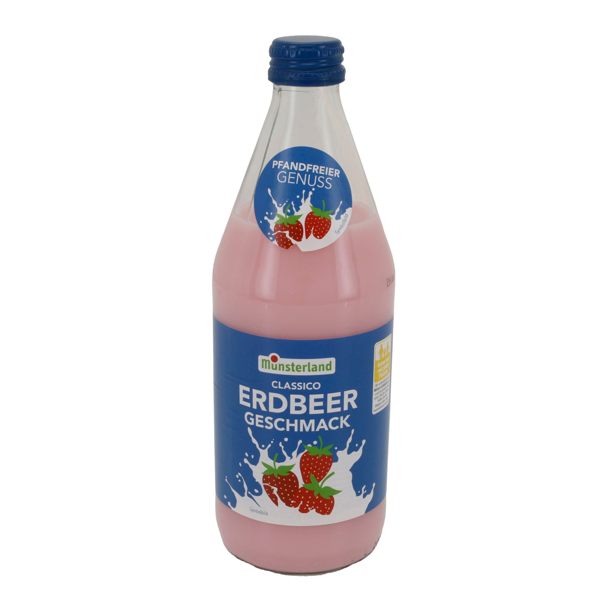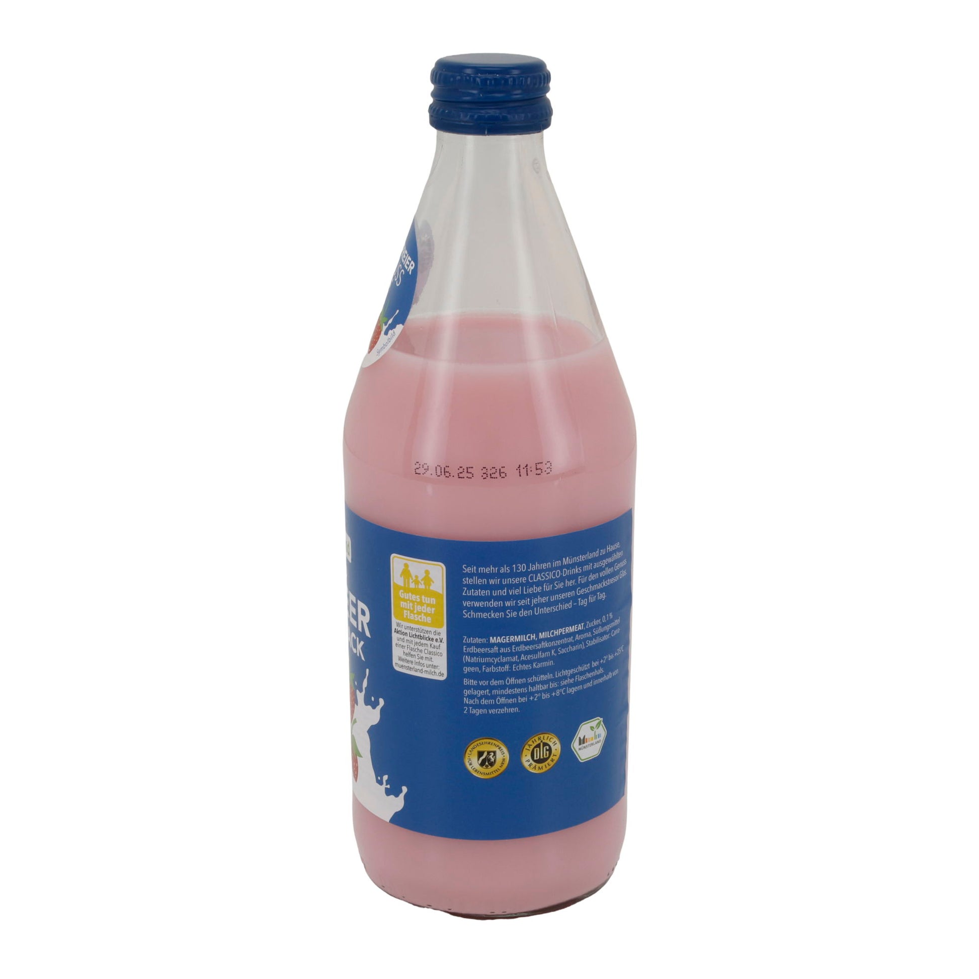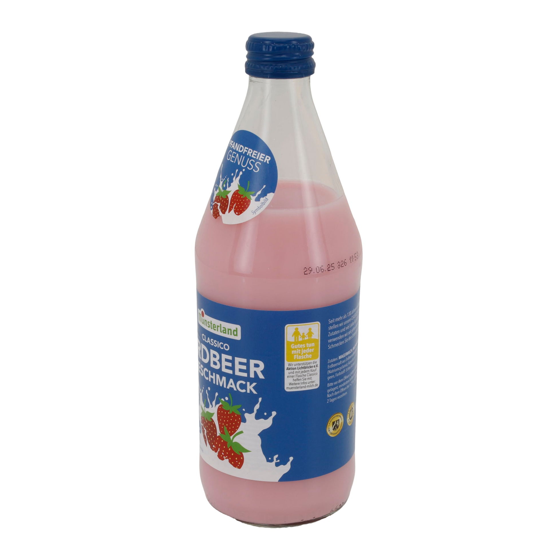 Milchmischgetränk Münsterland Classico Erdbeergeschmack liefert fruchtigen Genuss in jeder 500 ml Glasflasche.