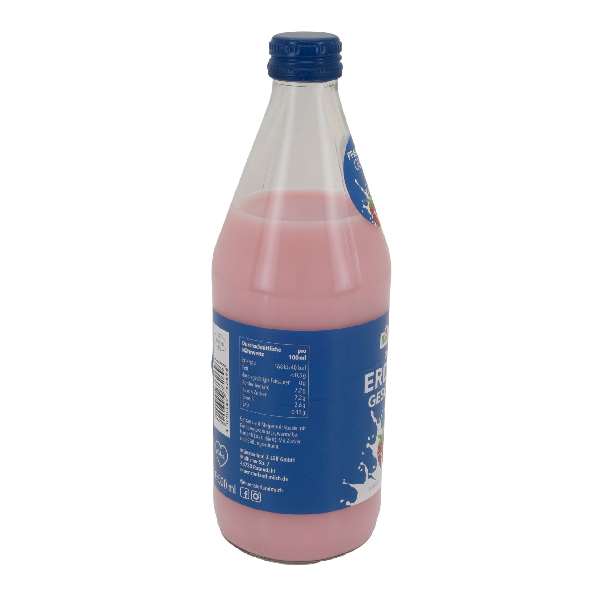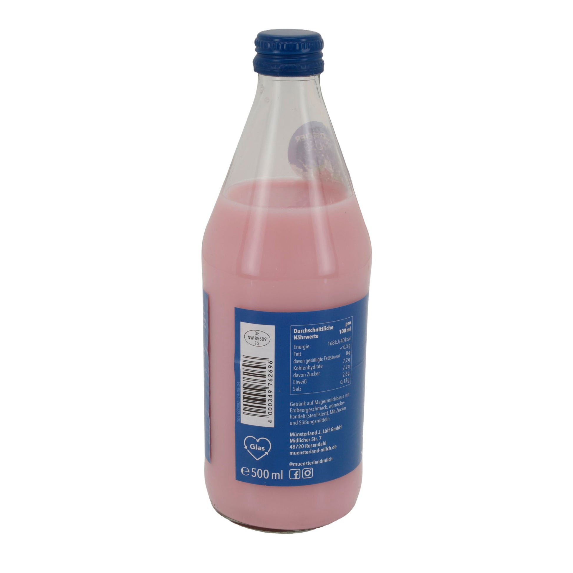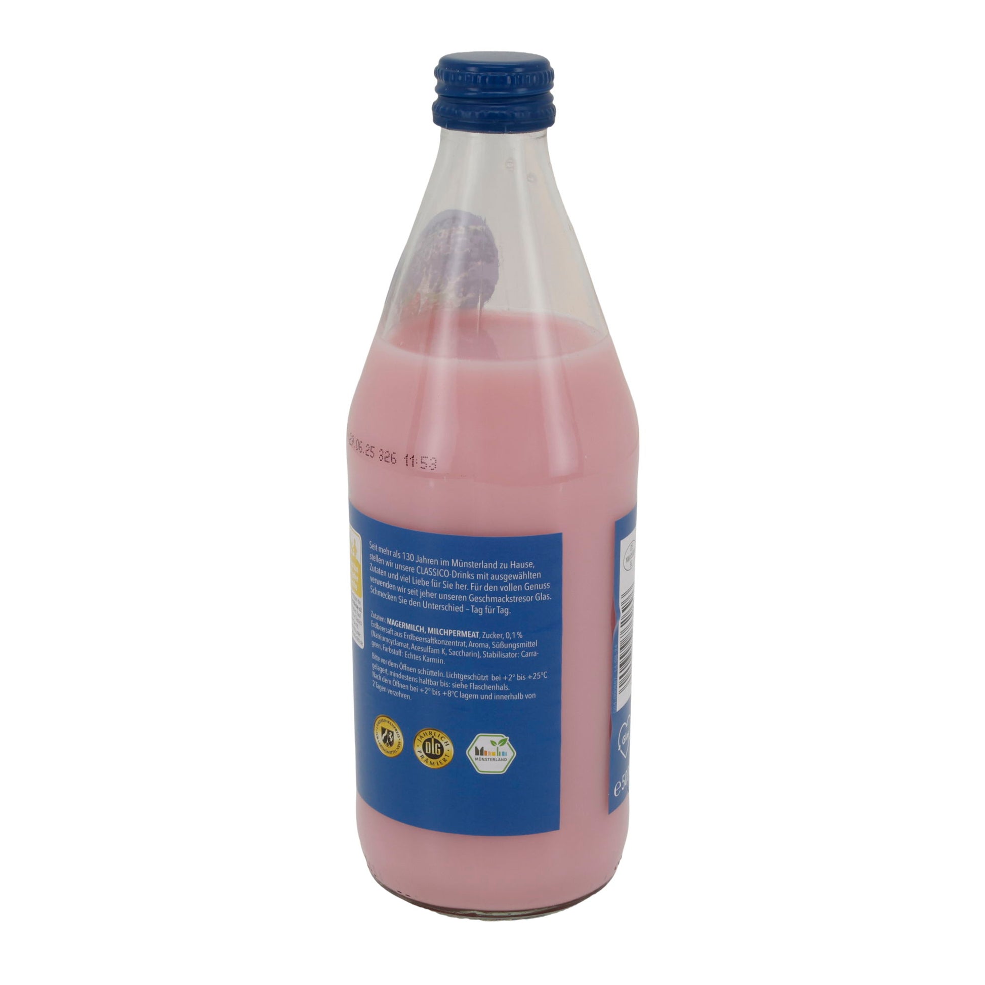 Milchmischgetränk Münsterland Classico Erdbeergeschmack liefert fruchtigen Genuss in jeder 500 ml Glasflasche.