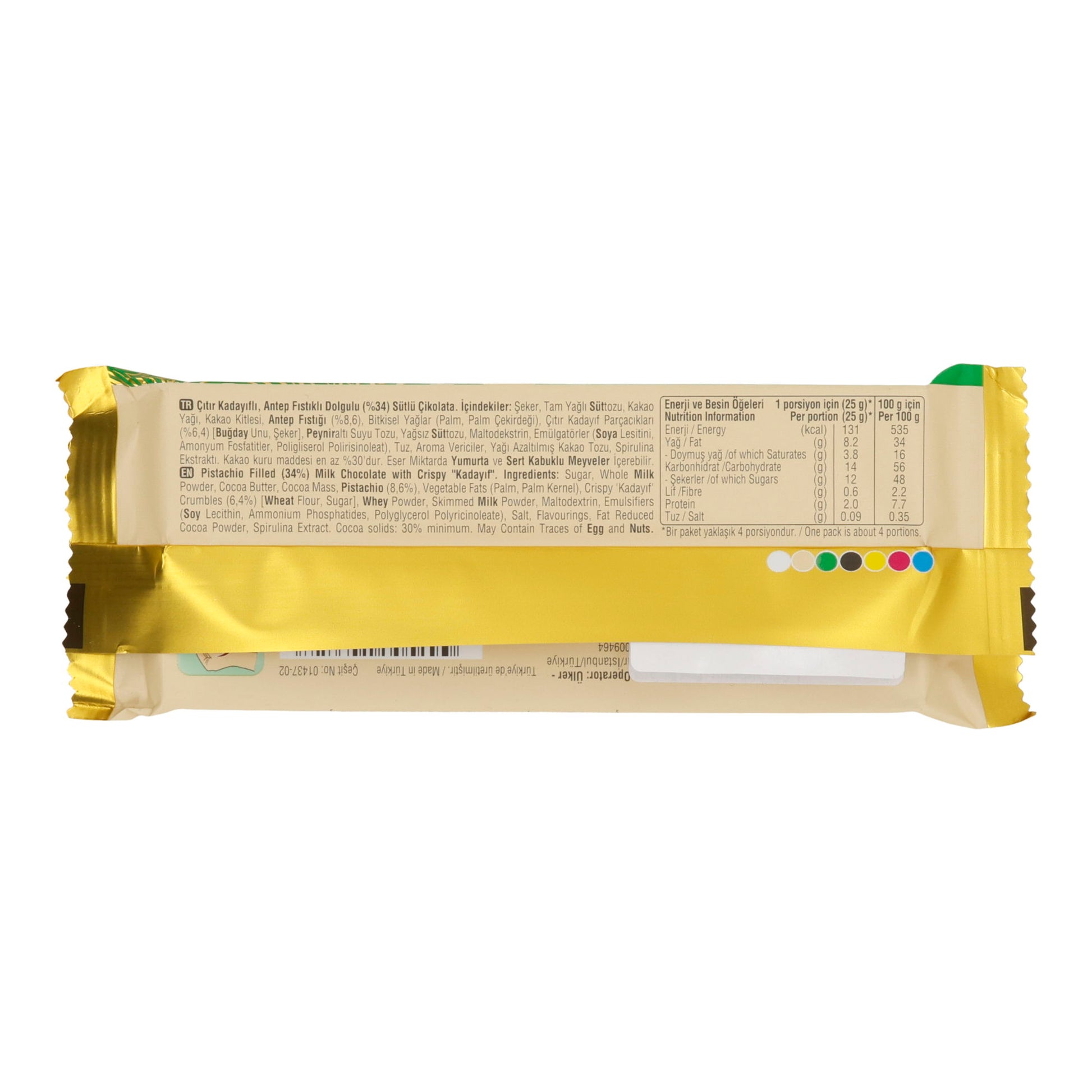 Zucker, Vollmilchpulver, Kakaobutter, Kakaomasse, Pistazien (6 %), pflanzliche Fette (Palm, Palmkerne), knuspriger Kadayif (6,4 %) [Weizenmehl, Zucker, Molkepulver, Magermilchpulver, Backtriebmittel (Natriumhydrogencarbonat), Speisesalz, Aromen, Farbstoff (Spirulinaextrakt)], Molkenpulver, Emulgatoren (Sojalecithin, Ammoniumphosphatide, Polyglycerin-Polyricinoleat), Speisesalz, Aromen, Kakaopulver, Farbstoff (Spirulinaextrakt).